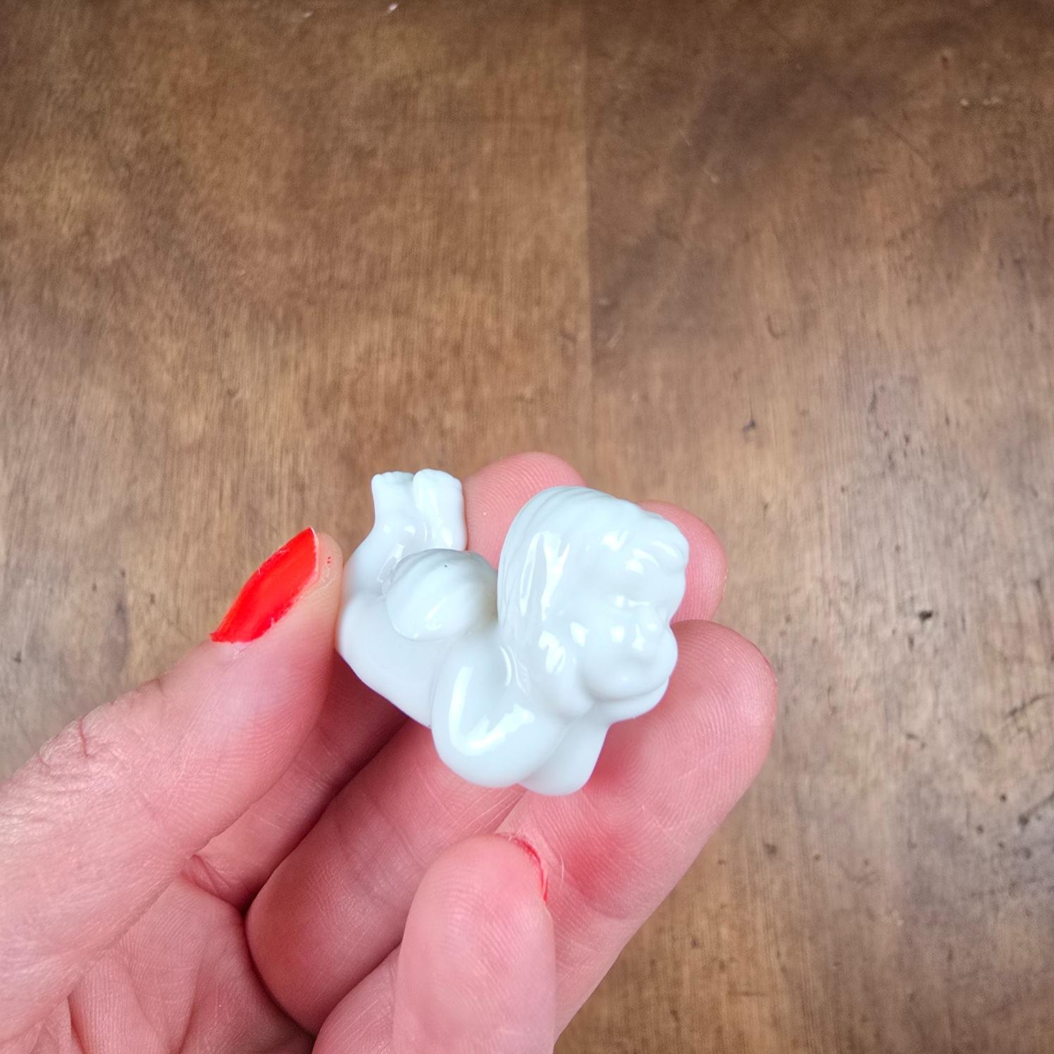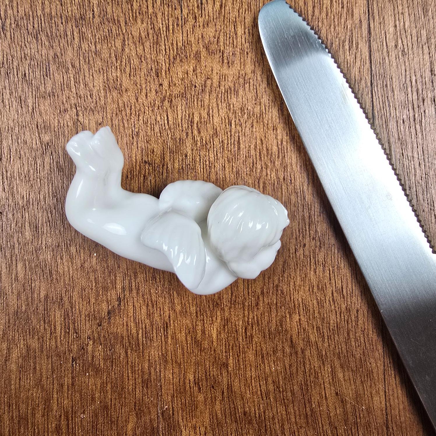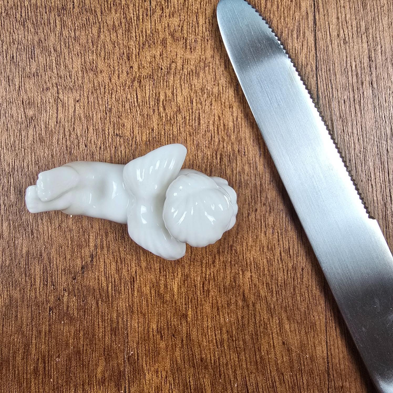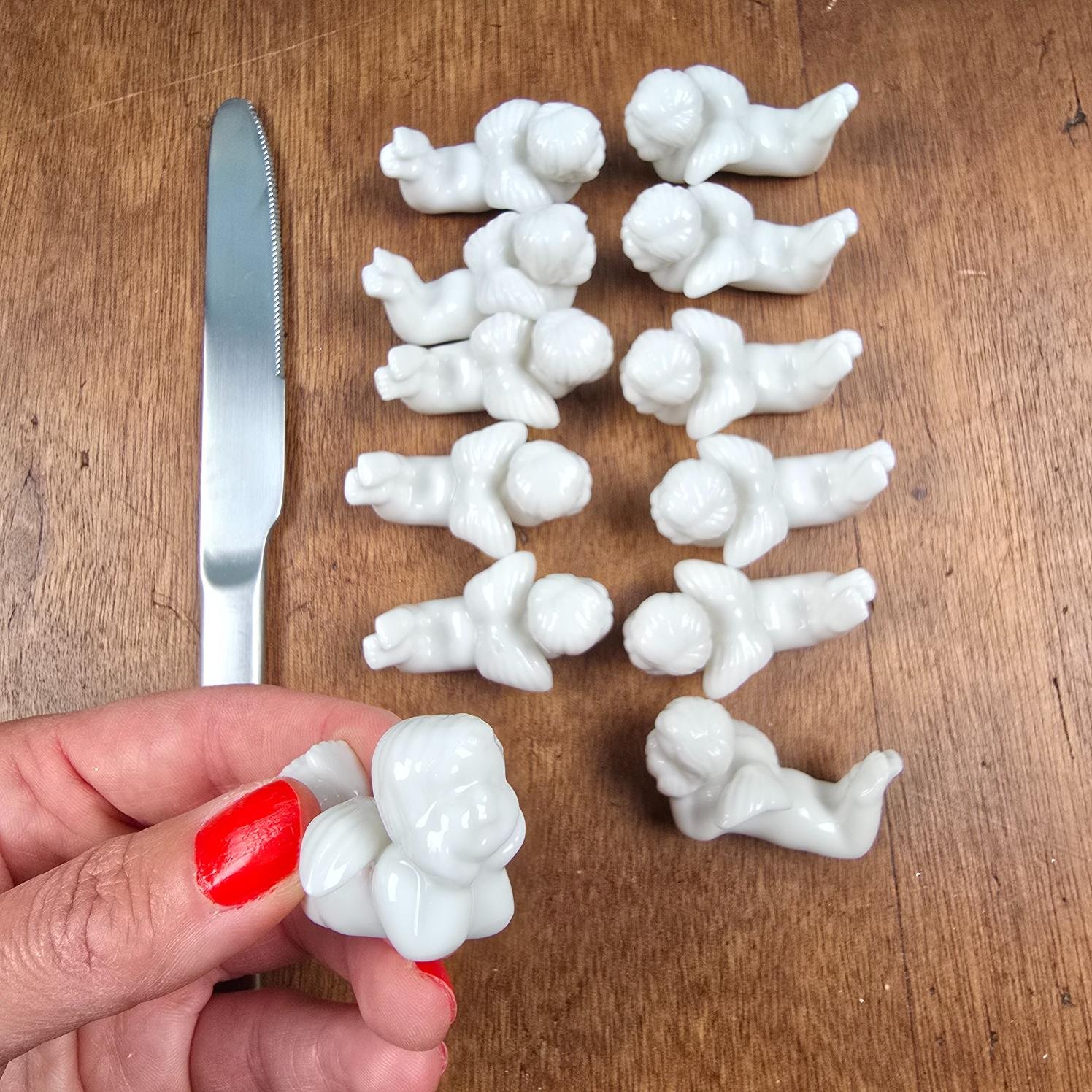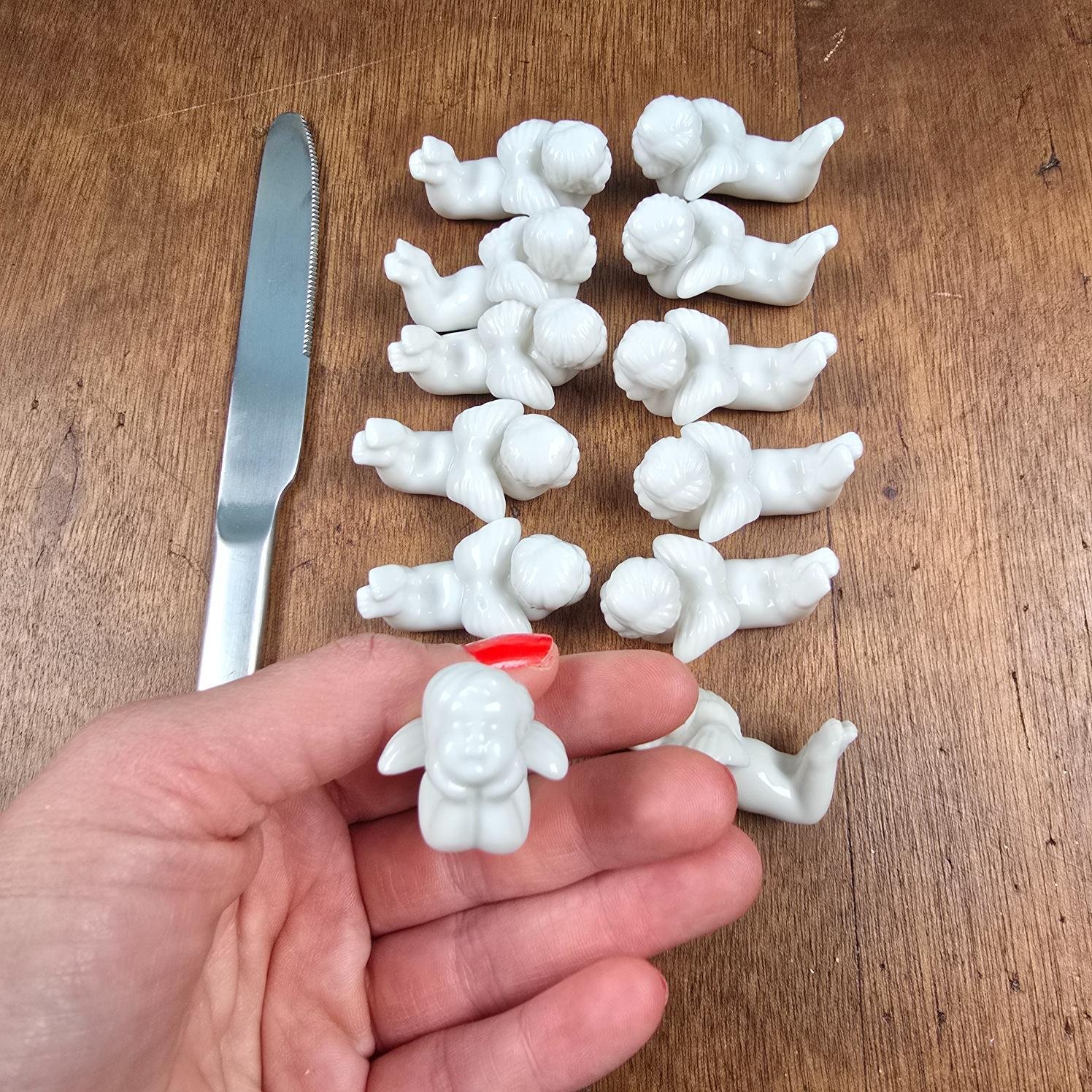 Magnifique lot de 12 repose-couteaux vintage en porcelaine blanche, en forme de petits anges allongés, les ailes déployées.