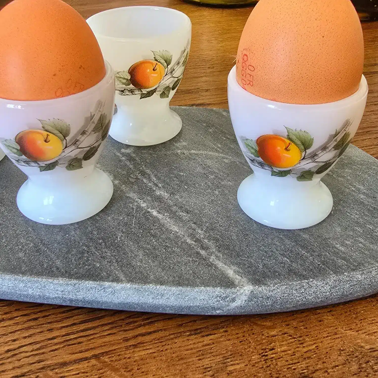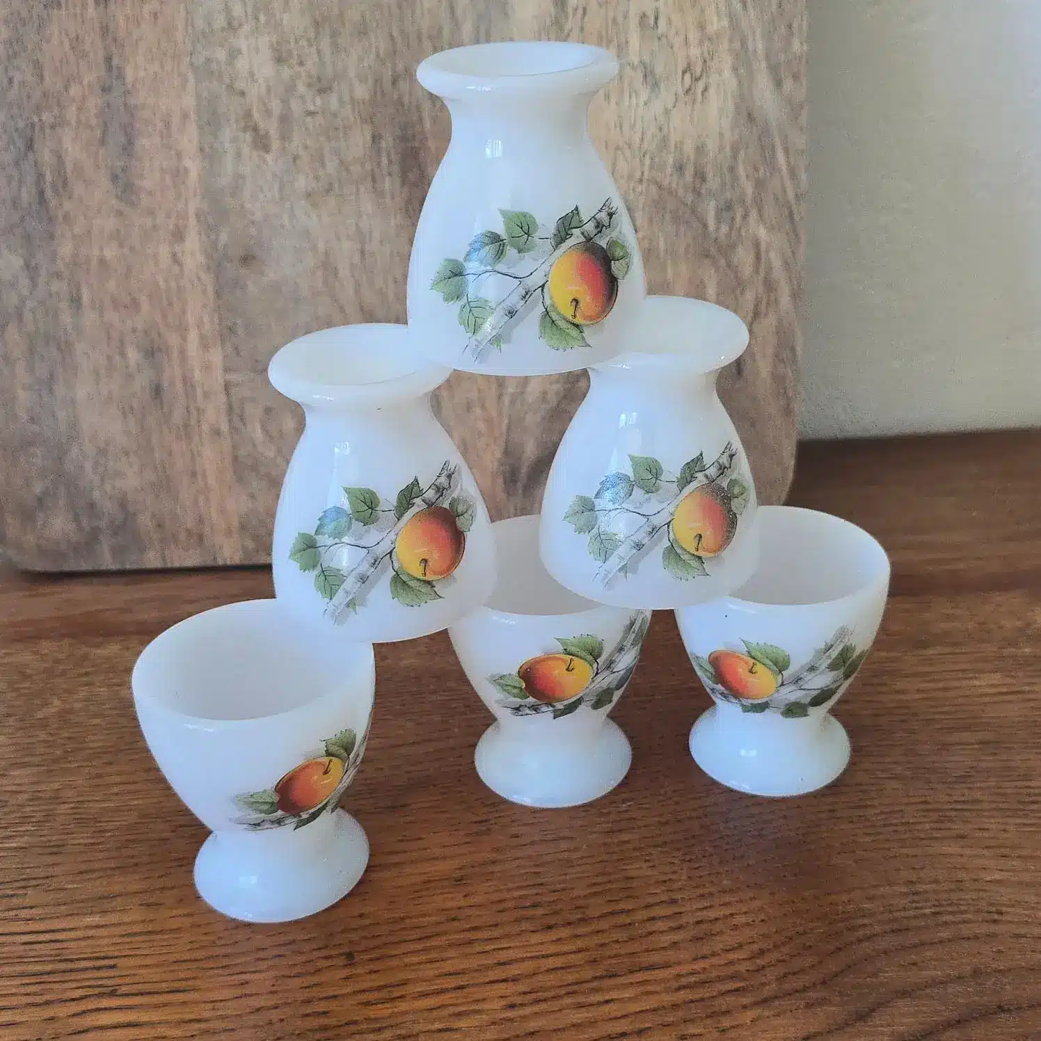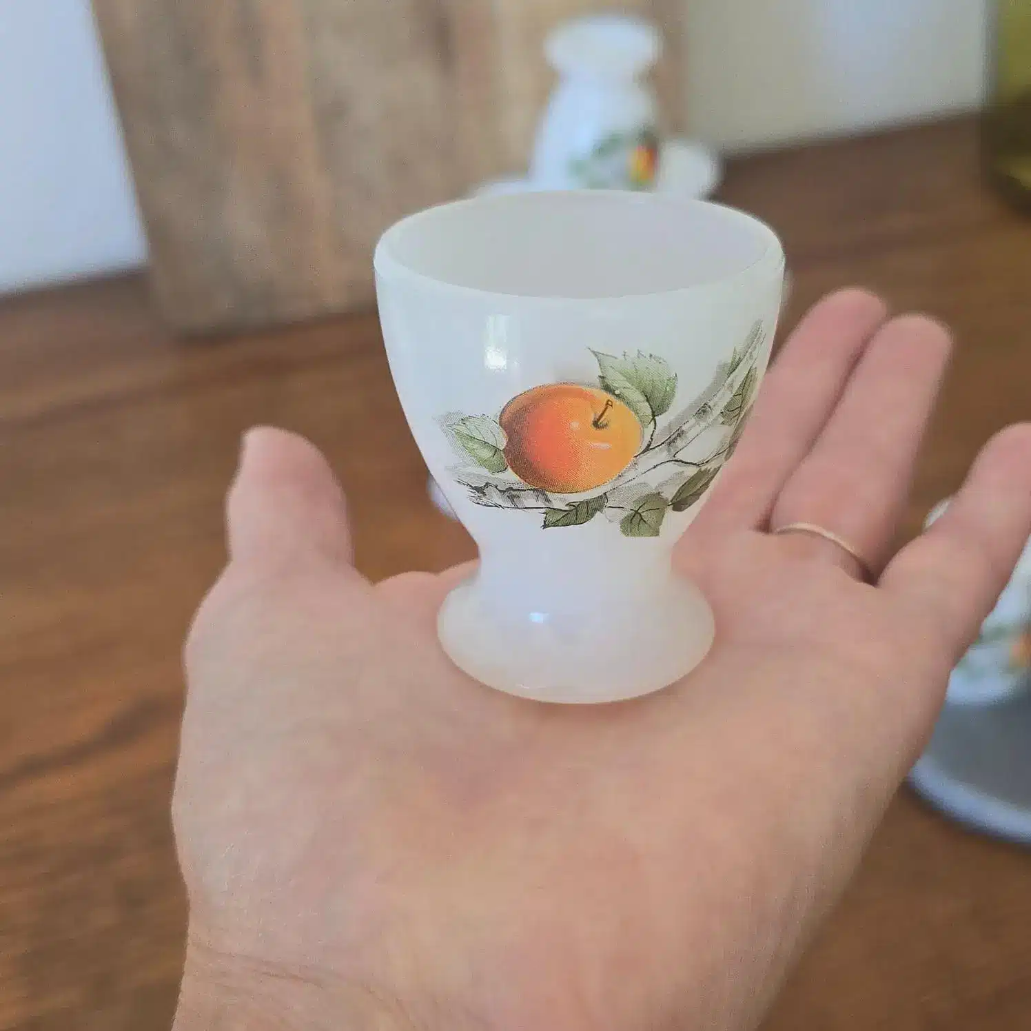 Coquetier vintage en verre opale – motif pommes – style Arcopal
