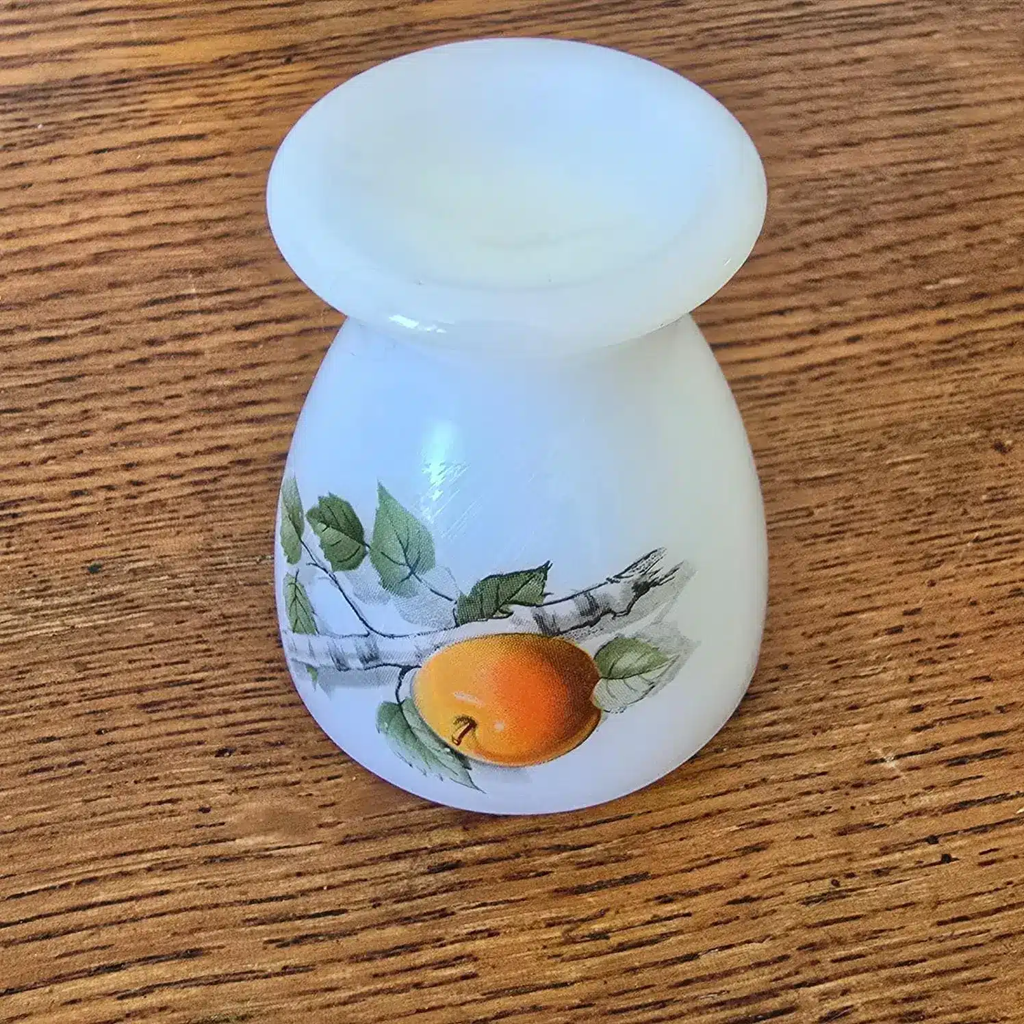 Coquetier vintage en verre opale blanc, décoré d’un motif pommes colorées.