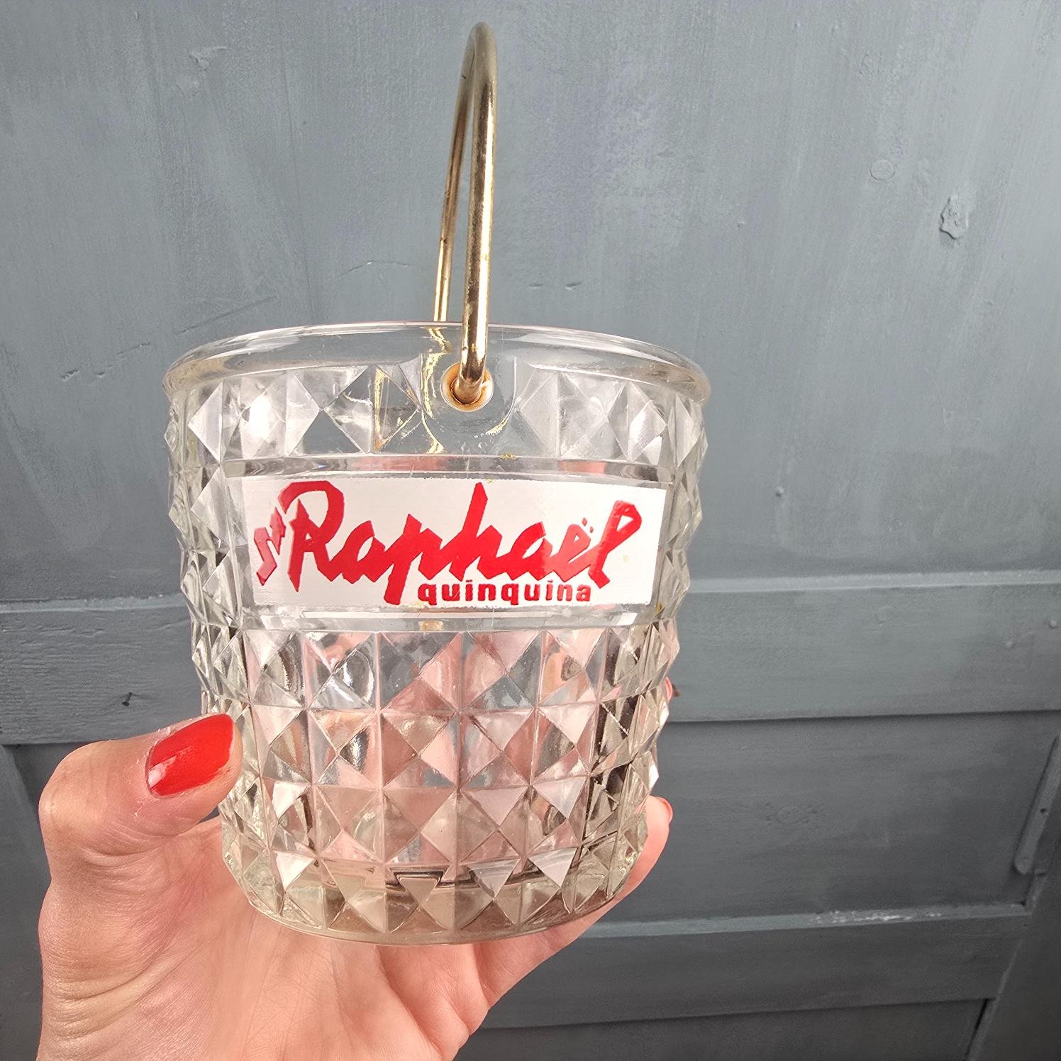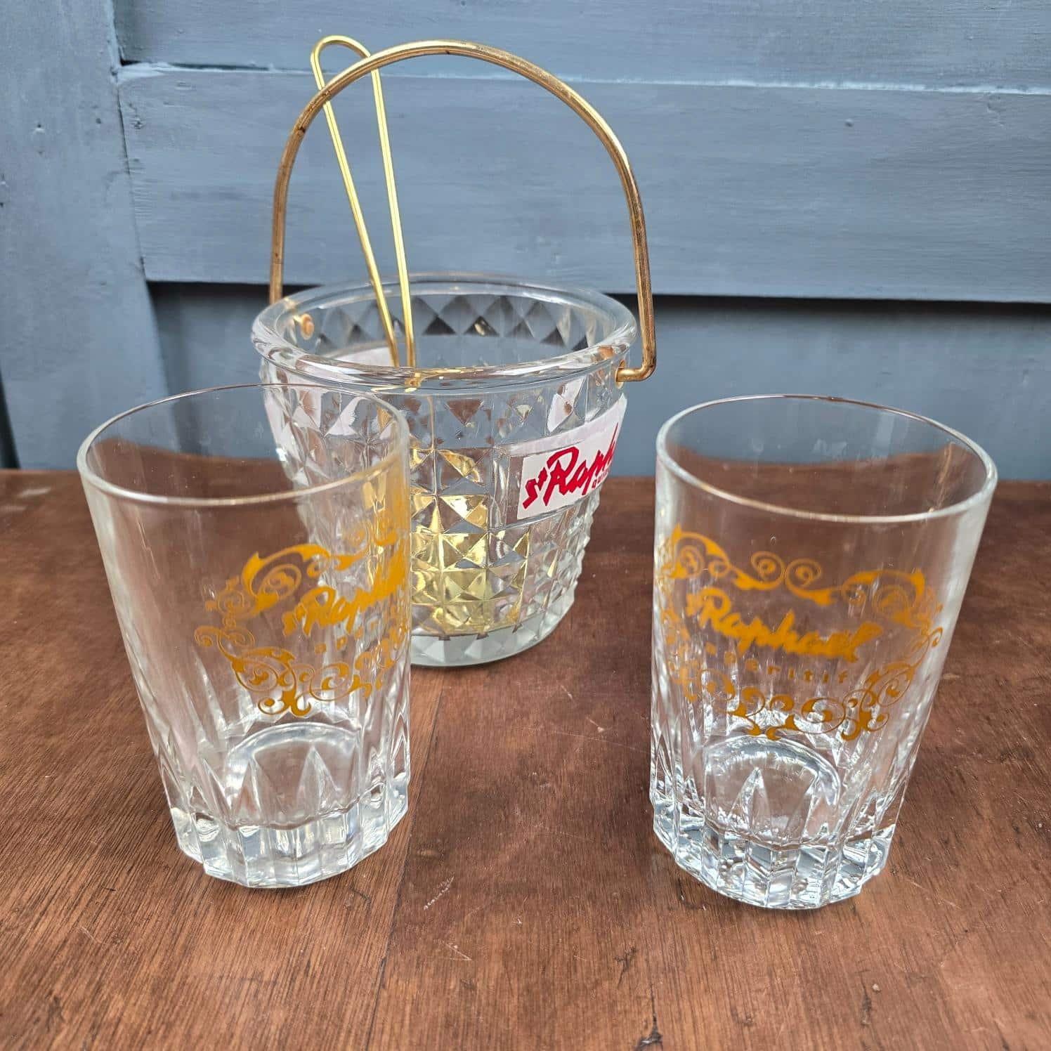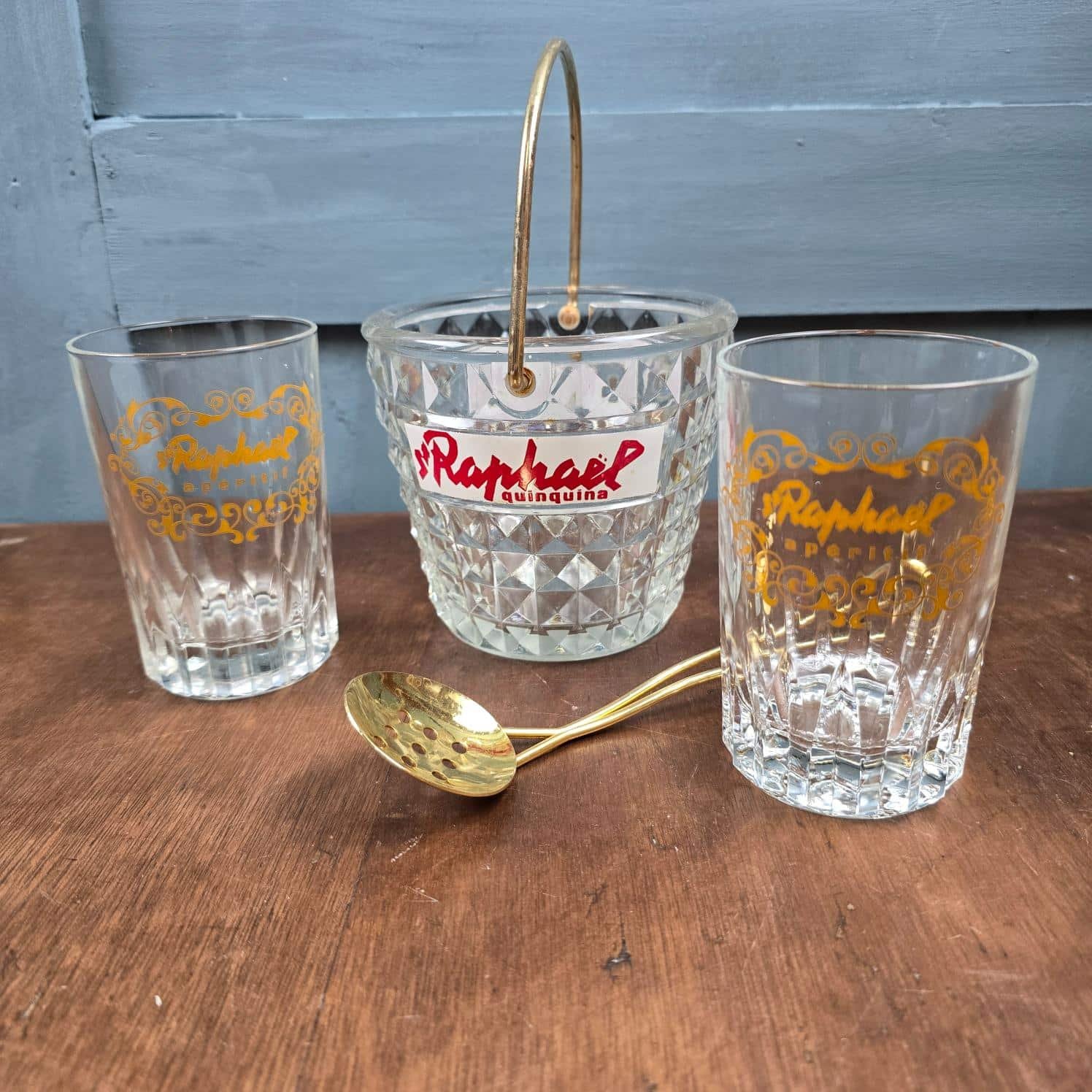 Un ensemble d’apéritif comme on n’en croise plus : un seau à glaçons en verre taillé, une cuillère en métal doré et deux verres publicitaires St Raphaël à la typographie dorée, rares à trouver aujourd’hui.