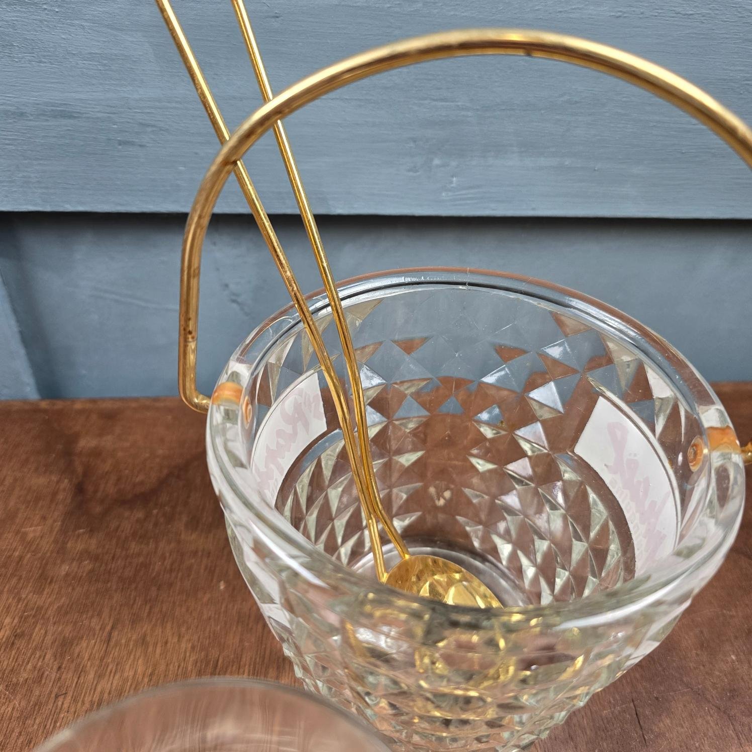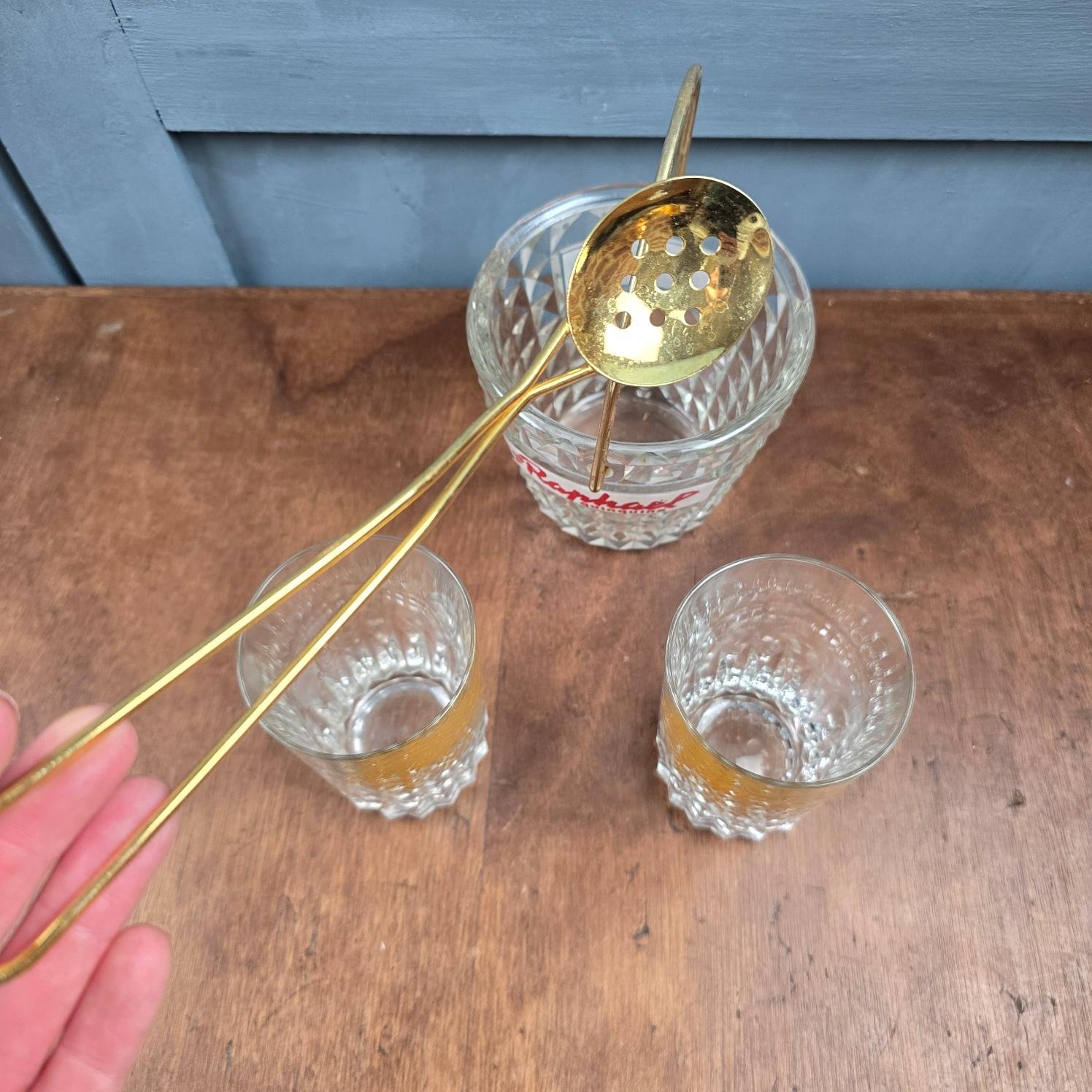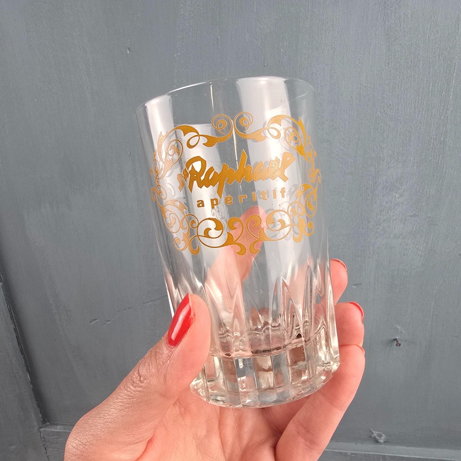 Un ensemble d’apéritif comme on n’en croise plus : un seau à glaçons en verre taillé, une cuillère en métal doré et deux verres publicitaires St Raphaël à la typographie dorée, rares à trouver aujourd’hui.