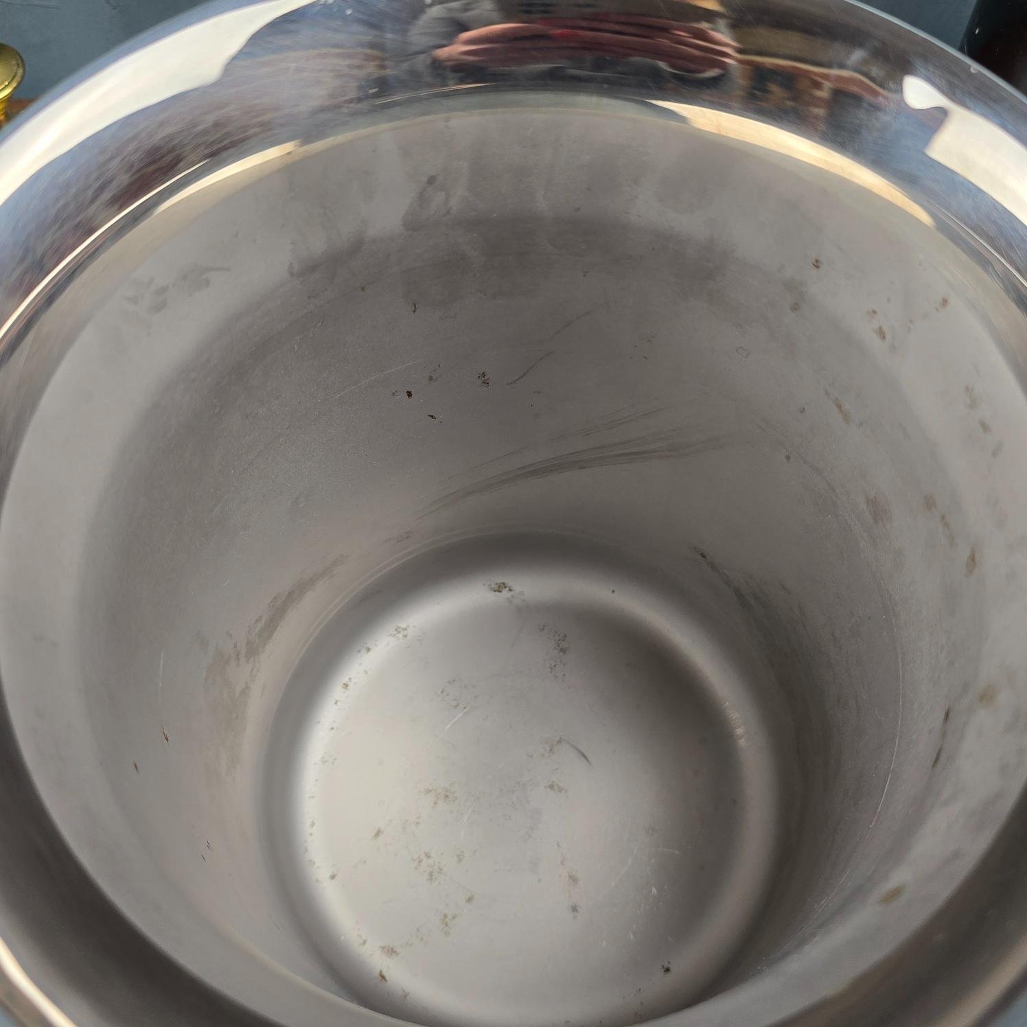 L’intérieur présente quelques traces d’usage et marquages, typiques de l’inox brossé, tandis que l’extérieur a été soigneusement poli pour révéler son bel éclat d’origine, griffes légères à noter à l’extérieur.