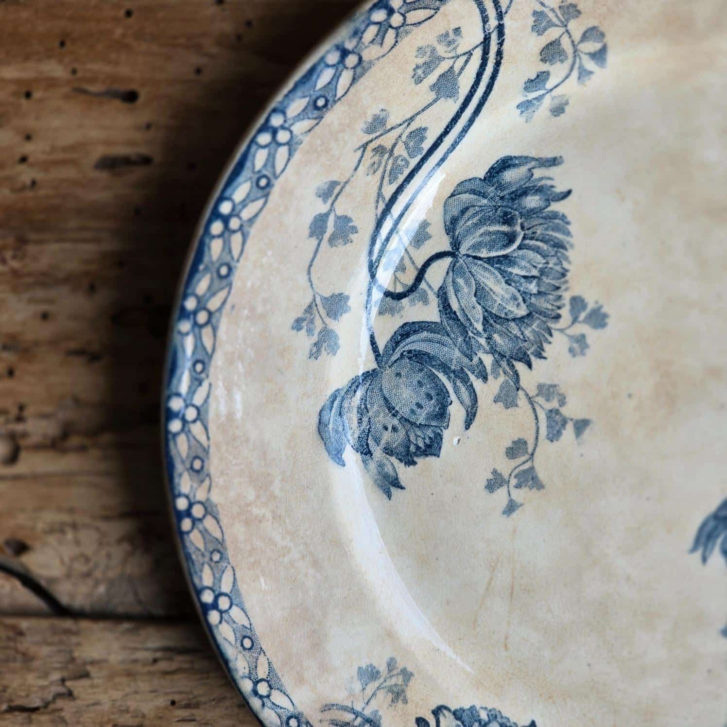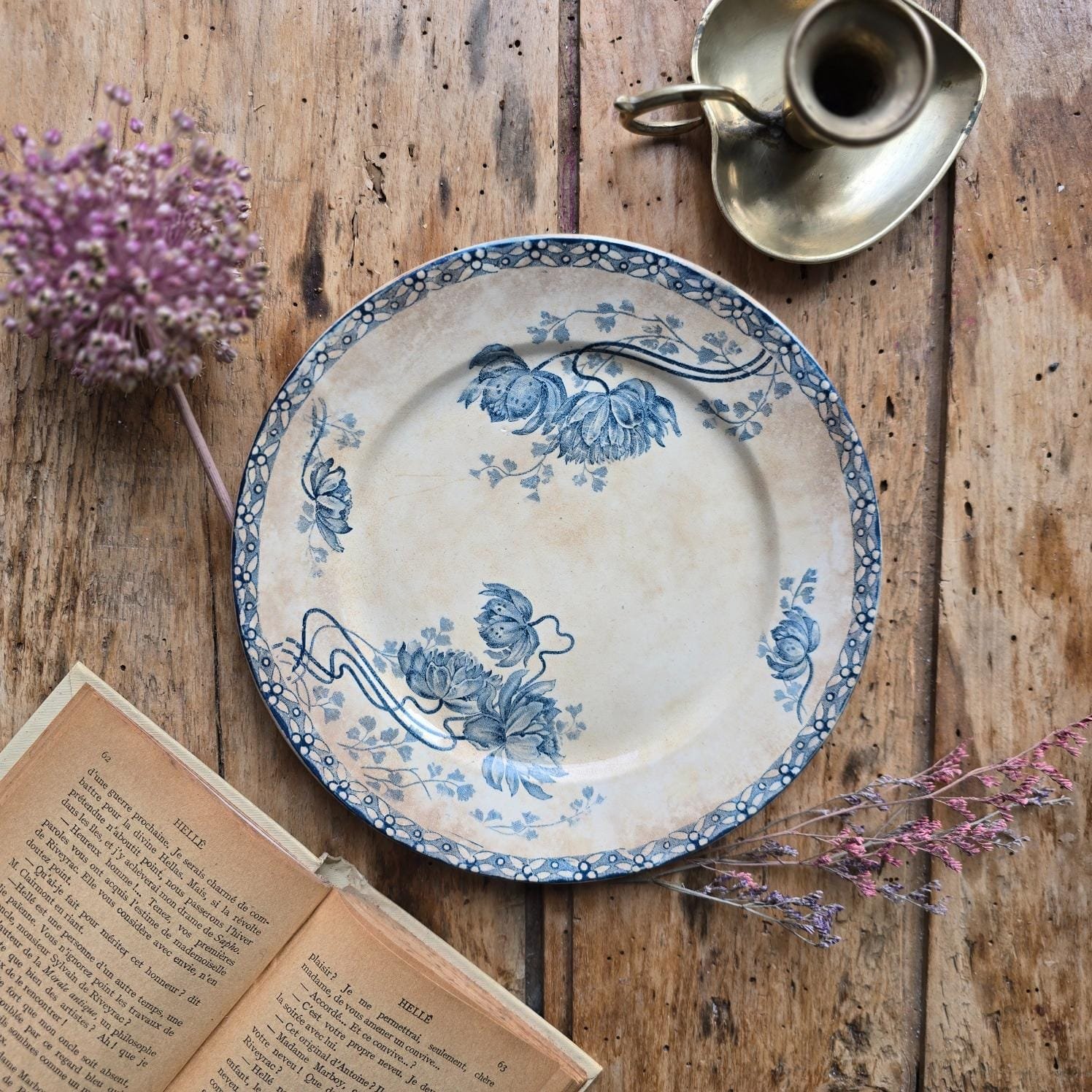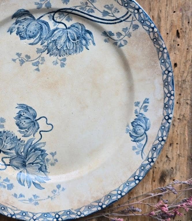 Une assiette qui a dû accompagner des goûters tranquilles, des desserts partagés, ou des matins de printemps. Son charme réside dans le contraste entre la finesse du motif et la texture du temps.