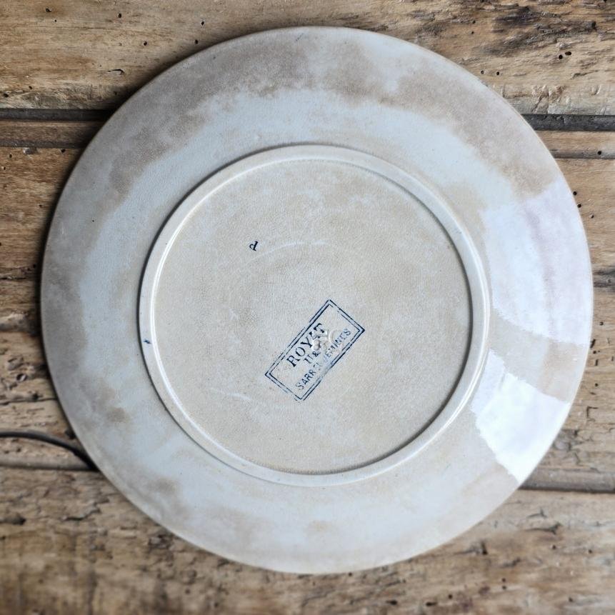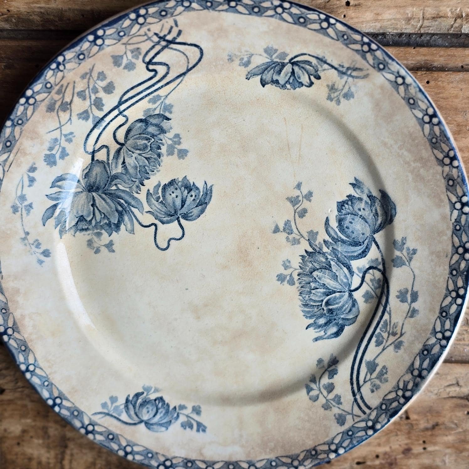 Cette assiette ancienne à dessert, signée U&C Sarreguemines, est un petit bijou du quotidien d’autrefois. Elle arbore le modèle ROYAT, orné d’un décor bleu floral stylisé, à la fois sobre et élégant, rehaussé par une patine naturelle qui lui donne tout son caractère.