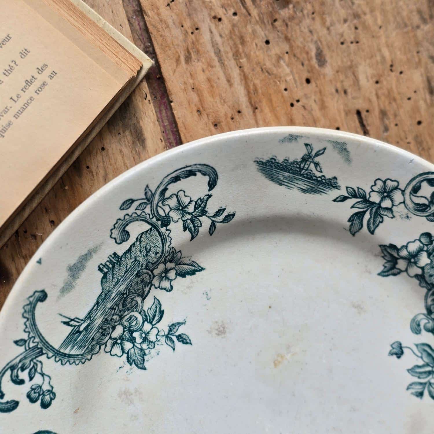 décors raffinés au charme intemporel. Son décor “Marine” mêle fleurs stylisées et paysages marins, entre bateaux, fanions et volutes finement dessinés. Le tout en vert profond, sur une faïence blanche doucement patinée. Sa forme semi-creuse en fait une pièce aussi pratique que décorative, à détourner en centre de table, vide-poche ou assiette de présentation. Elle est idéale pour compléter un service ancien, ou enrichir une collection de vaisselle dépareillée.