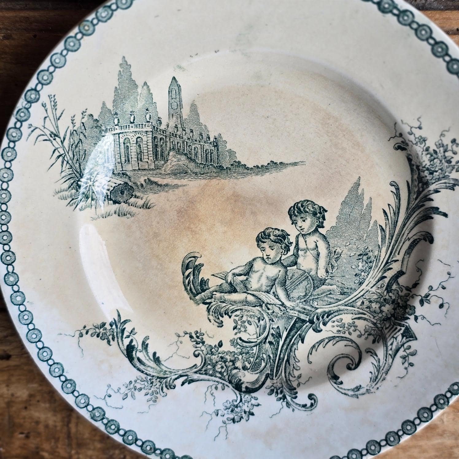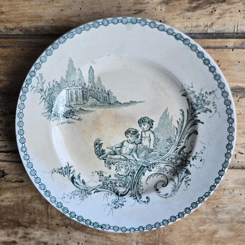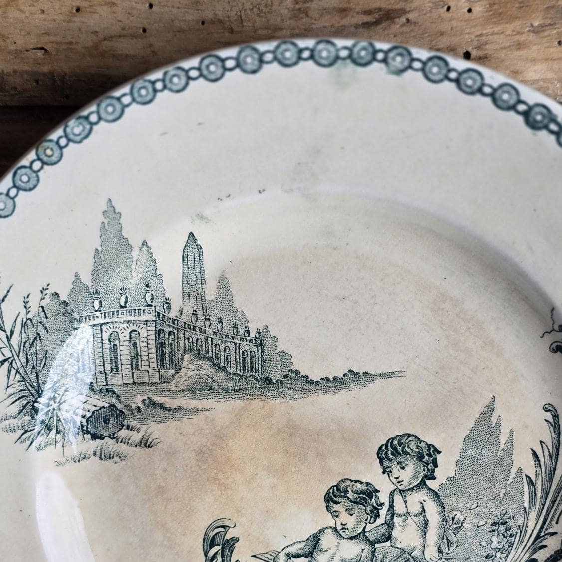 Cette assiette semi-creuse de la faïencerie St Amand les Eaux, modèle Trianon, est un véritable morceau d’histoire. Elle séduit par son décor vert représentant deux chérubins dans un paysage ornemental, encadré d’une frise stylisée. Le tout est délicatement patiné par le temps, sans jamais perdre son charme.