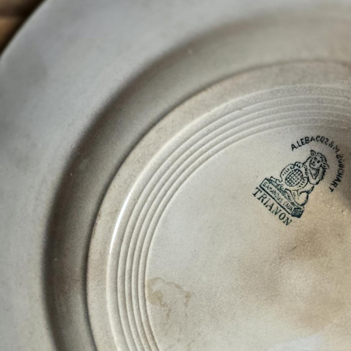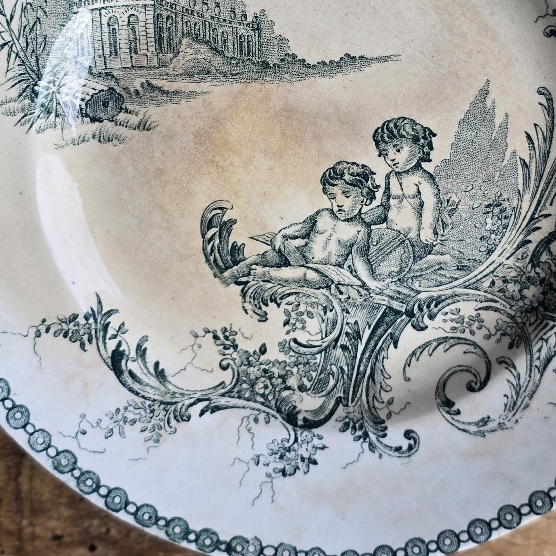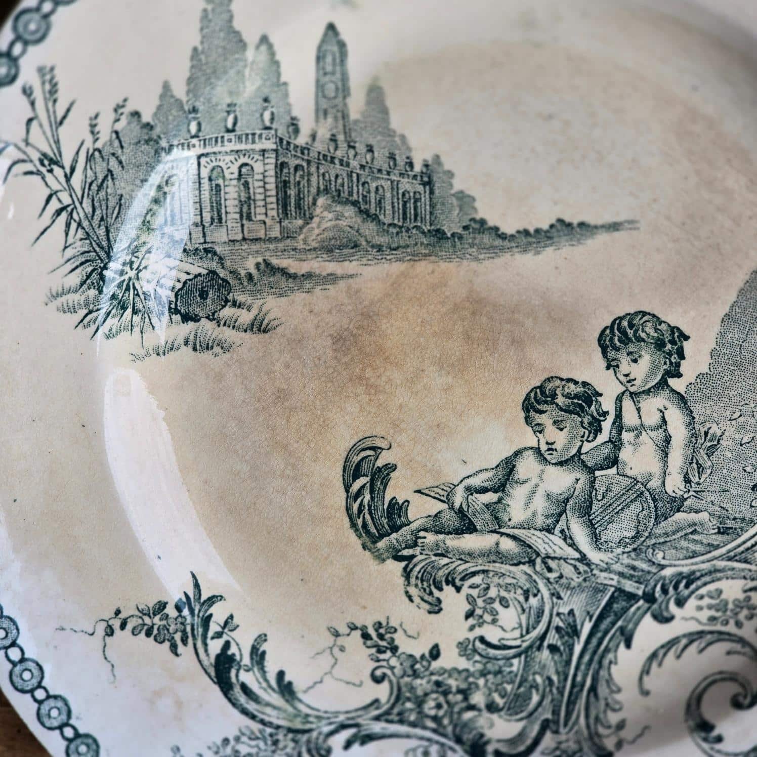 Cette assiette semi-creuse de la faïencerie St Amand les Eaux, modèle Trianon, est un véritable morceau d’histoire. Elle séduit par son décor vert représentant deux chérubins dans un paysage ornemental, encadré d’une frise stylisée. Le tout est délicatement patiné par le temps, sans jamais perdre son charme.