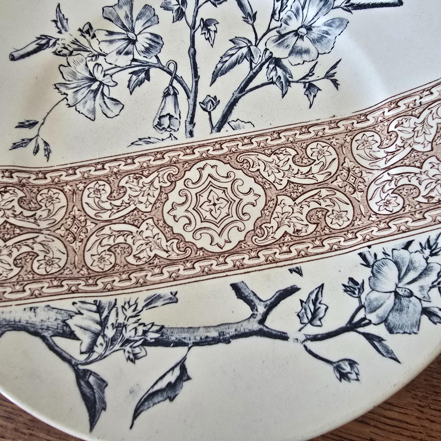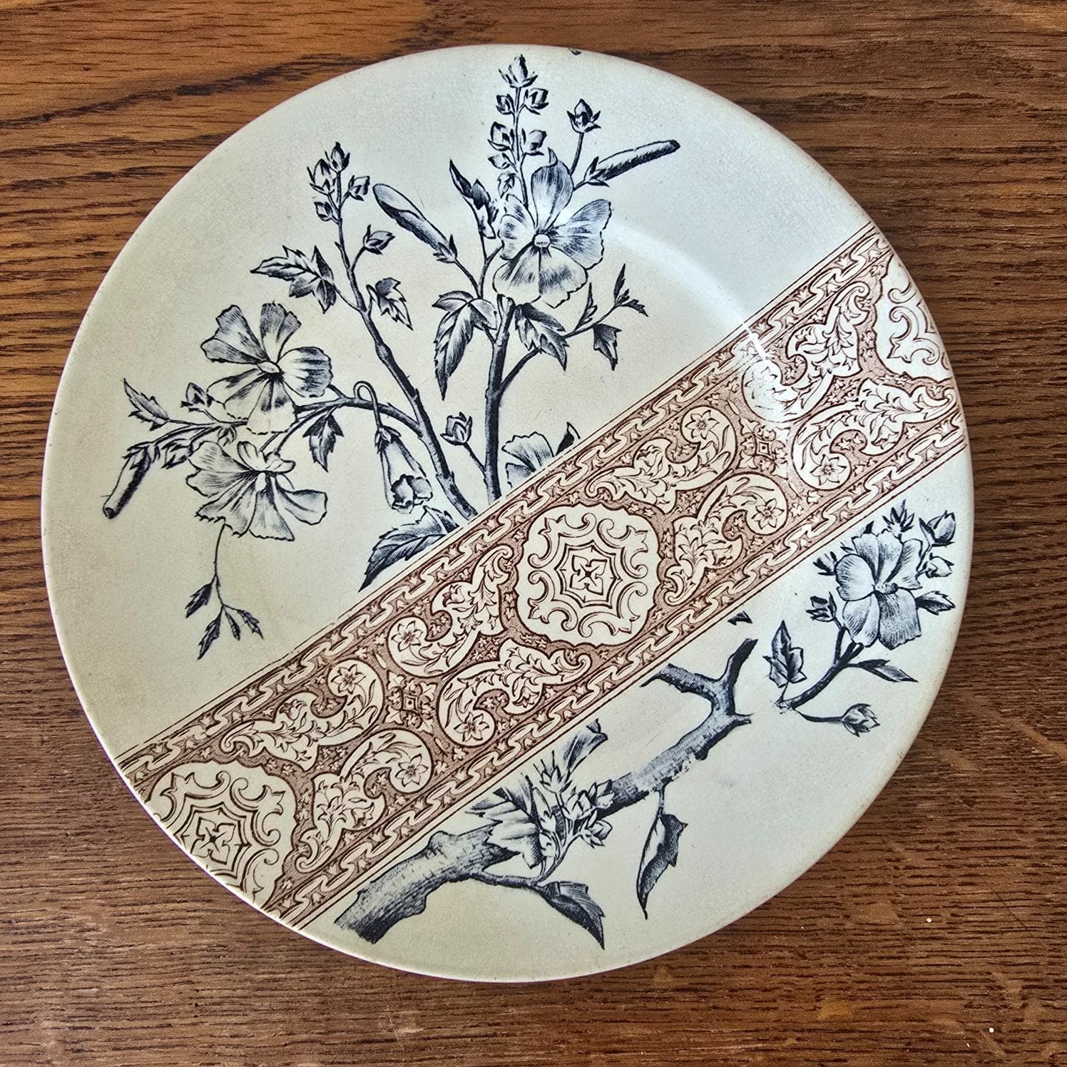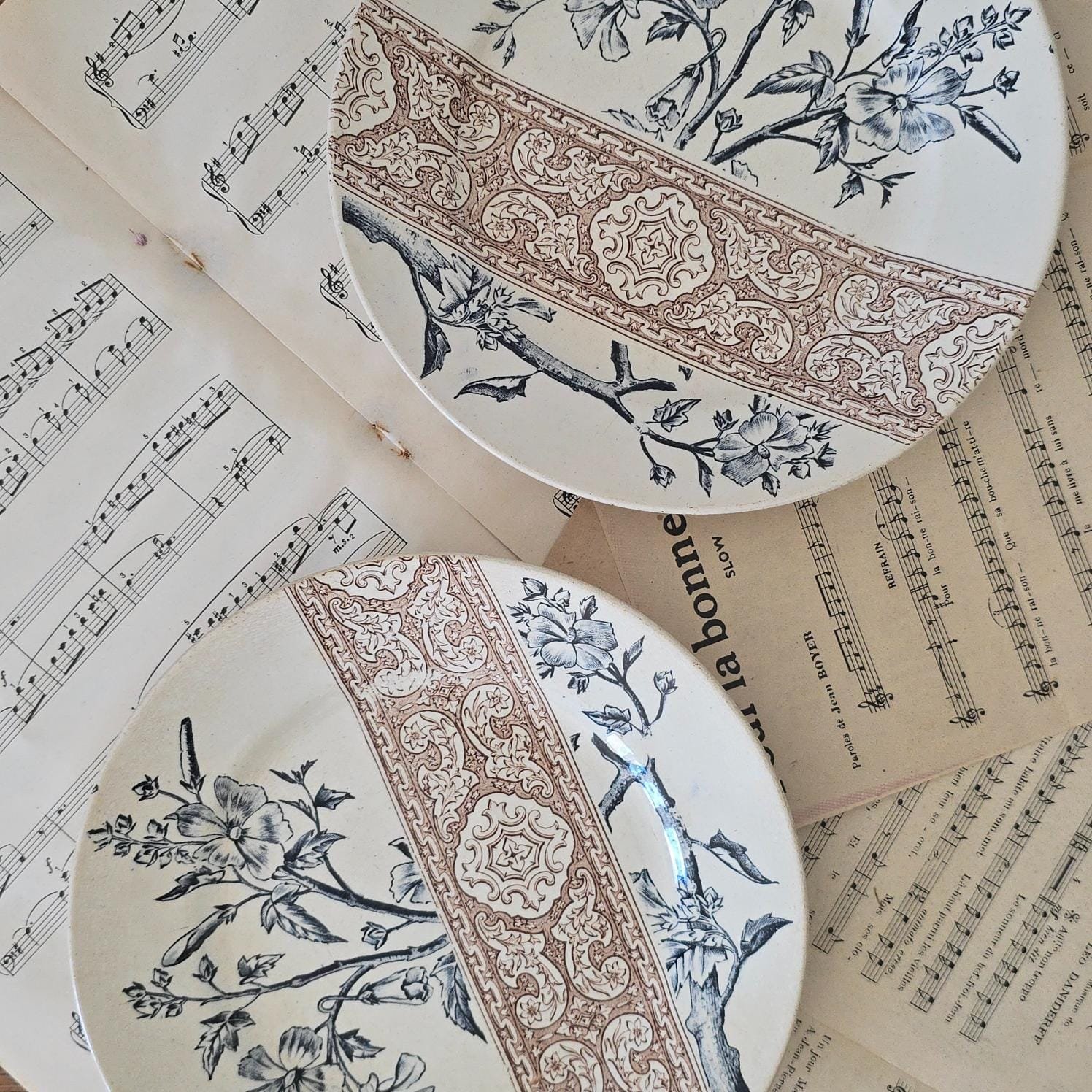 Leur décor raffiné mêle des motifs floraux bleu foncé et une frise géométrique sépia, sur un fond crème légèrement patiné par le temps.