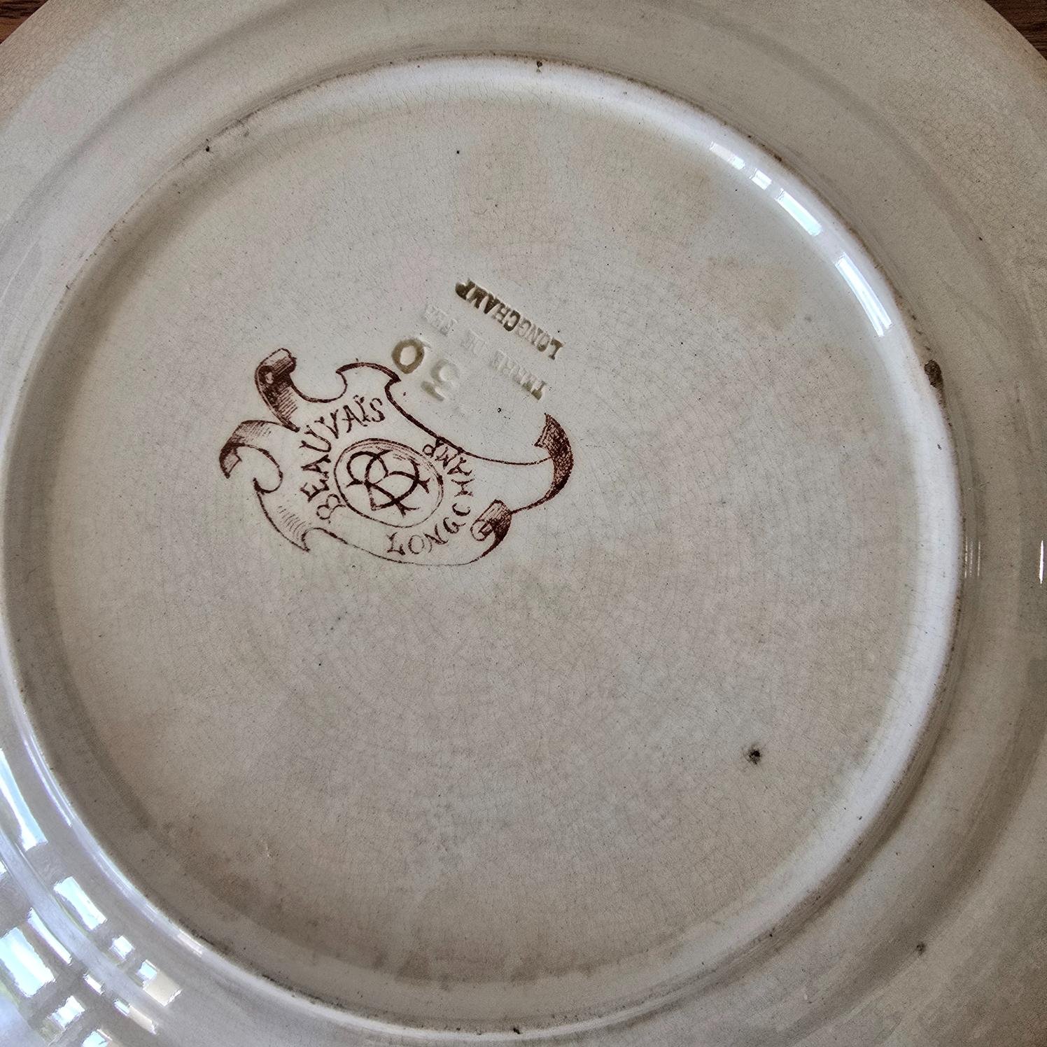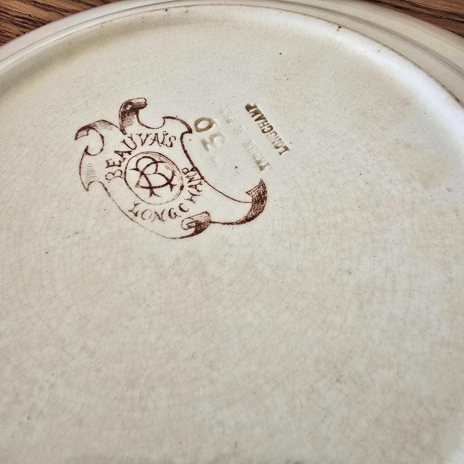Chaque assiette est estampillée au dos LONGCHAMP avec le nom du modèle BEAUVAIS et une marque en creux « TERRE DE FER LONGCHAMP ».