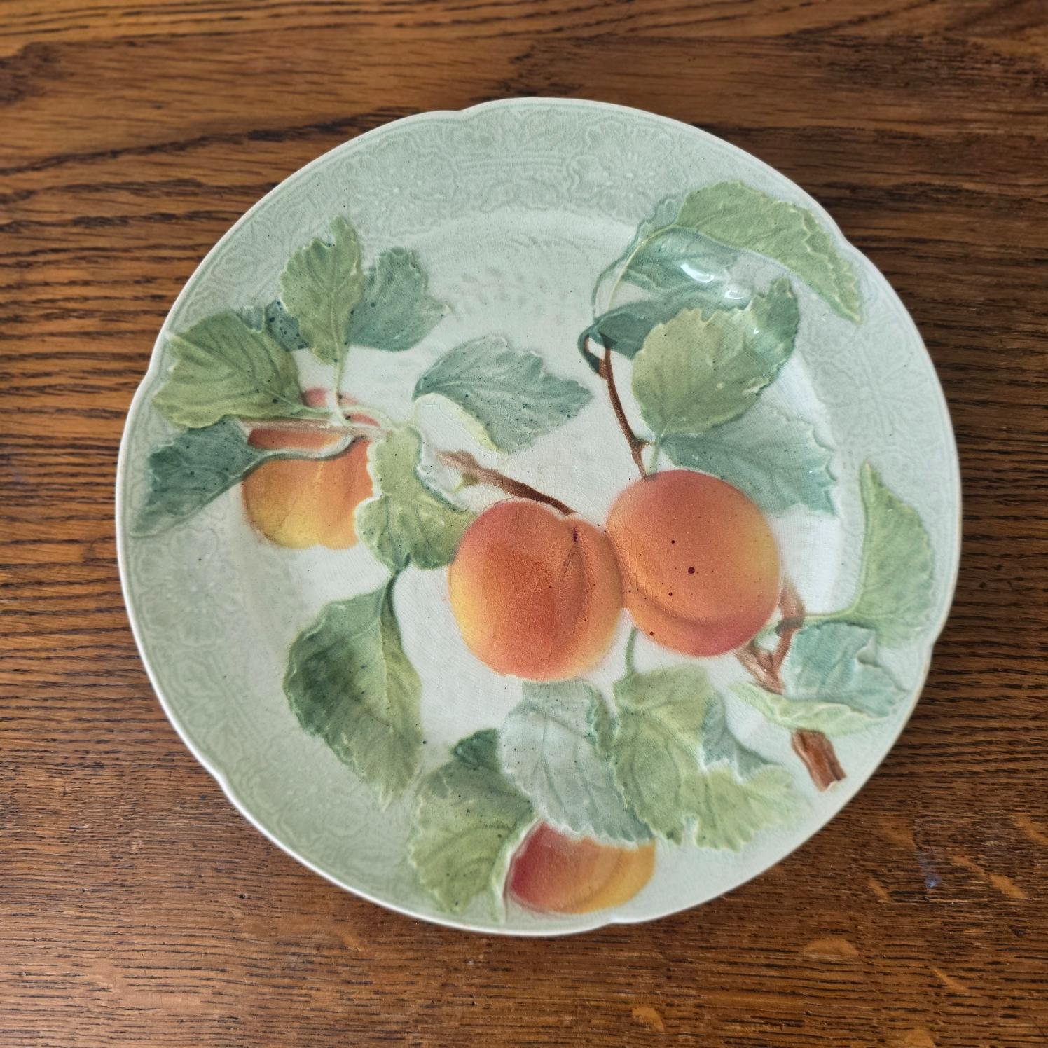 Une assiette pleine de douceur et de soleil ! Ce modèle ancien en barbotine, décoré de trois abricots charnus sur leur branche, séduit par son relief délicat et ses teintes chaleureuses.