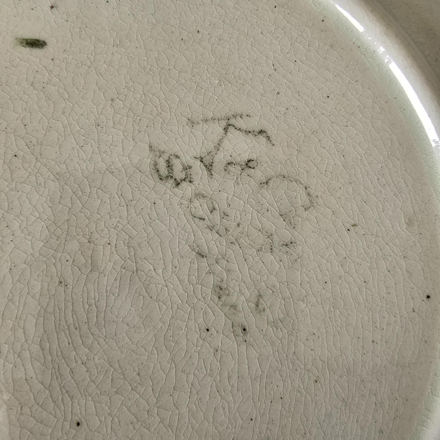 Le décor est finement modelé et peint à la main, dans des nuances de vert tendre et d’orange rosé qui évoquent la fin d’un été généreux. Les petites taches sombres visibles sur les fruits — probablement liées à la cuisson — leur donnent un réalisme inattendu : comme s’ils avaient été cueillis il y a peu, encore marqués par le soleil ou la terre.