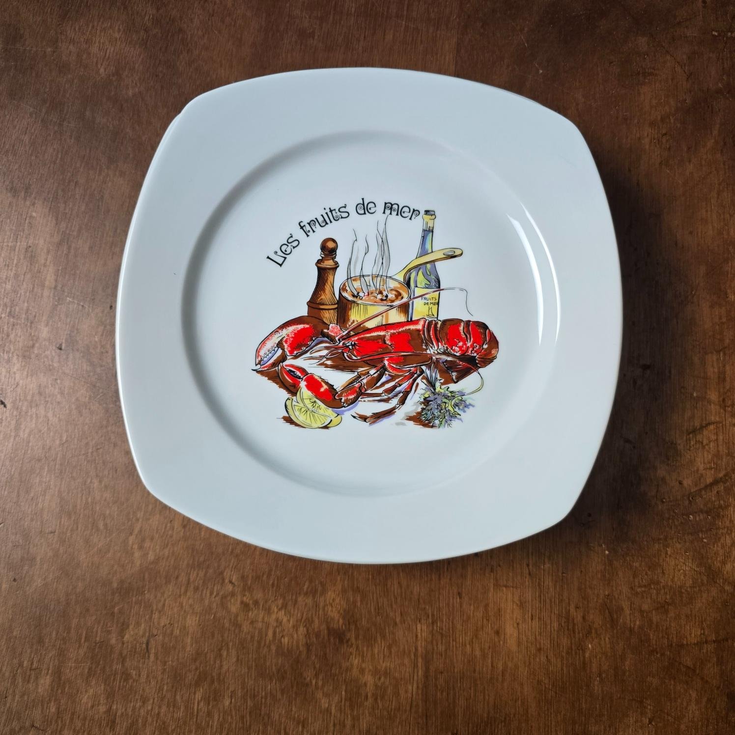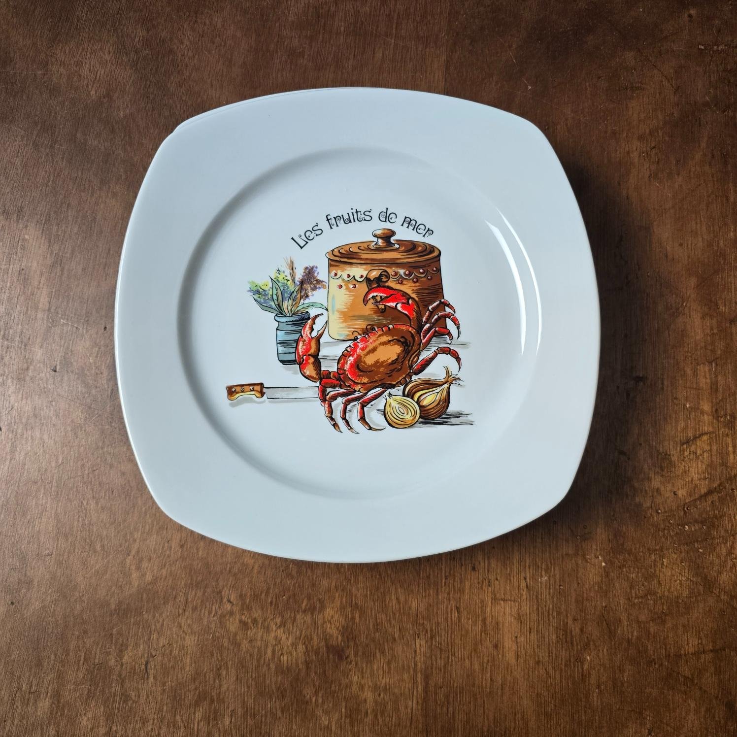 Charmant lot de 6 assiettes en porcelaine de Brémaille, chacune décorée d’une scène différente autour des fruits de mer : homard, coquillages, crevettes, moules, crabes… Une petite série pleine de couleur et de caractère, idéale pour une table estivale, une table de Noël, un repas iodé ou une décoration murale.
