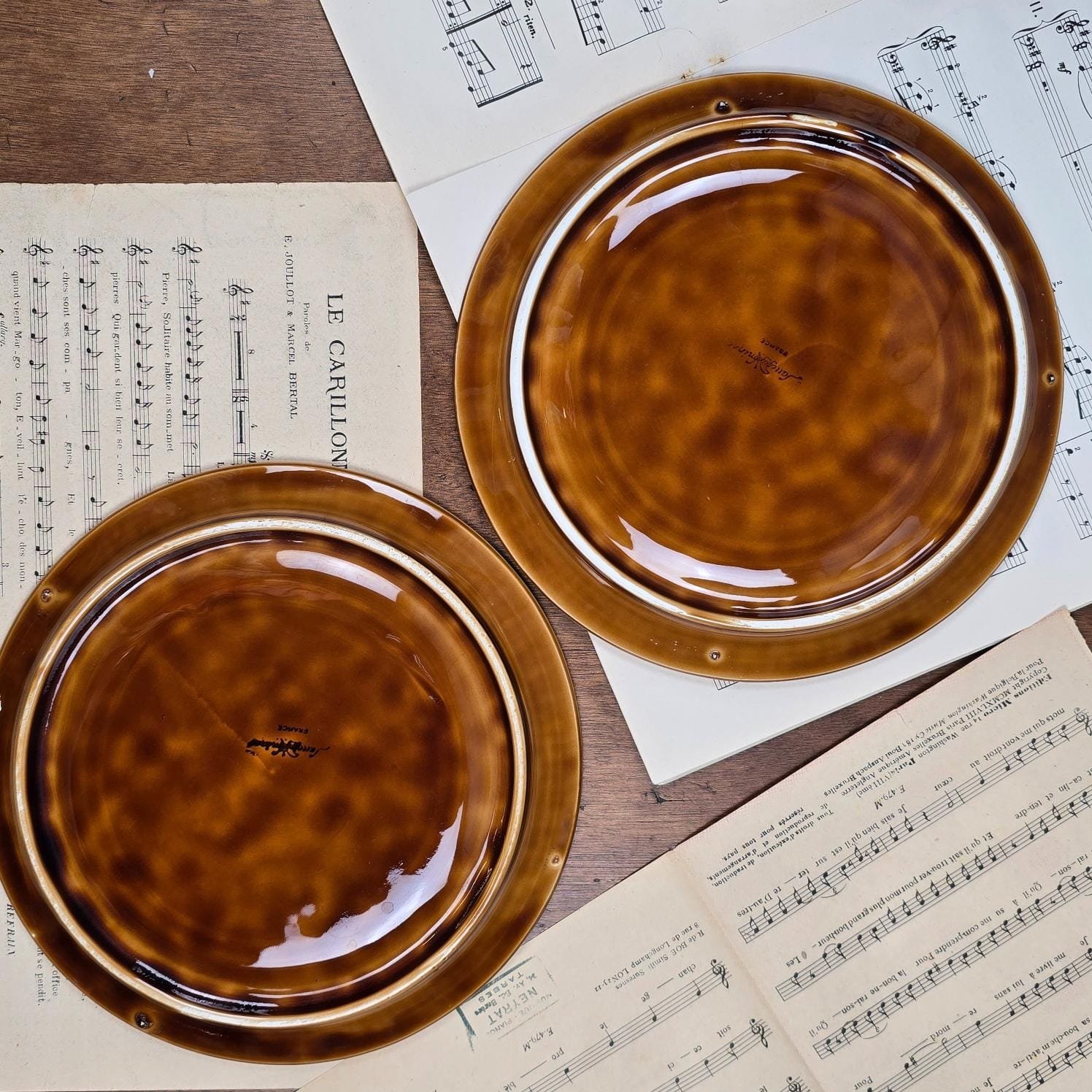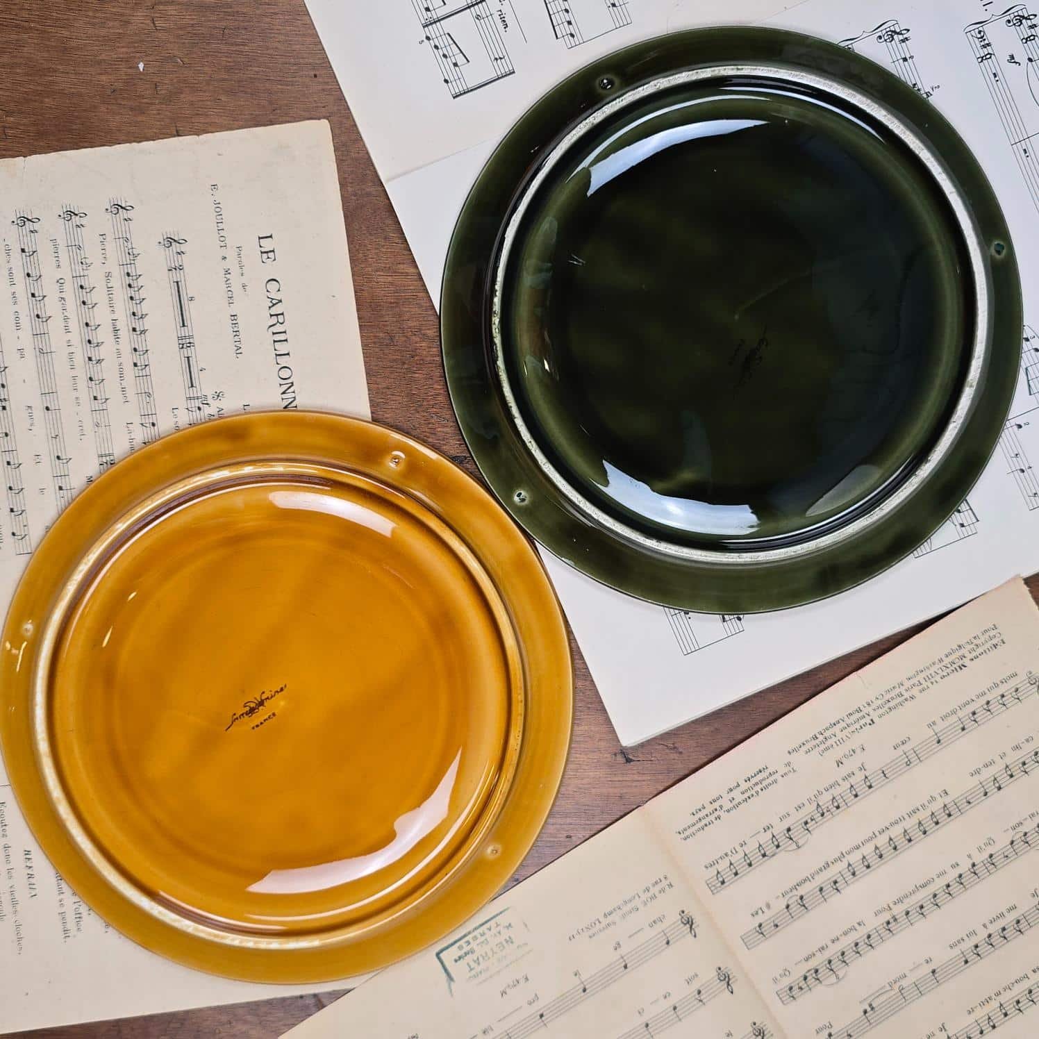 Chaque pièce présente un émail brillant et une teinte unique – du vert mousse au miel doré – formant un ensemble harmonieux et plein de caractère.