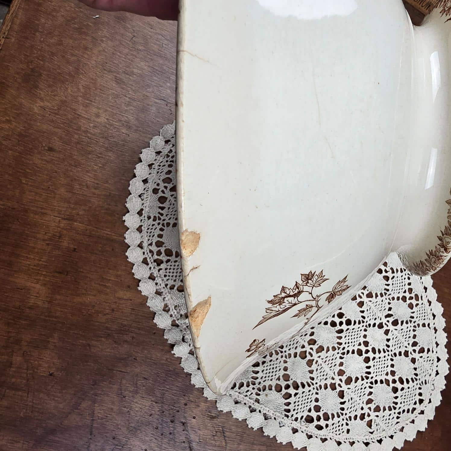 Avec ses dimensions généreuses, il faisait autrefois figure de pièce maîtresse sur les tables familiales. Aujourd’hui, bien qu’il présente plusieurs éclats et fêles, il conserve une force esthétique et un charme authentique. Ses craquelures et marques du temps soulignent son histoire et lui confèrent une beauté imparfaite pleine de caractère.