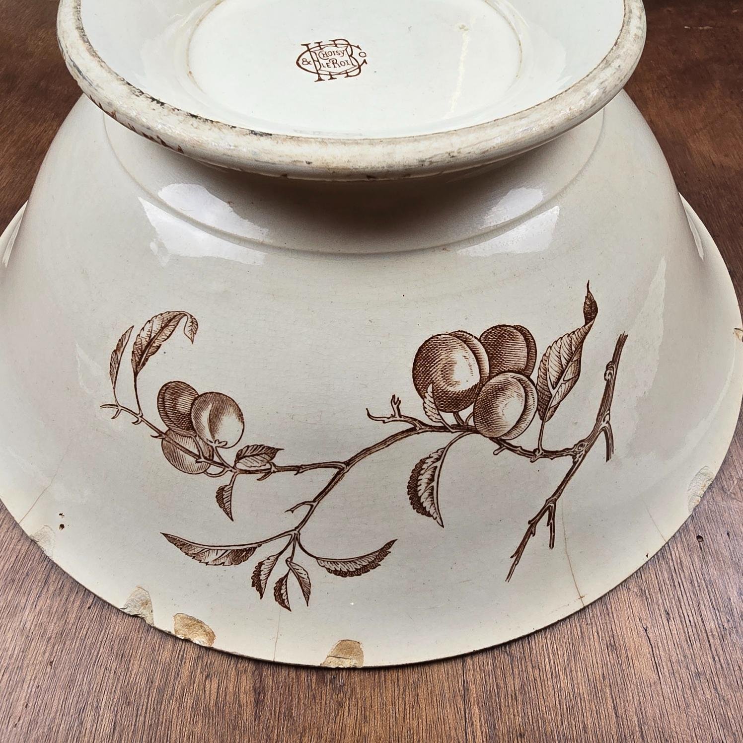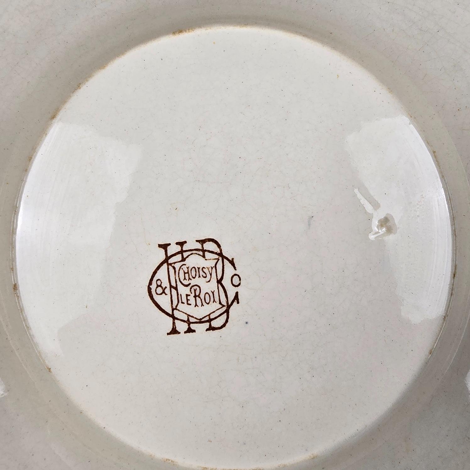 Ce grand saladier sur pied, signé HB & Cie Choisy-le-Roi, séduit par son superbe décor sépia d’inspiration botanique : branches fruitières, feuillages délicats et frise fleurie. Réalisé en terre de fer à la fin du XIXᵉ siècle, il illustre le raffinement et le savoir-faire de cette grande manufacture française.
