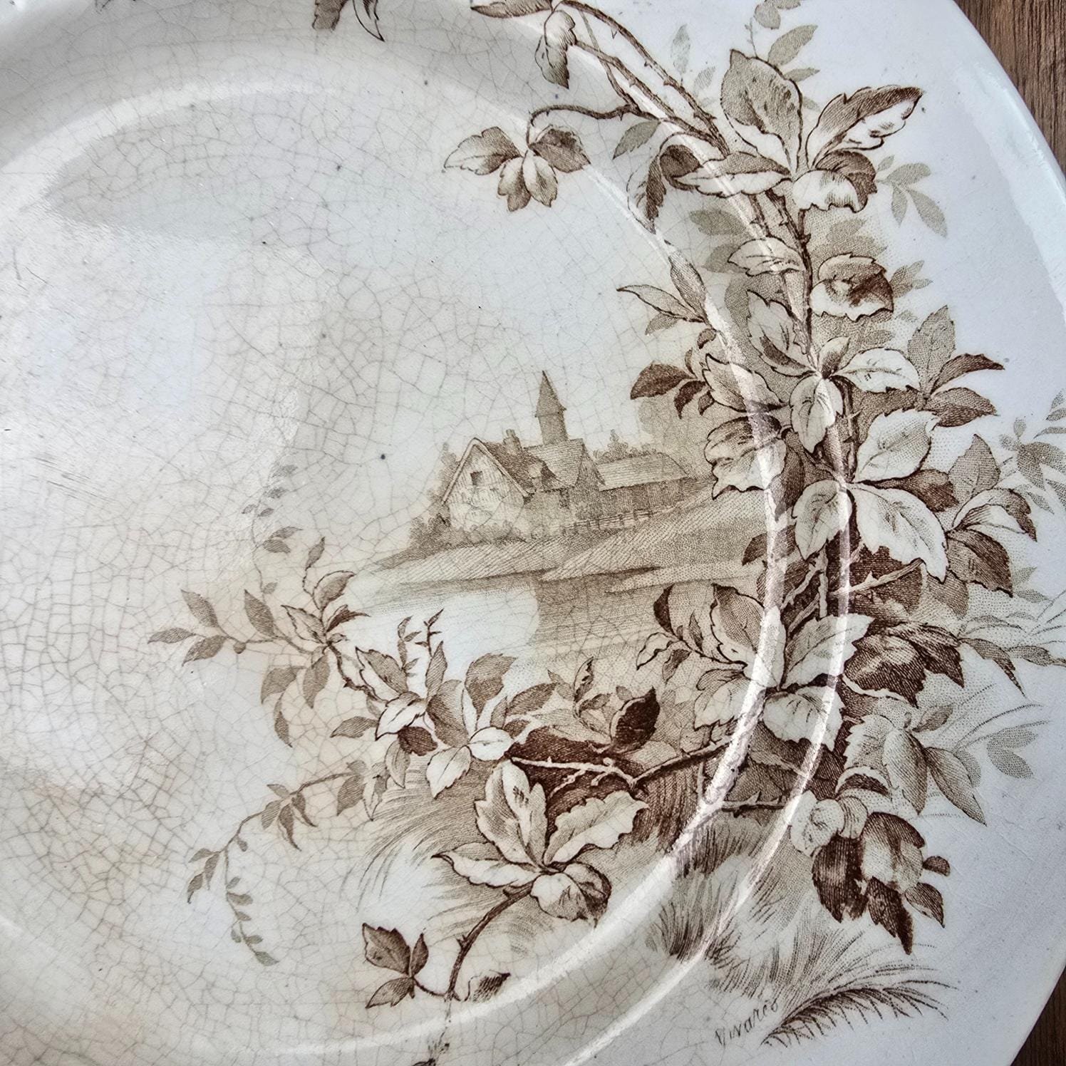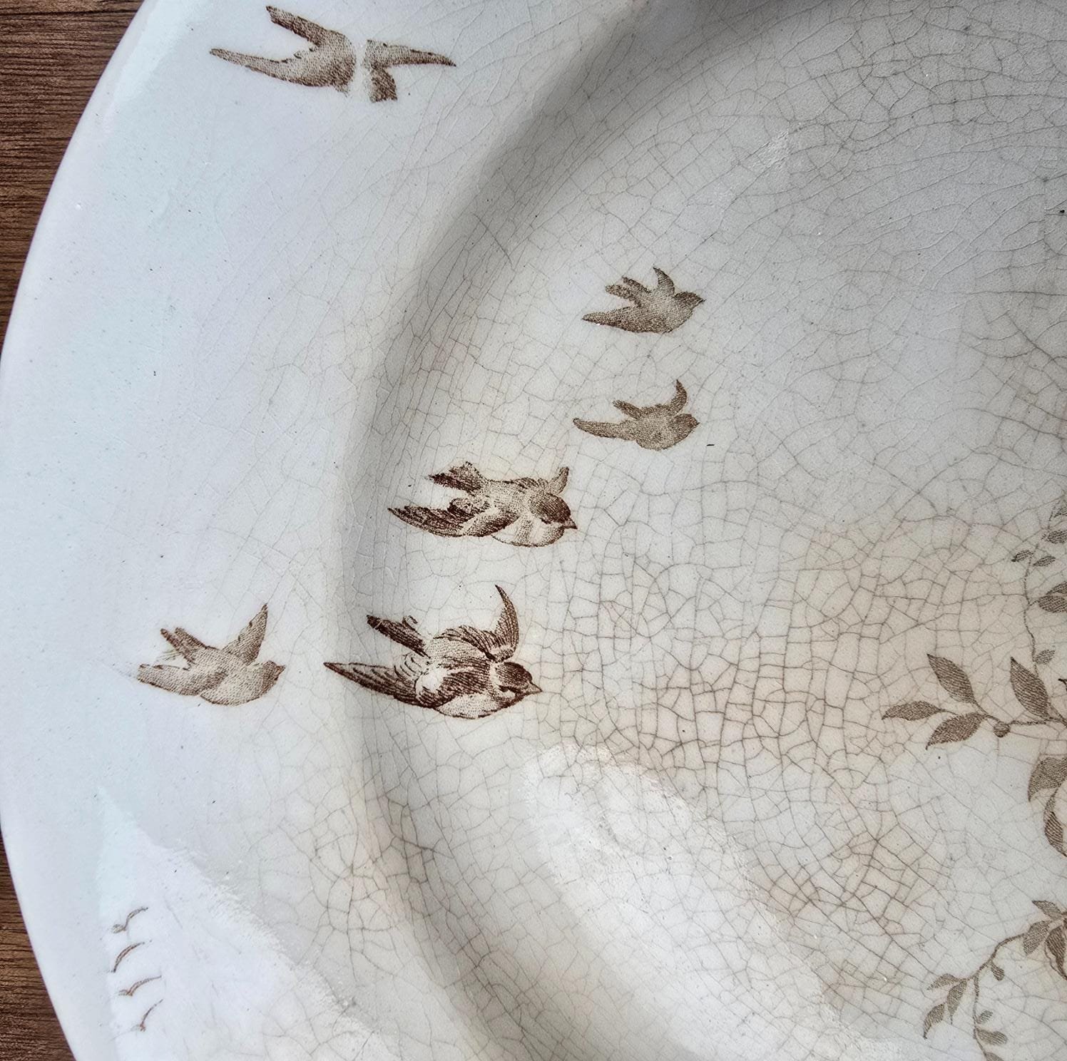 Ce superbe plat ancien sur pied attire immédiatement le regard par son délicat décor sépia. Des oiseaux en plein vol se mêlent à un paysage bucolique et à des branchages fleuris, formant une scène poétique typique de la fin du XIXᵉ siècle.