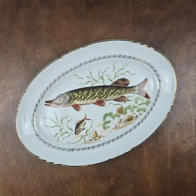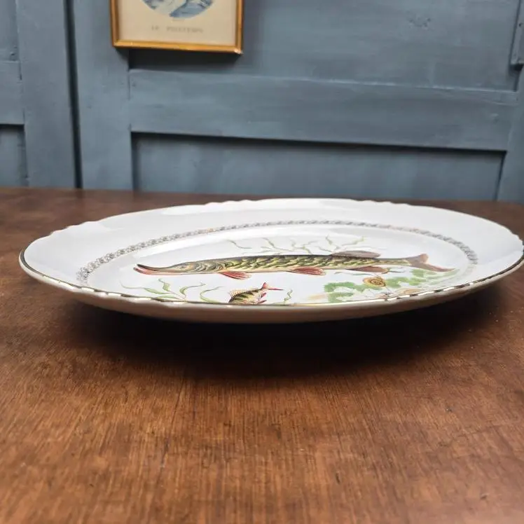 Élégant plat ovale en faïence française, décoré d’un brochet accompagné de son environnement aquatique (algues, coquillages, poissons). Sa bordure dorée et son décor finement détaillé en font une pièce aussi pratique que décorative.