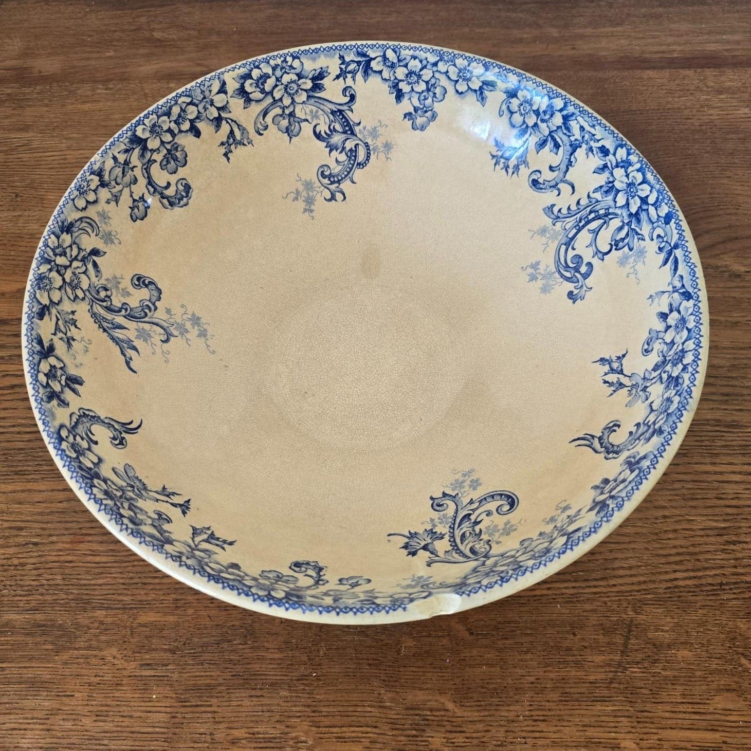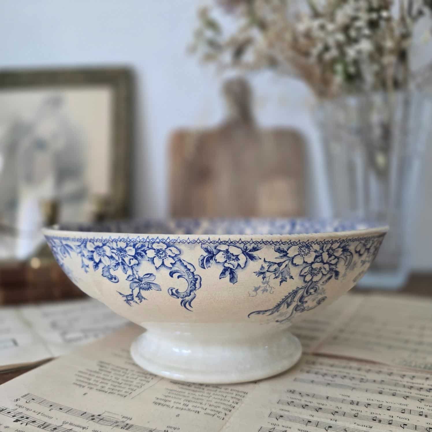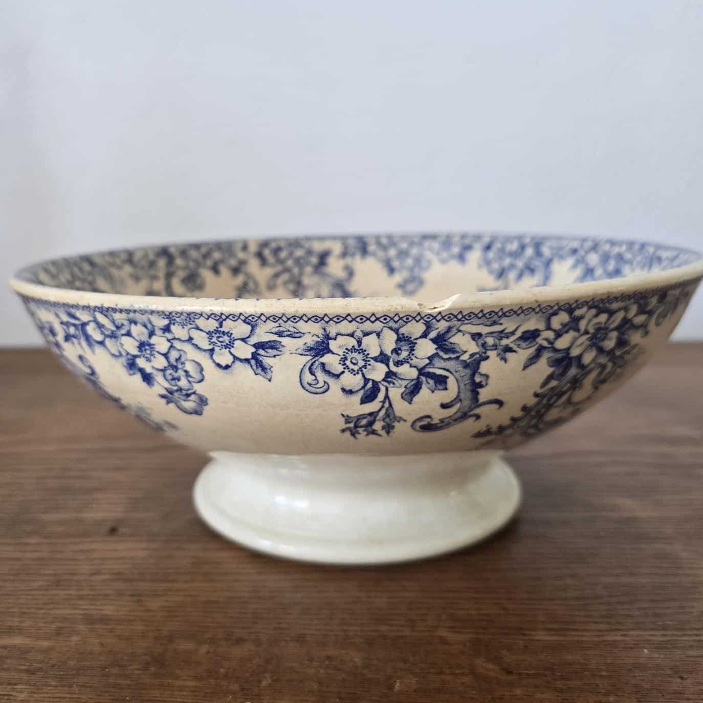 Ce superbe saladier ancien sur pied est une pièce de caractère signée Boulenger & Cie, faïencerie de Choisy-le-Roi, modèle Wild Rose en terre de fer. Orné d’un délicat décor floral bleu profond, il séduit autant par son charme visuel que par sa patine unique.