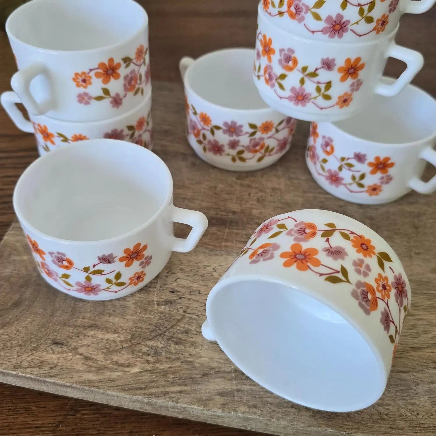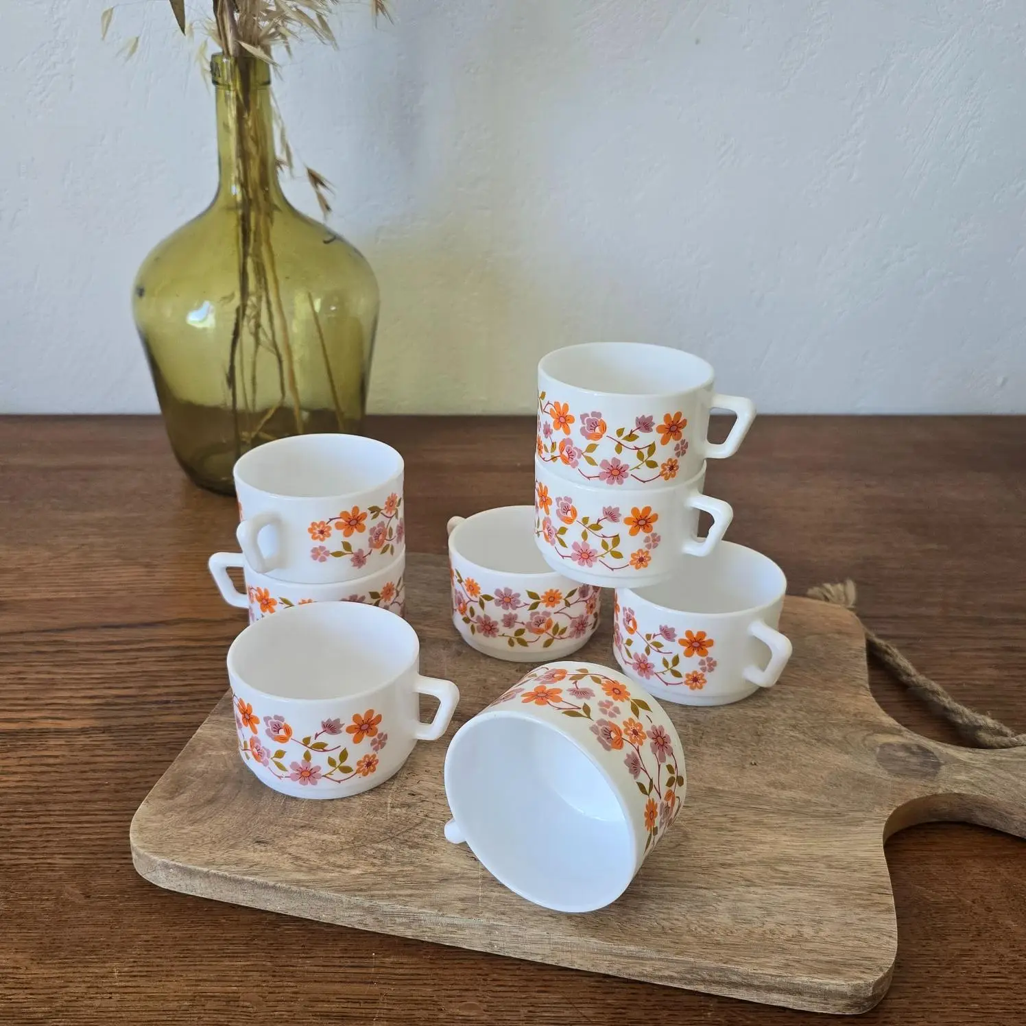 Charmant lot de 8 tasses Arcopal modèle Scania, décorées de fleurs orange et roses aux accents rétro.