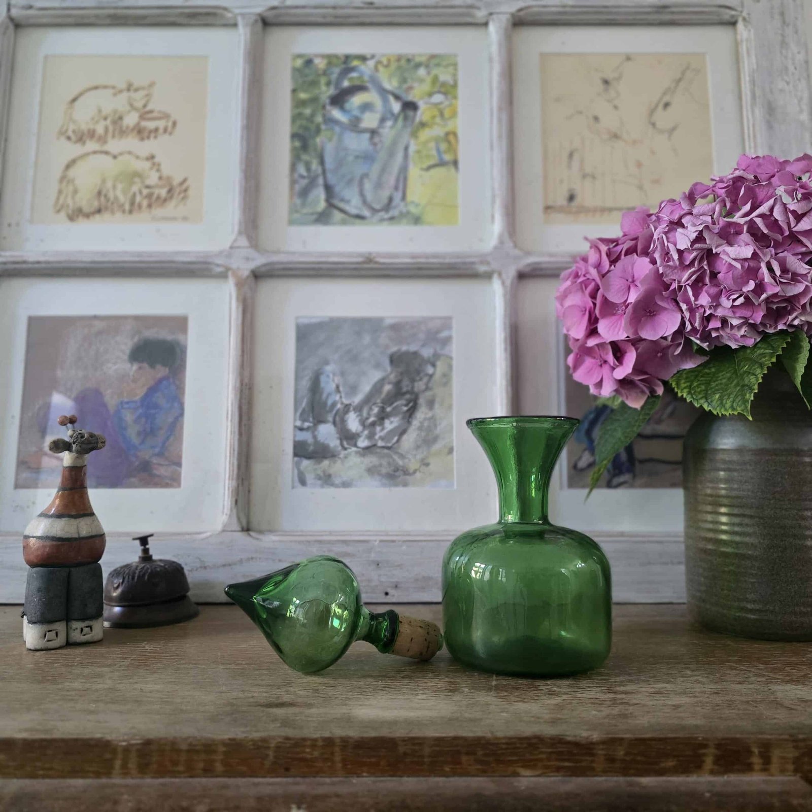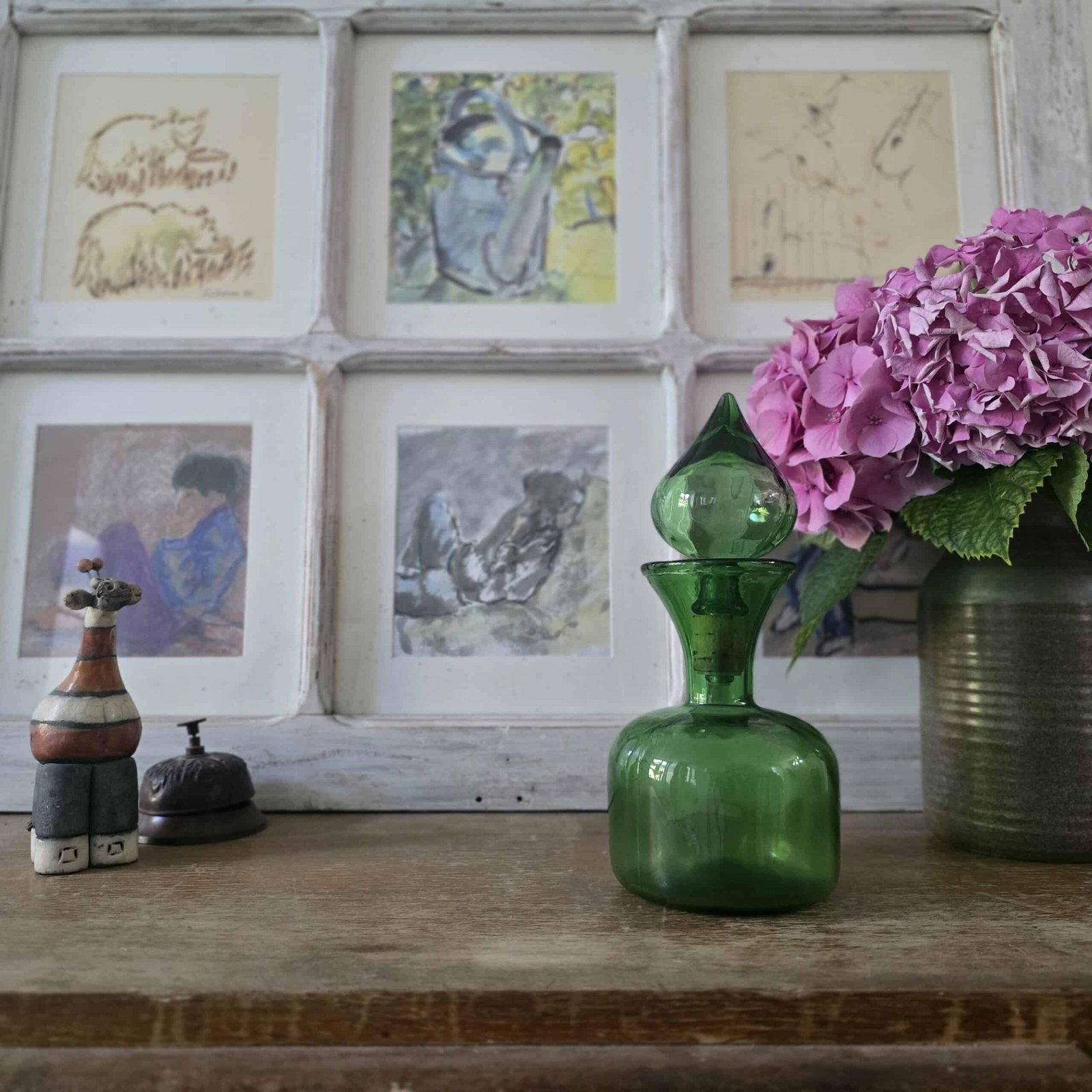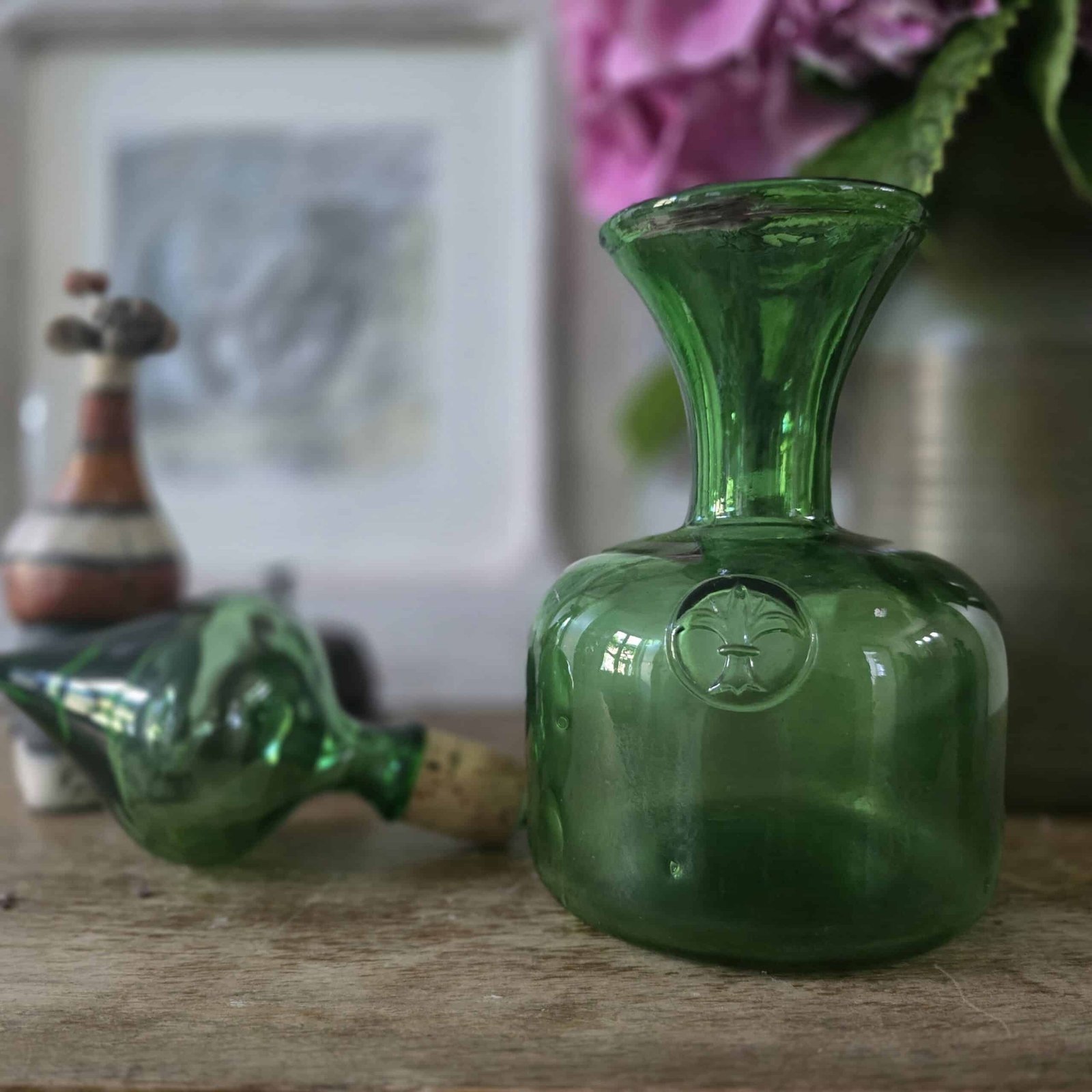 Carafe verte vintage en verre soufflé – médaillon fleur de lys