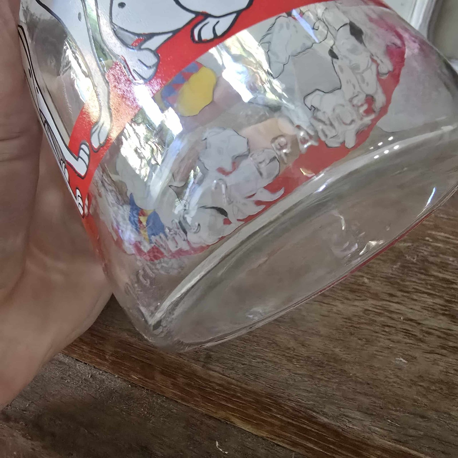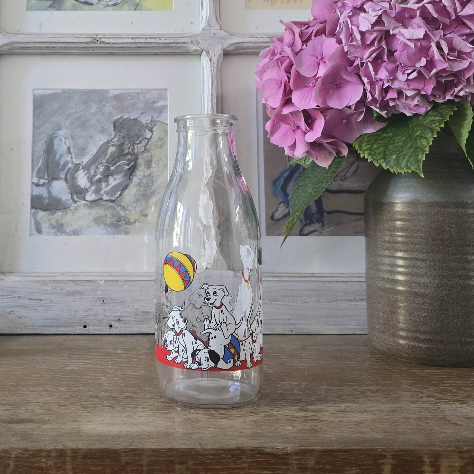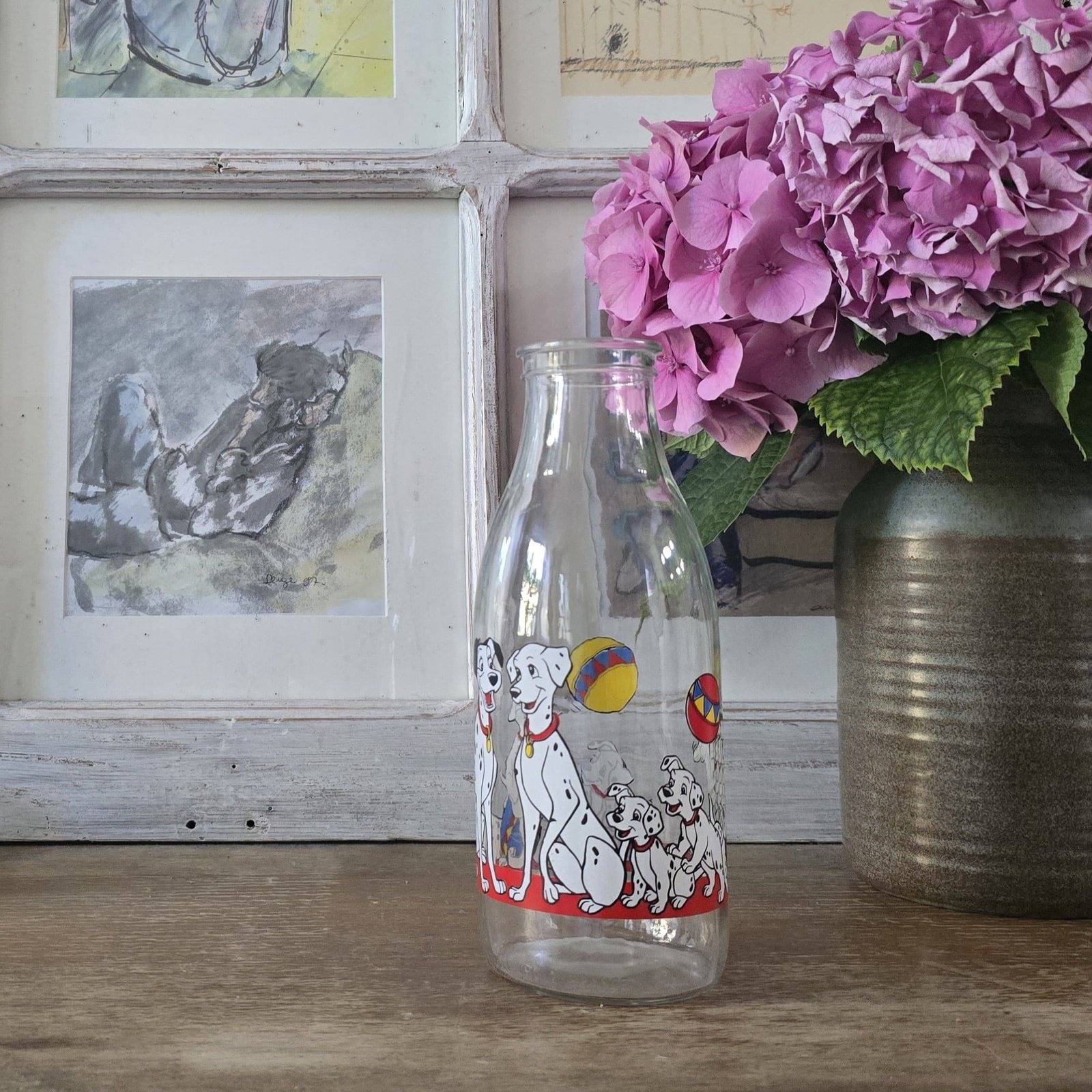 Carafe en verre moulé au charme rétro, illustrée des célèbres chiots tachetés du dessin animé culte Les 101 Dalmatiens. Probablement une ancienne bouteille de lait des années 80.