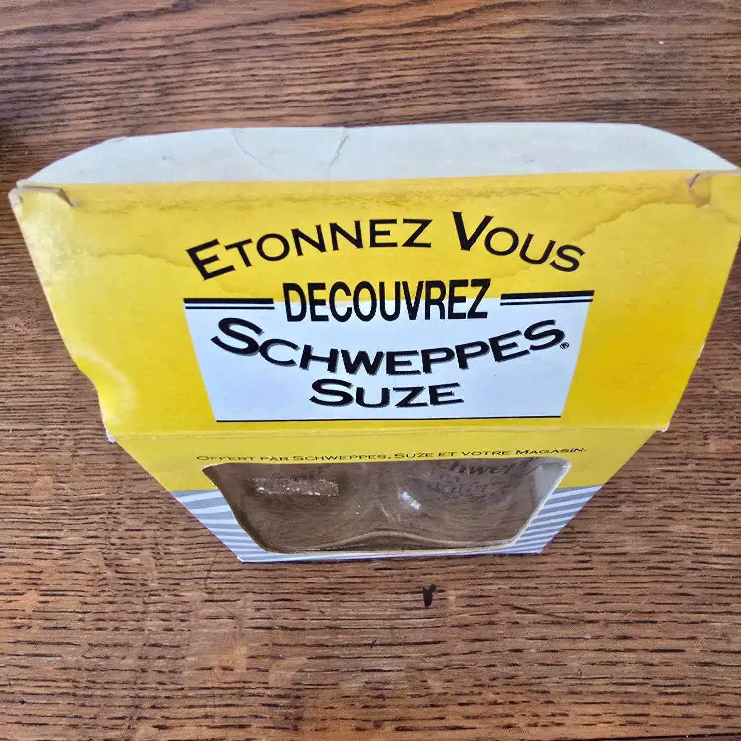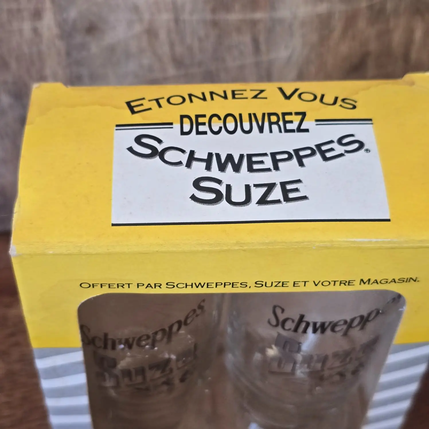 Voici un joli coffret publicitaire des années 80-90, contenant 2 verres Schweppes Suze.