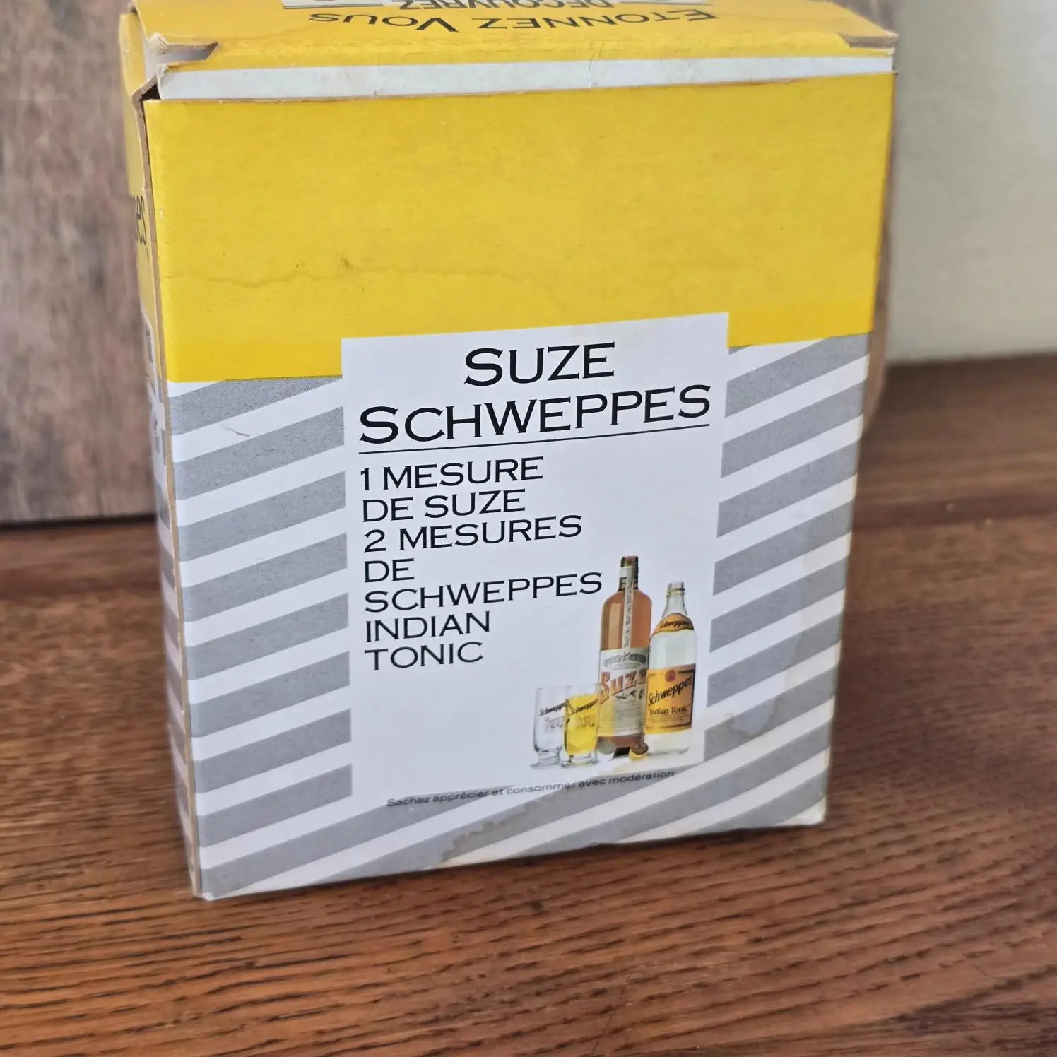Ces verres au design élancé portent la double signature Schweppes et Suze, deux marques emblématiques de l’apéritif français. Le coffret est complet, avec son emballage d’origine, portant la mention :
