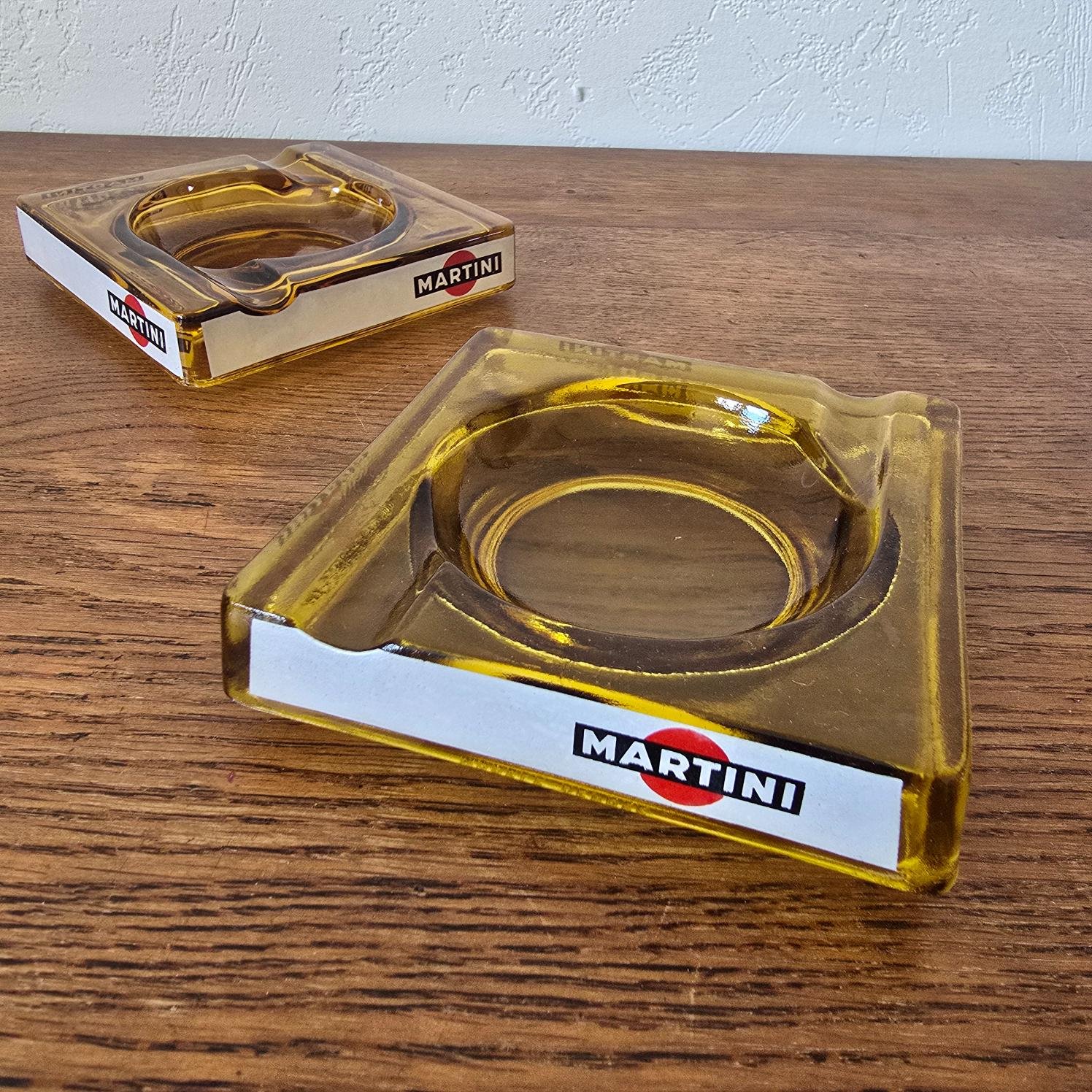 En verre moulé jaune ambré, il arbore le célèbre logo Martini sur fond blanc et rouge, immédiatement reconnaissable.