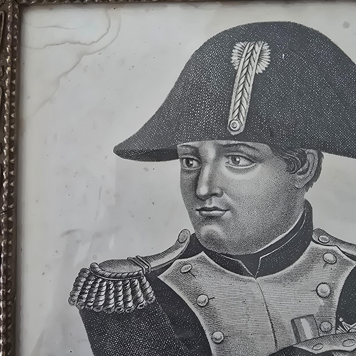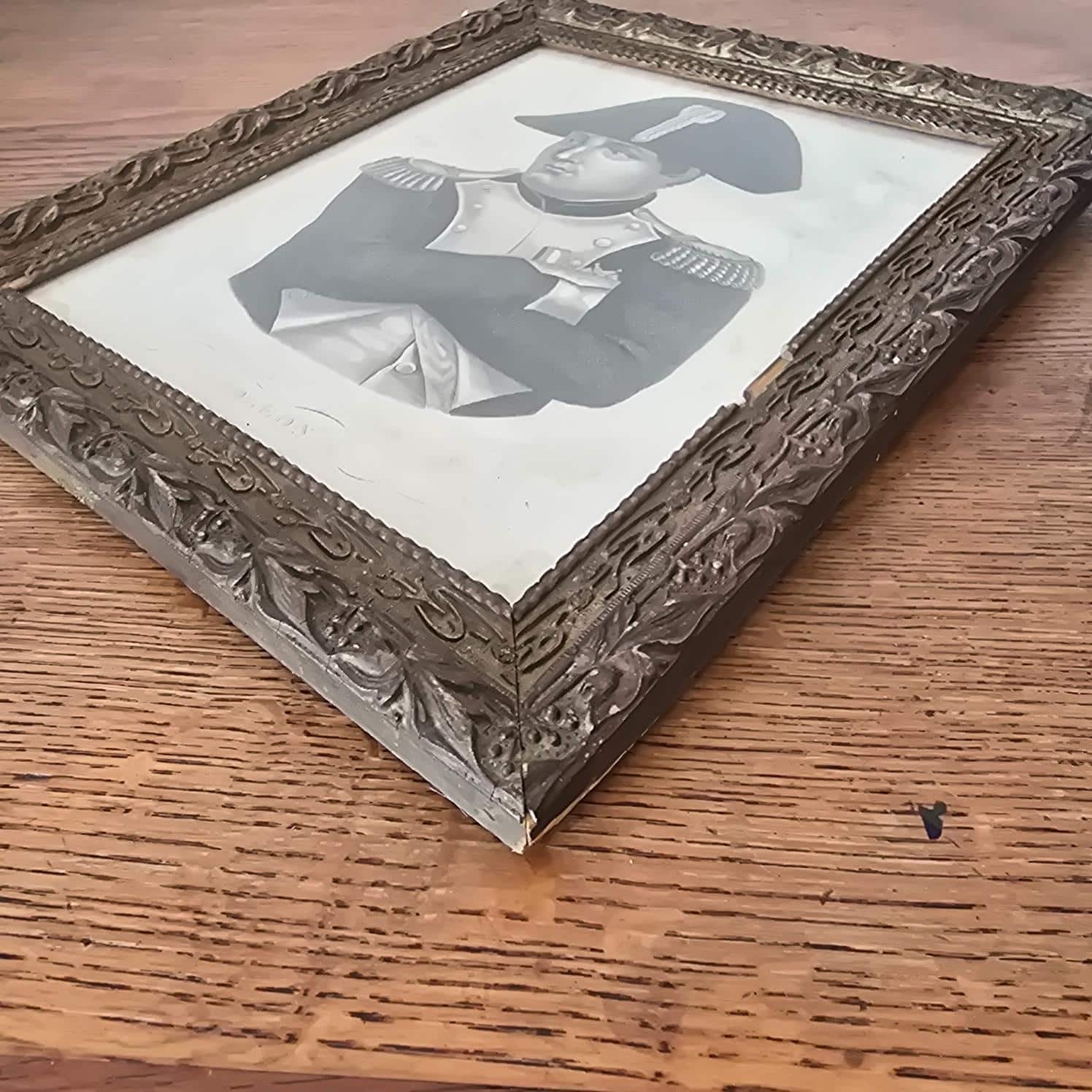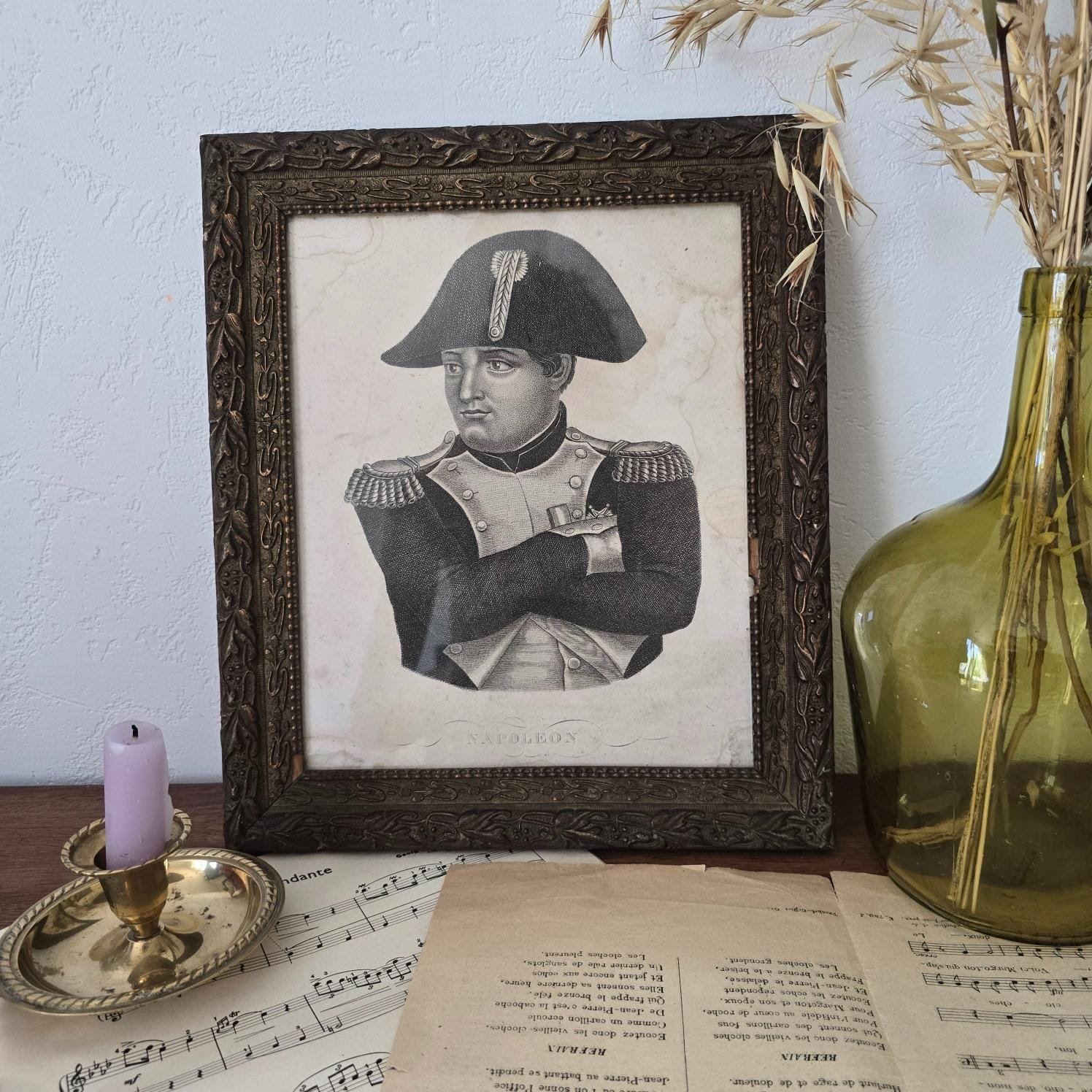Il trône, les bras croisés, dans son uniforme à épaulettes, l’air sévère et presque mélancolique. Ce portrait ancien de Napoléon est présenté dans un cadre en bois orné de motifs végétaux en relief, patiné et marqué par les années. Le verre protège l’image noir et blanc, tâchée par l’humidité mais toujours empreinte de solennité.