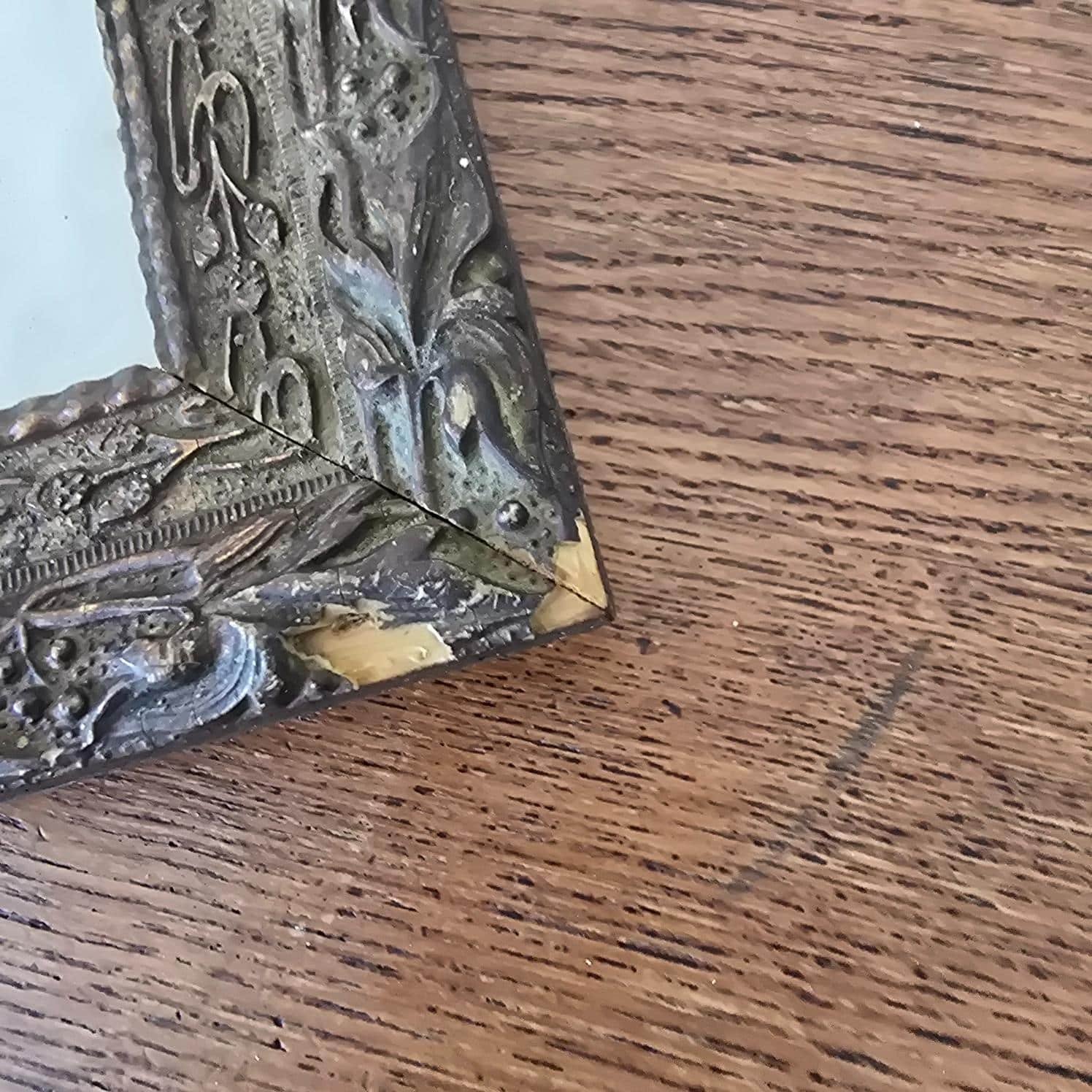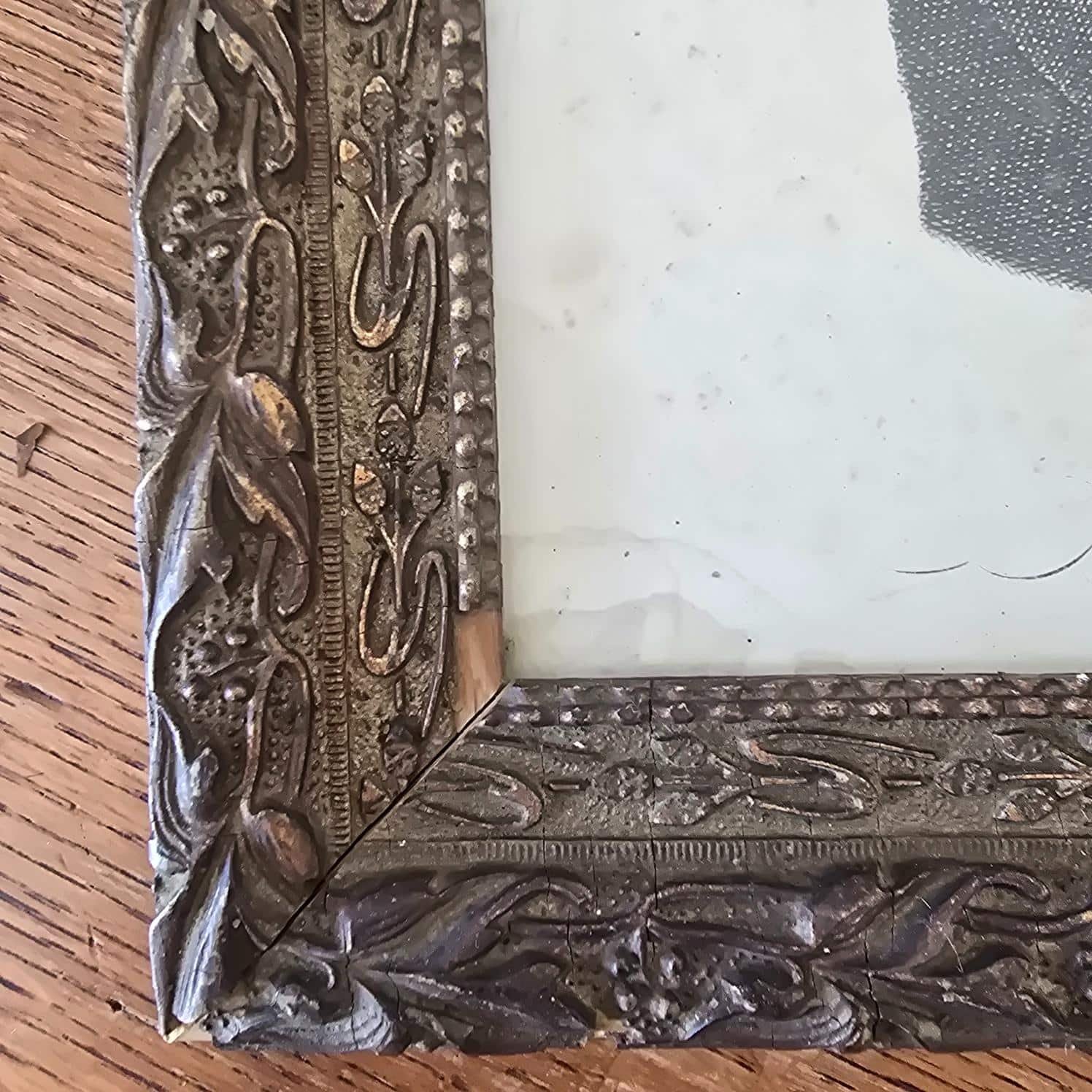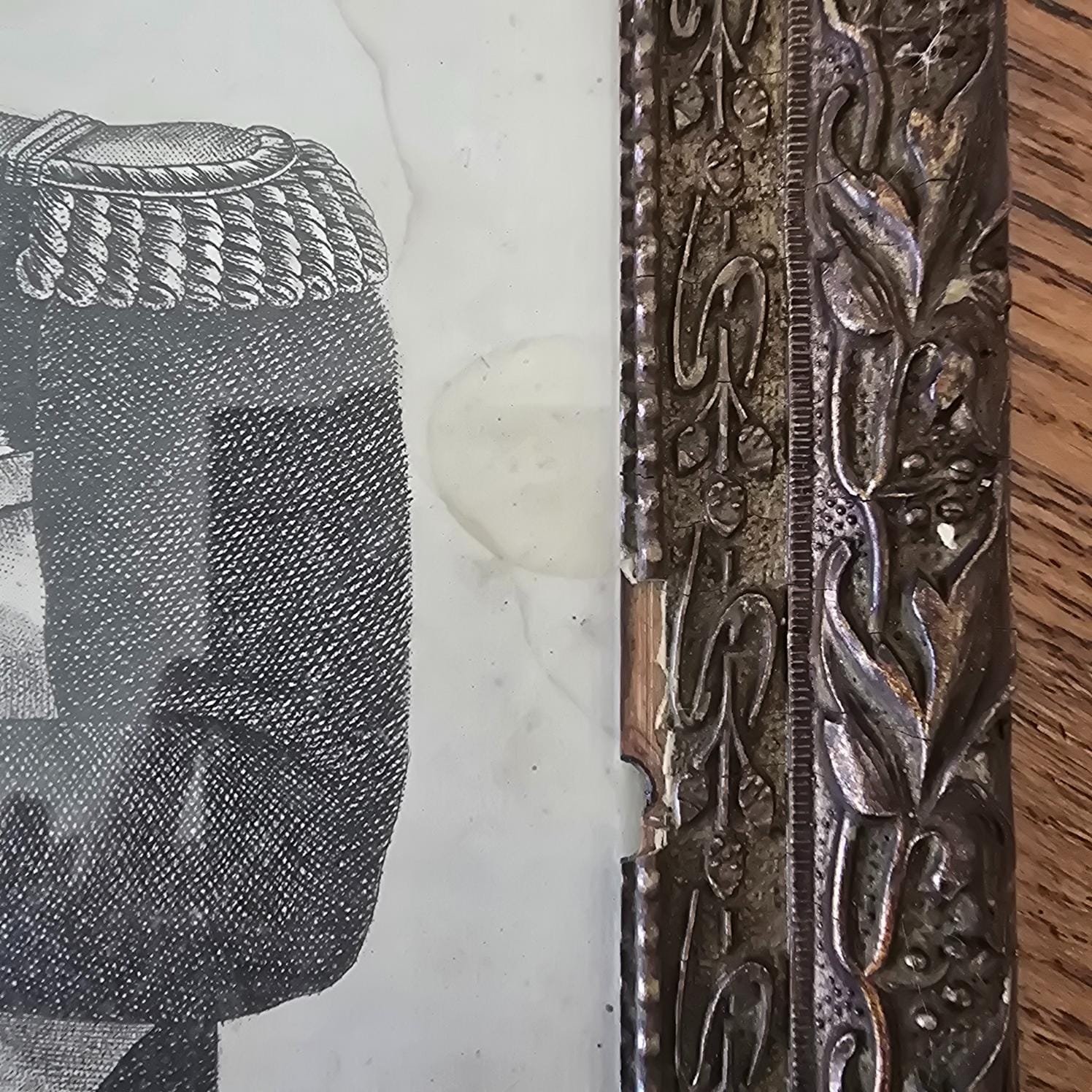 Au dos, une planche de bois et une inscription manuscrite datée de 1955 nous rappellent que ce cadre a vécu, suspendu quelque part dans une maison qui honorait l’histoire. L’attache en fil de fer est d’époque. À noter : plusieurs manques visibles sur le cadre et une belle patine brunie qui ajoute au charme de l’ensemble.