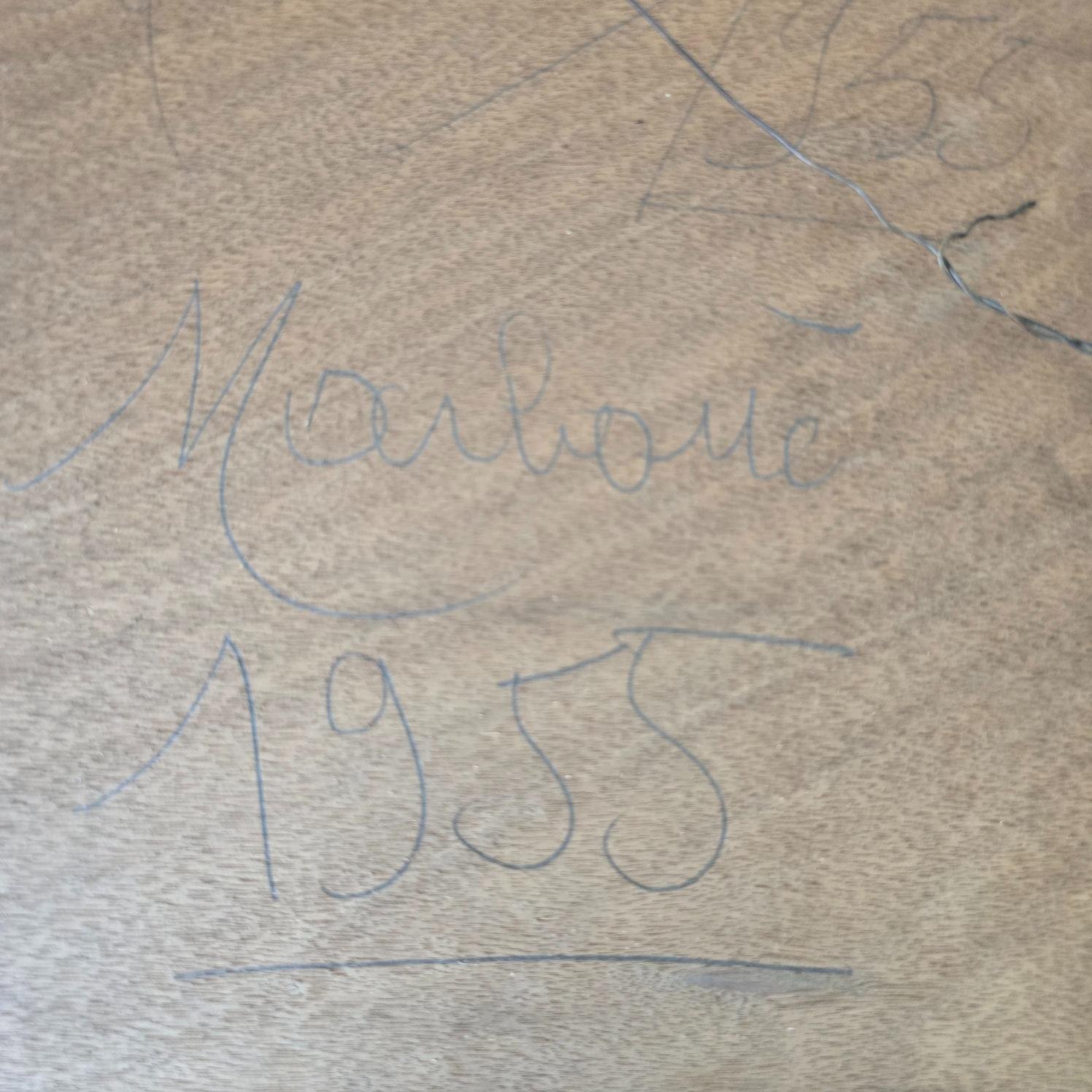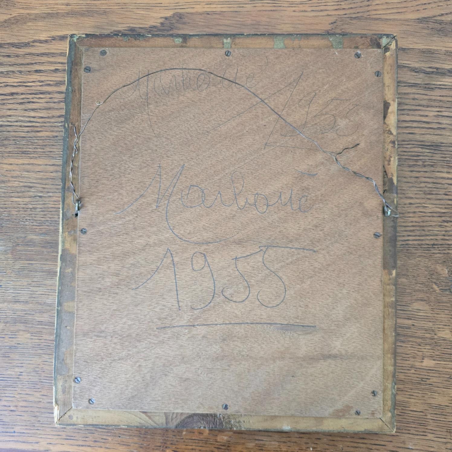 🔍 État : Plusieurs manques sur le cadre, taches d’humidité sur l’image, et un dos en bois signé à la main « 1955 », avec un accrochage en fil de fer rustique d’époque.