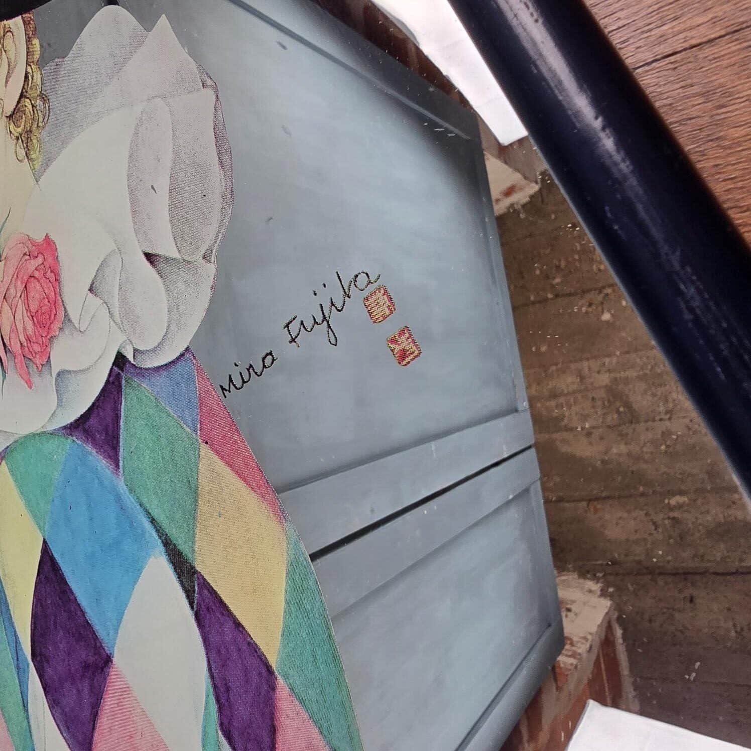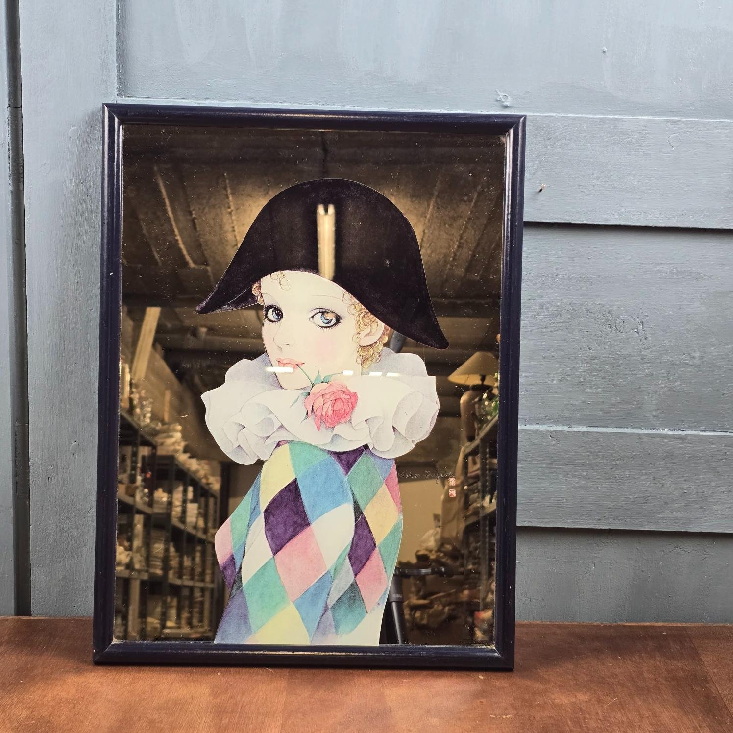 Ce grand miroir signé Miria Fujita illustre un élégant personnage d’Arlequin au visage doux, vêtu de son habit coloré et coiffé d’un large chapeau noir.