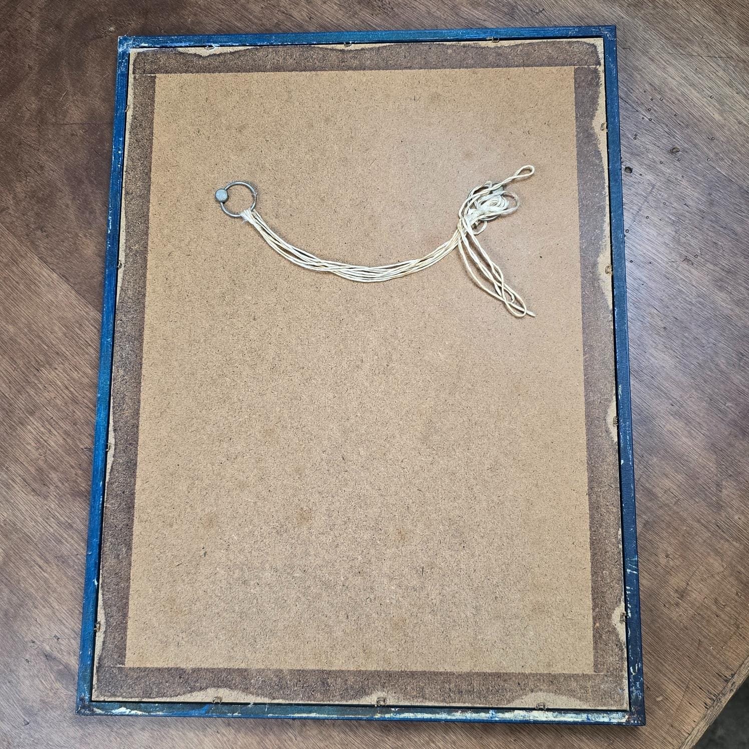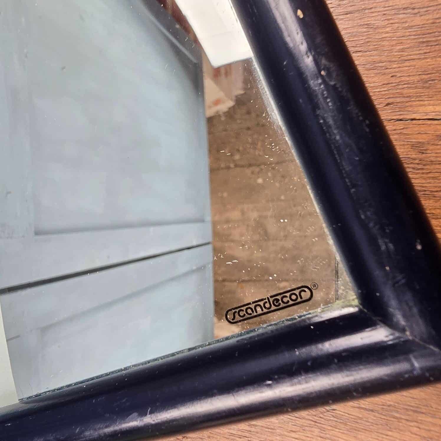 Le miroir, édité par Scandecor, est encadré d’un cadre bleu marine brillant. On note une petite griffe discrète sur le verre et un manque léger dans le noir du chapeau, détails mineurs qui n’altèrent en rien la beauté de la pièce.