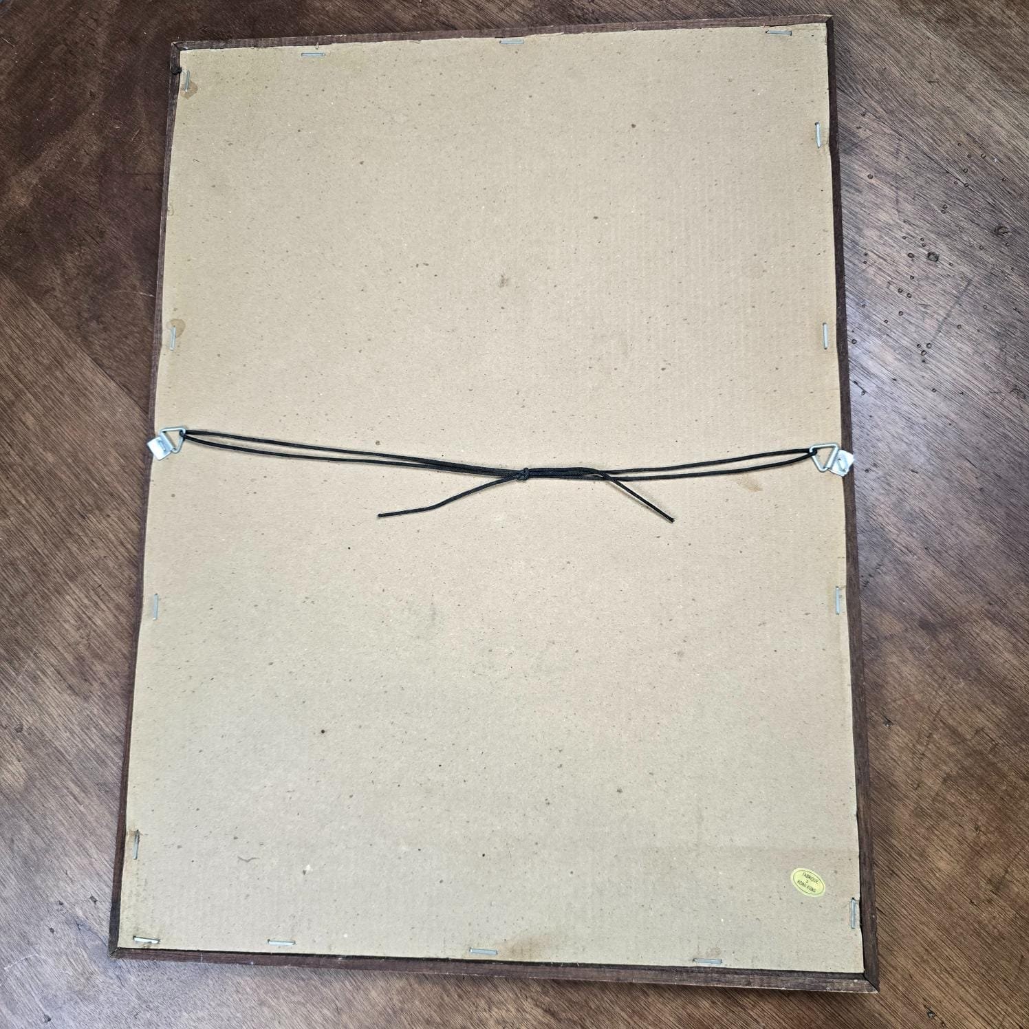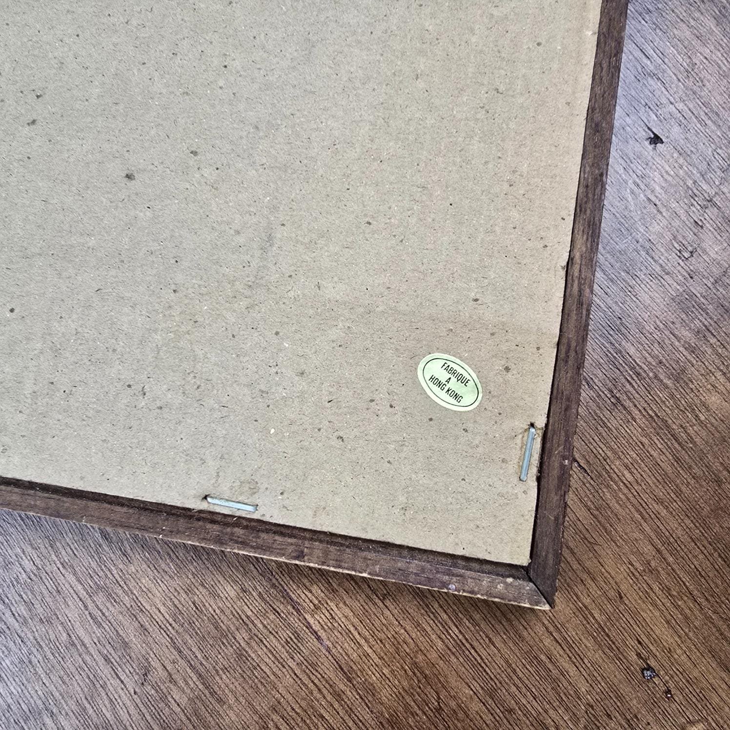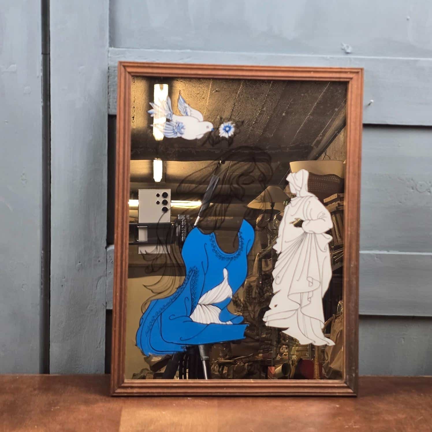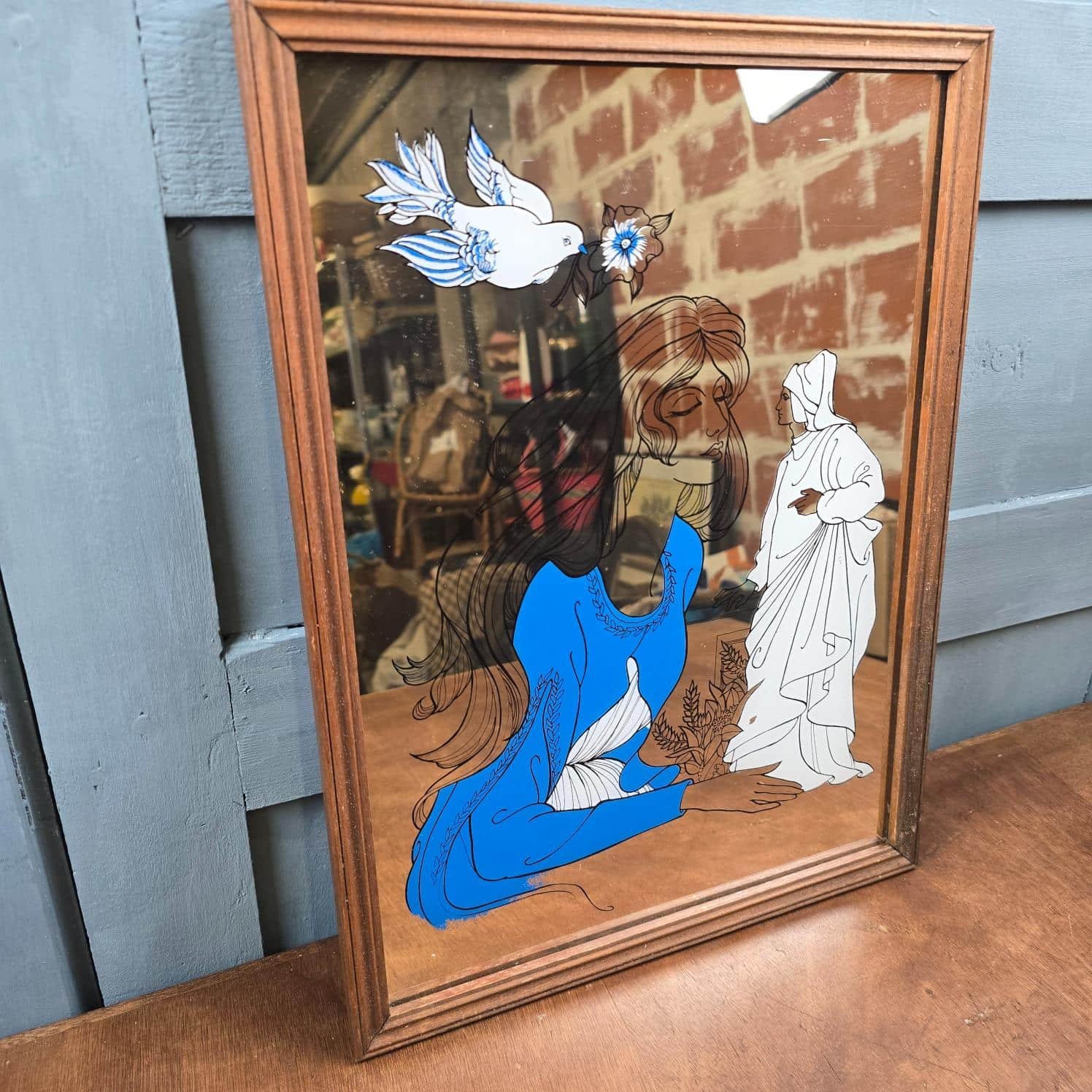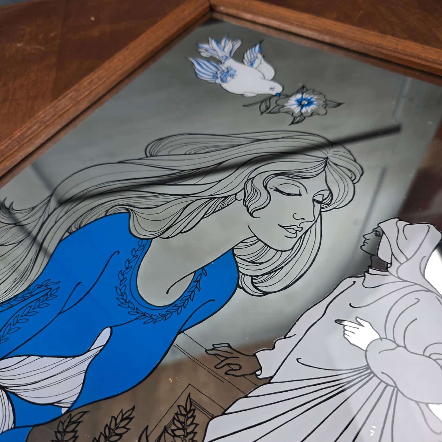Ce superbe miroir décoratif “La Messagère”, fabriqué à Hong Kong dans les années 1970, représente une femme en robe bleue s’inclinant vers une autre figure vêtue de blanc, tandis que deux colombes s’élèvent au-dessus d’elles.
