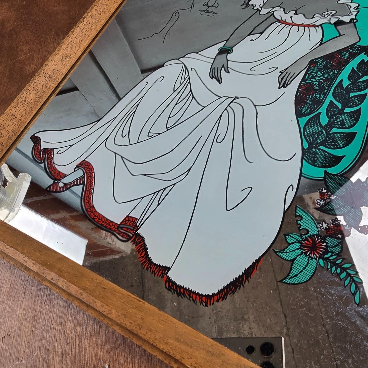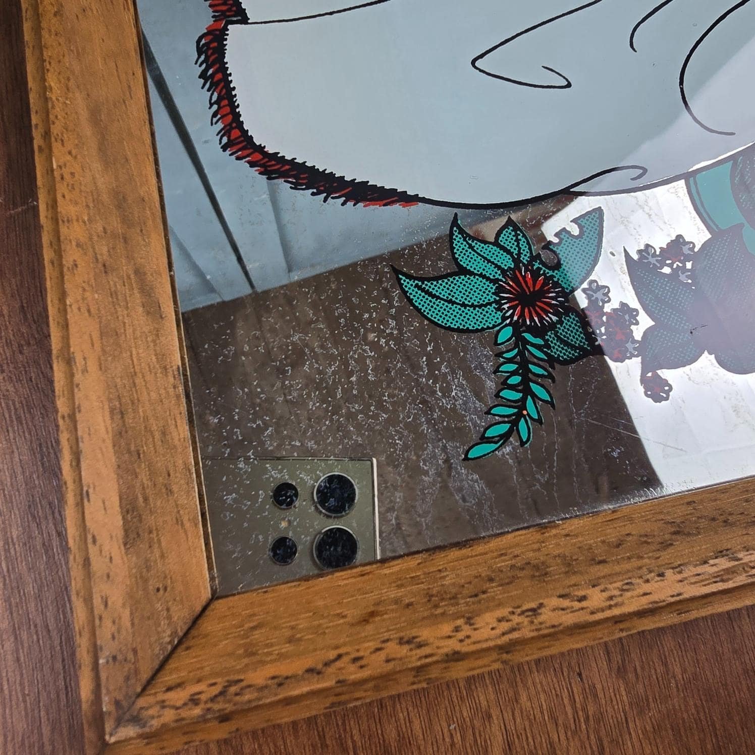 Un miroir vintage absolument irrésistible, typique des créations sérigraphiées produites à Hong Kong dans les années 1970.