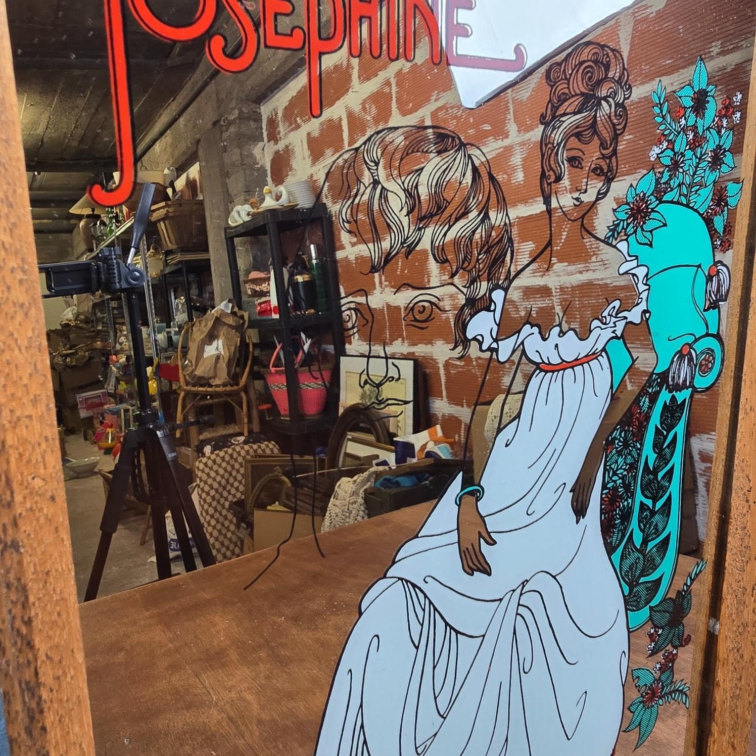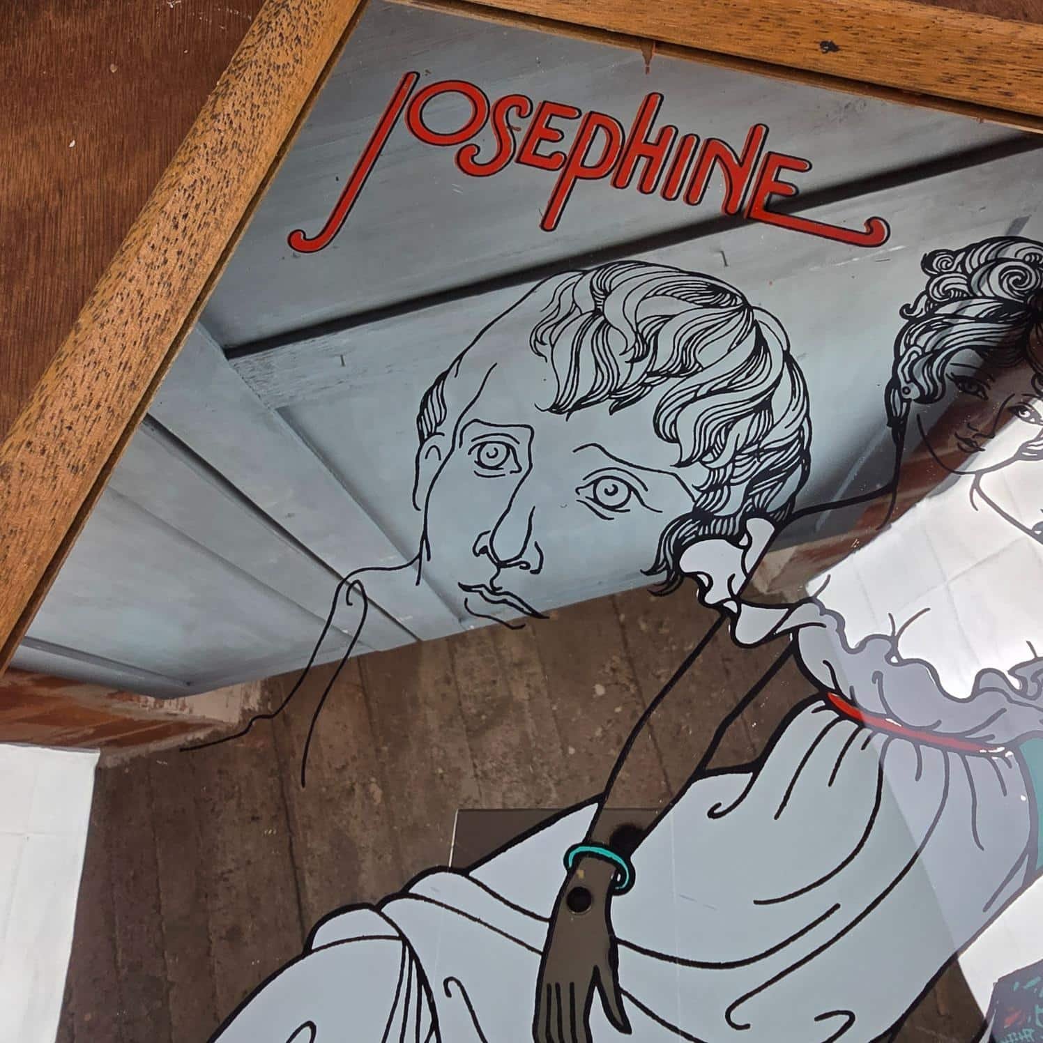 On y découvre une Joséphine moderne, silhouette élégante et cheveux relevés, entourée de fleurs turquoise et de motifs pop qui illuminent la pièce.