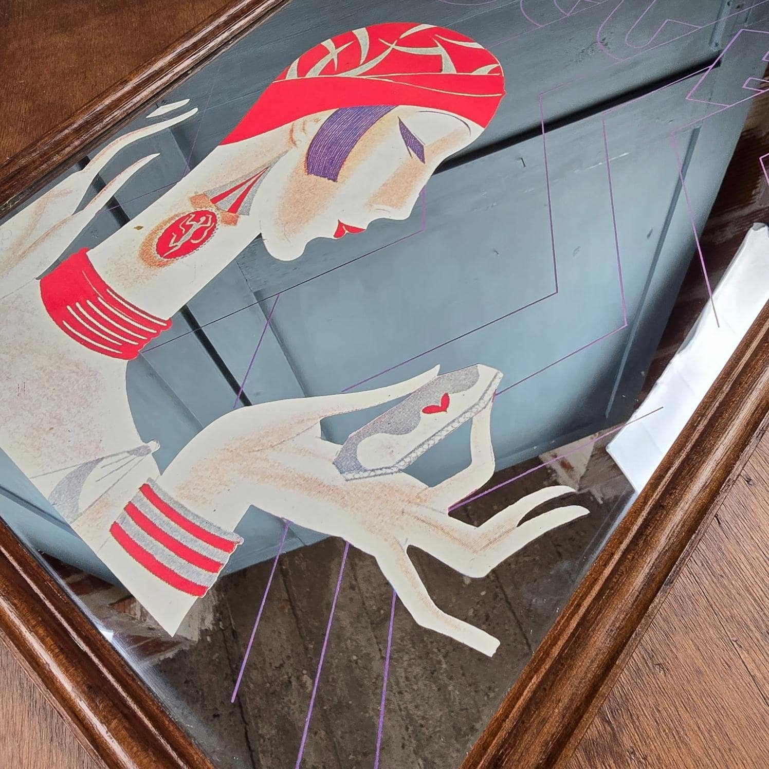La sérigraphie en nuances de rouge, violet et blanc se détache sur le miroir argenté, rappelant les affiches de mode et les couvertures emblématiques du magazine Vogue de l’époque.
