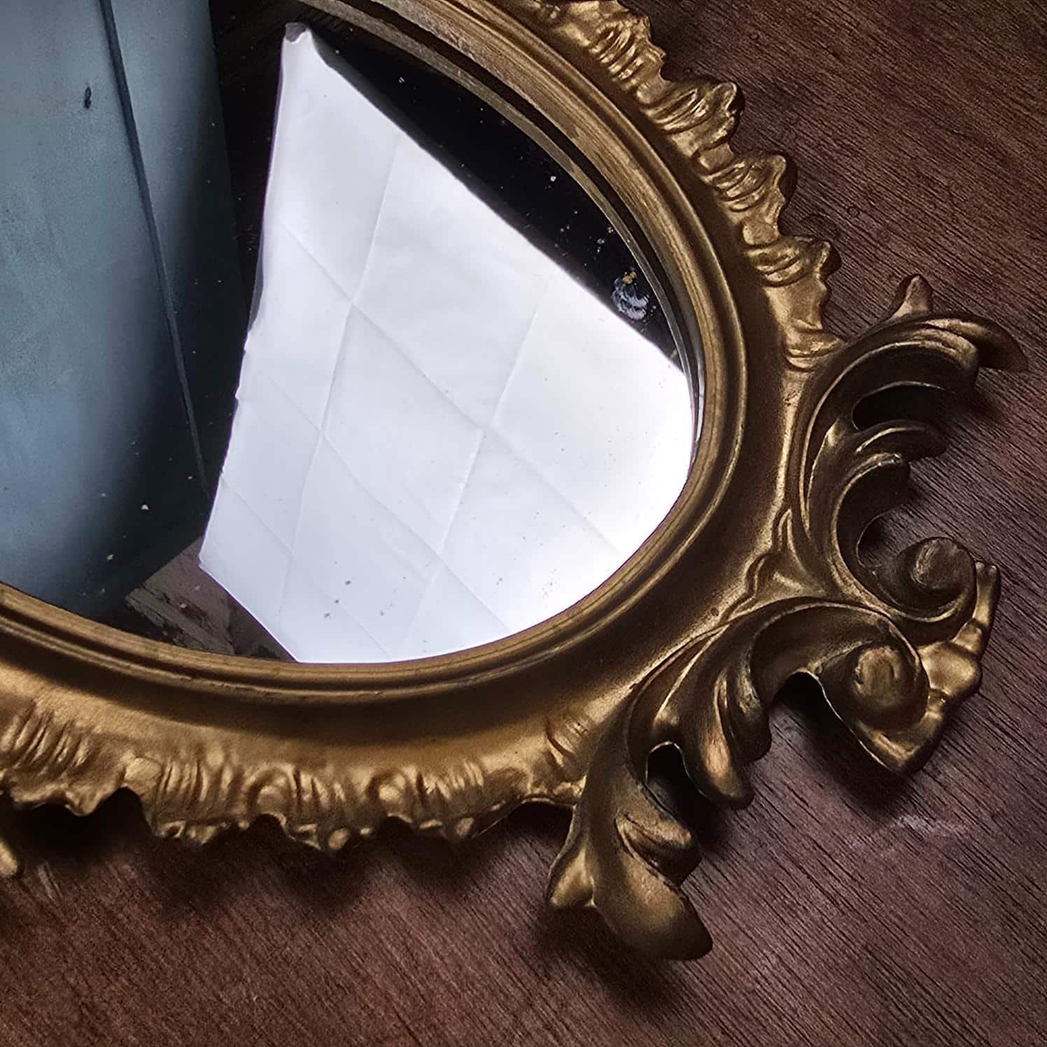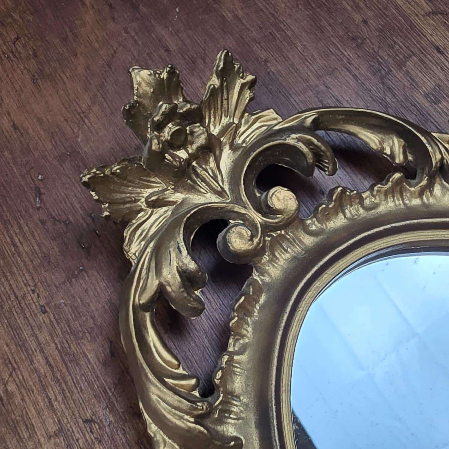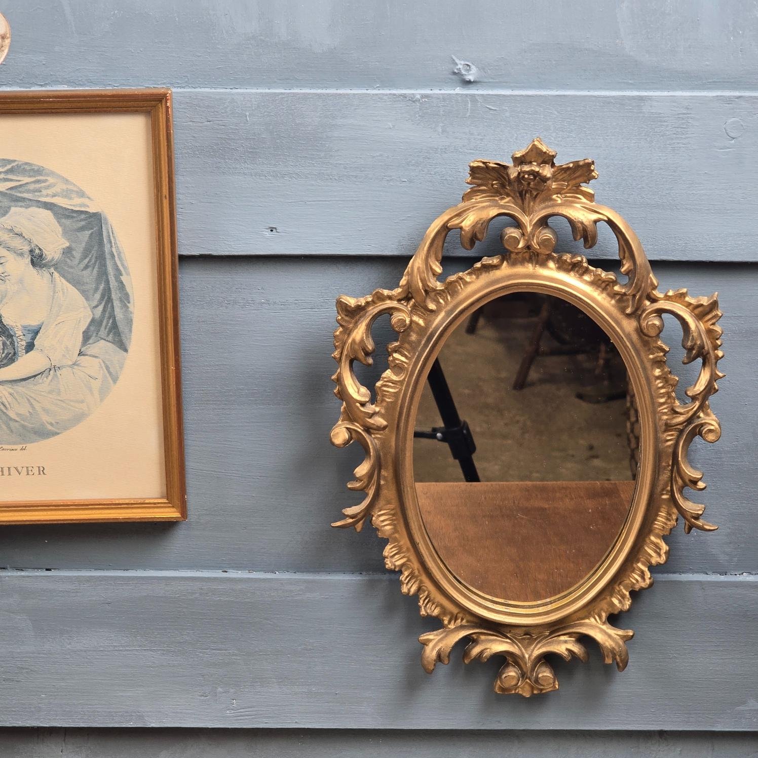 Petit miroir mural au charme baroque, dans un cadre doré à motifs rocaille. Probablement en stuc ou résine dorée, léger mais très décoratif.