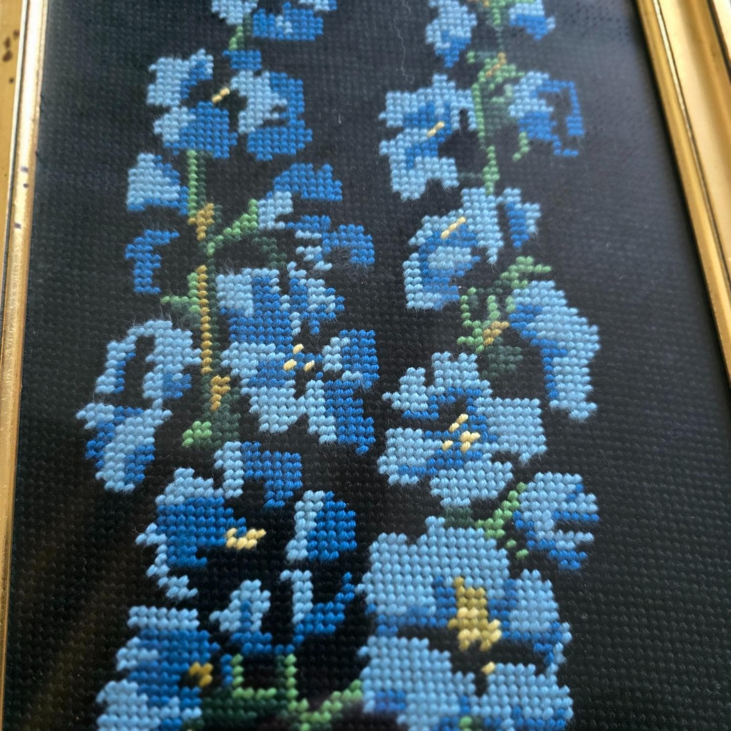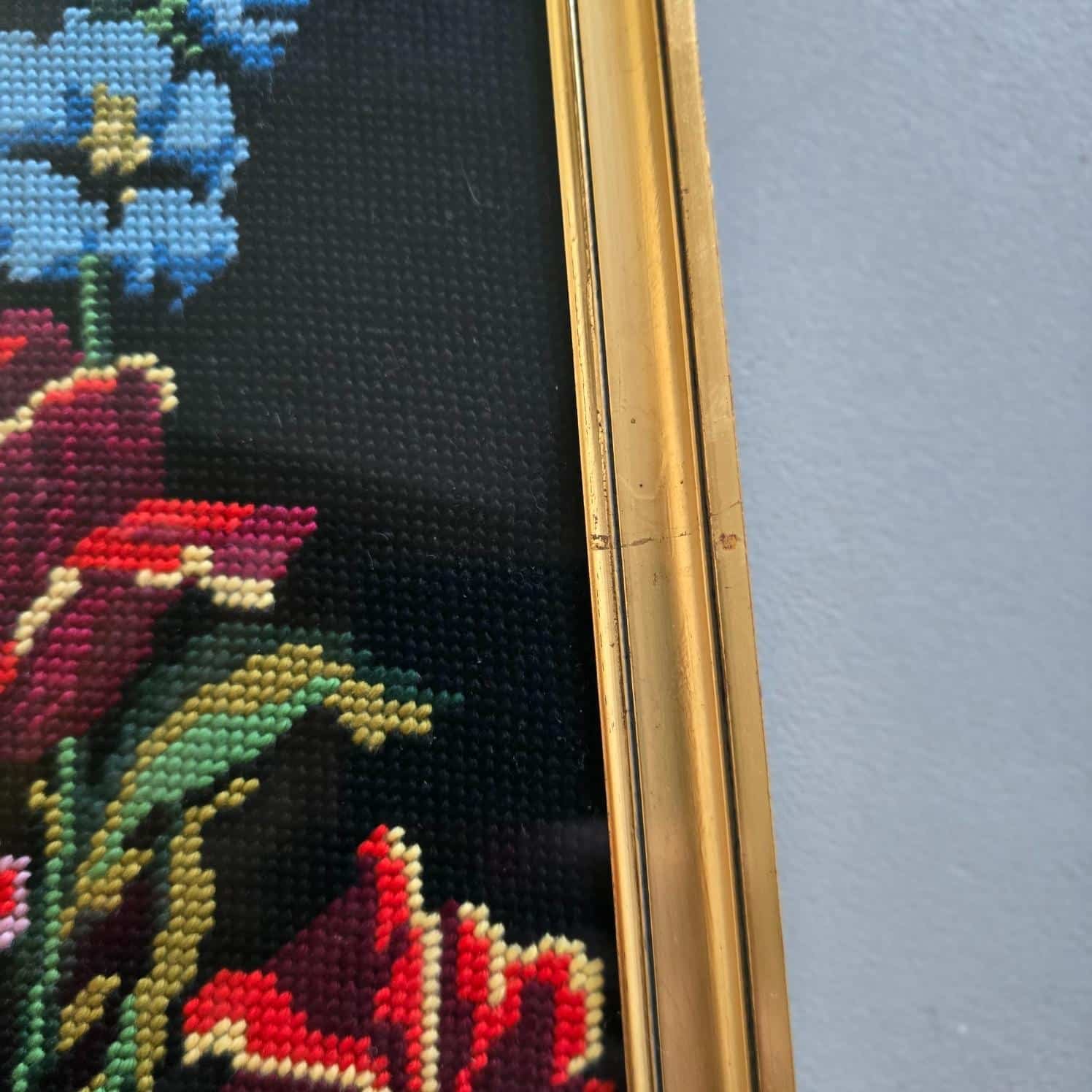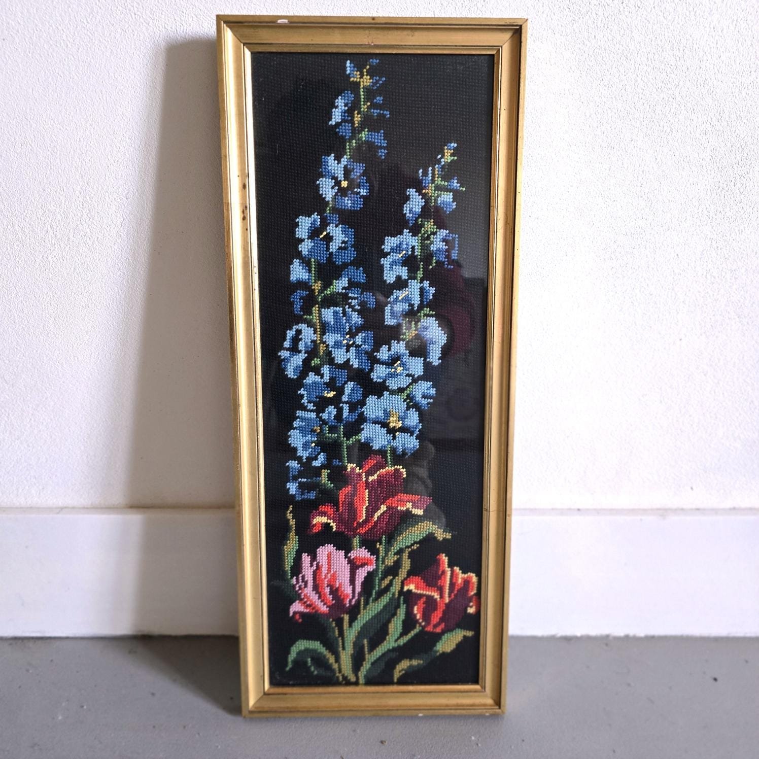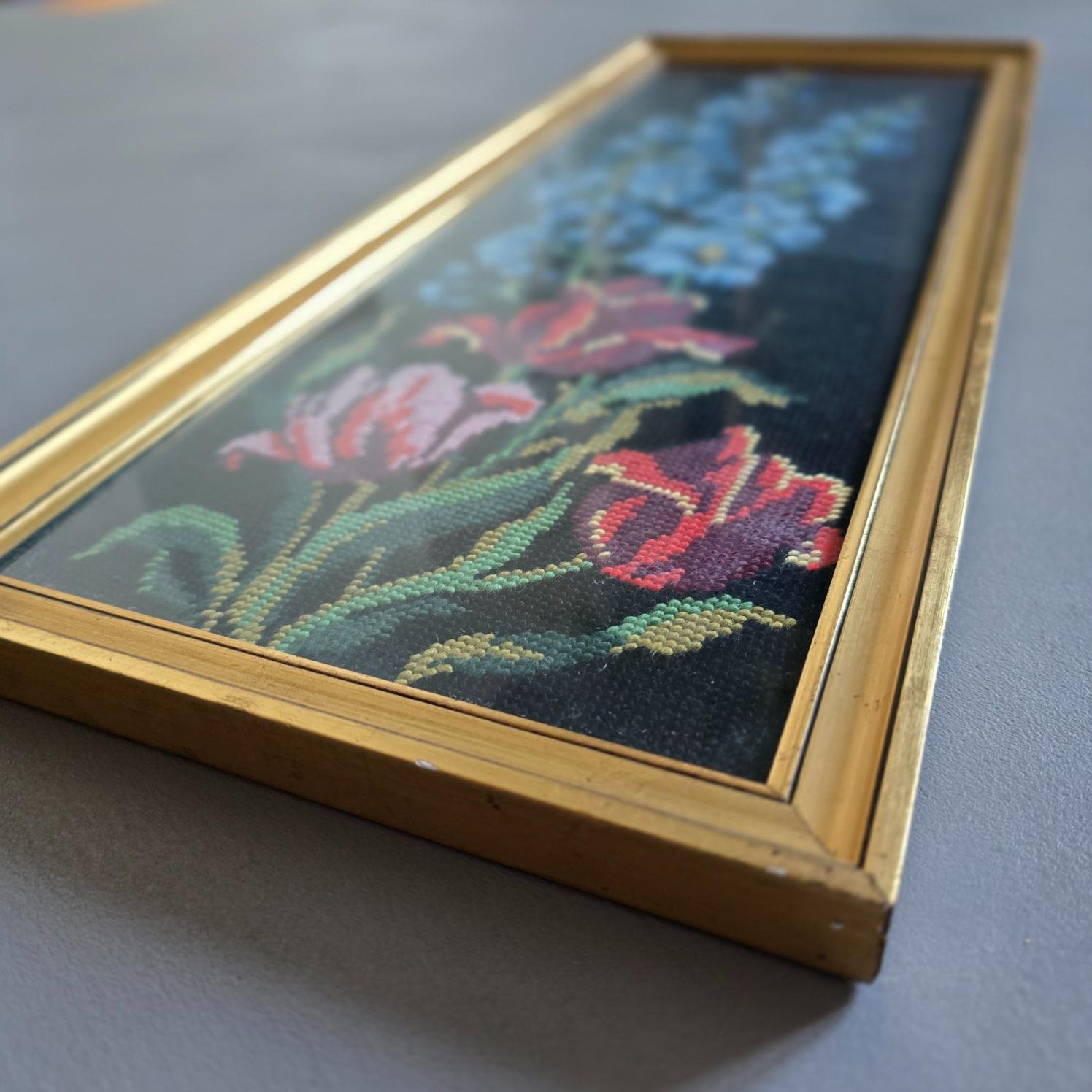 Ce cadre vintage allongé abrite un canevas aux fleurs éclatantes, dans un superbe contraste de bleus, rouges et roses sur fond noir. Le motif est délicat, très travaillé, avec une verticalité élégante qui rappelle les tableaux botaniques anciens.