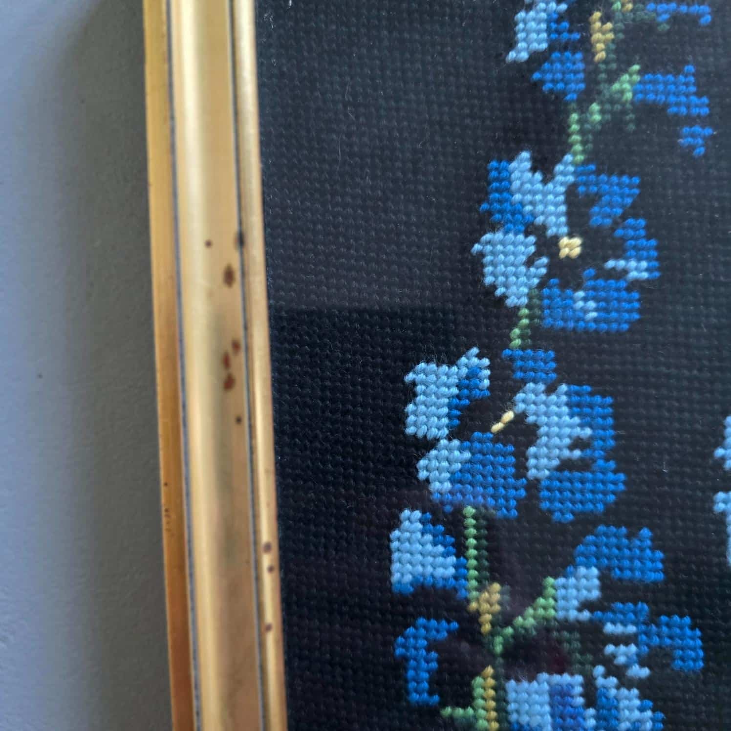 Cadre doré – Canevas fleurs bleues & roses sur fond noir
