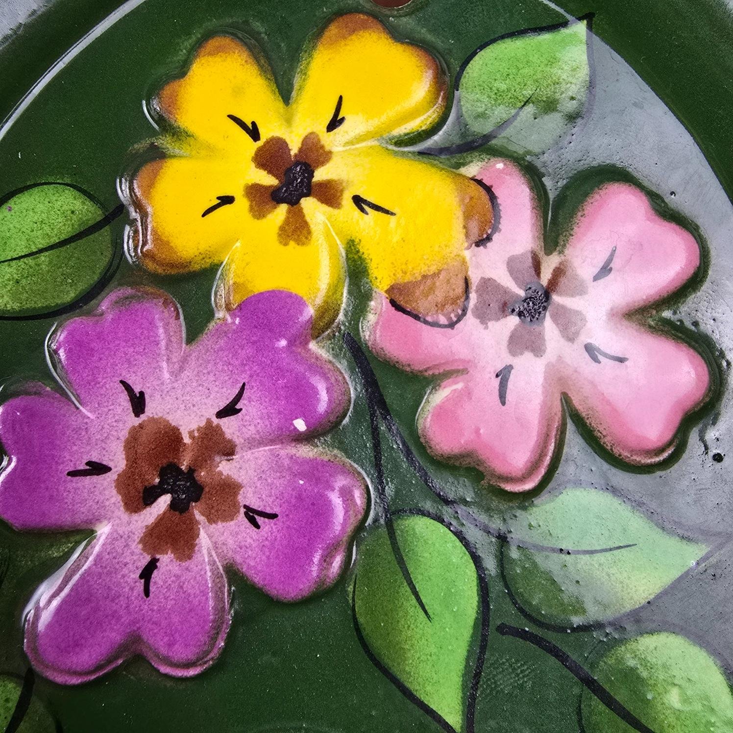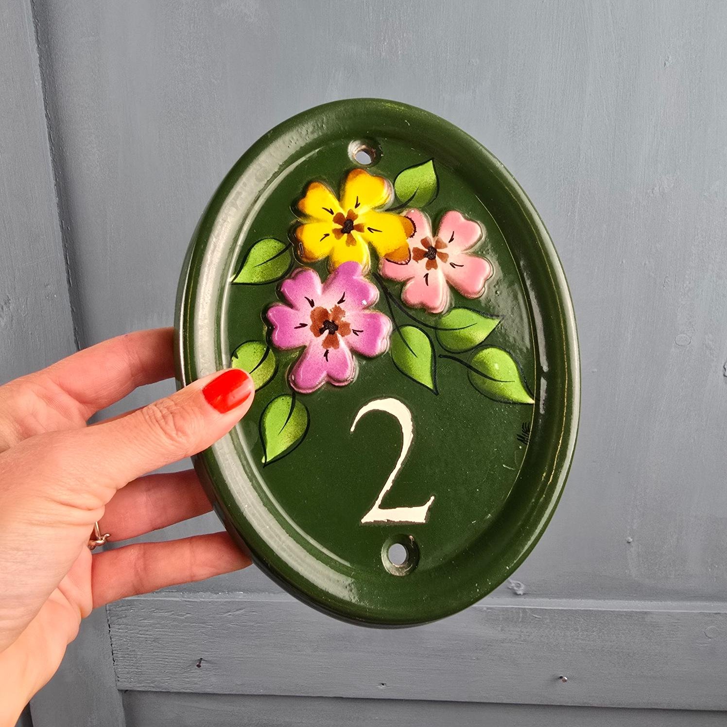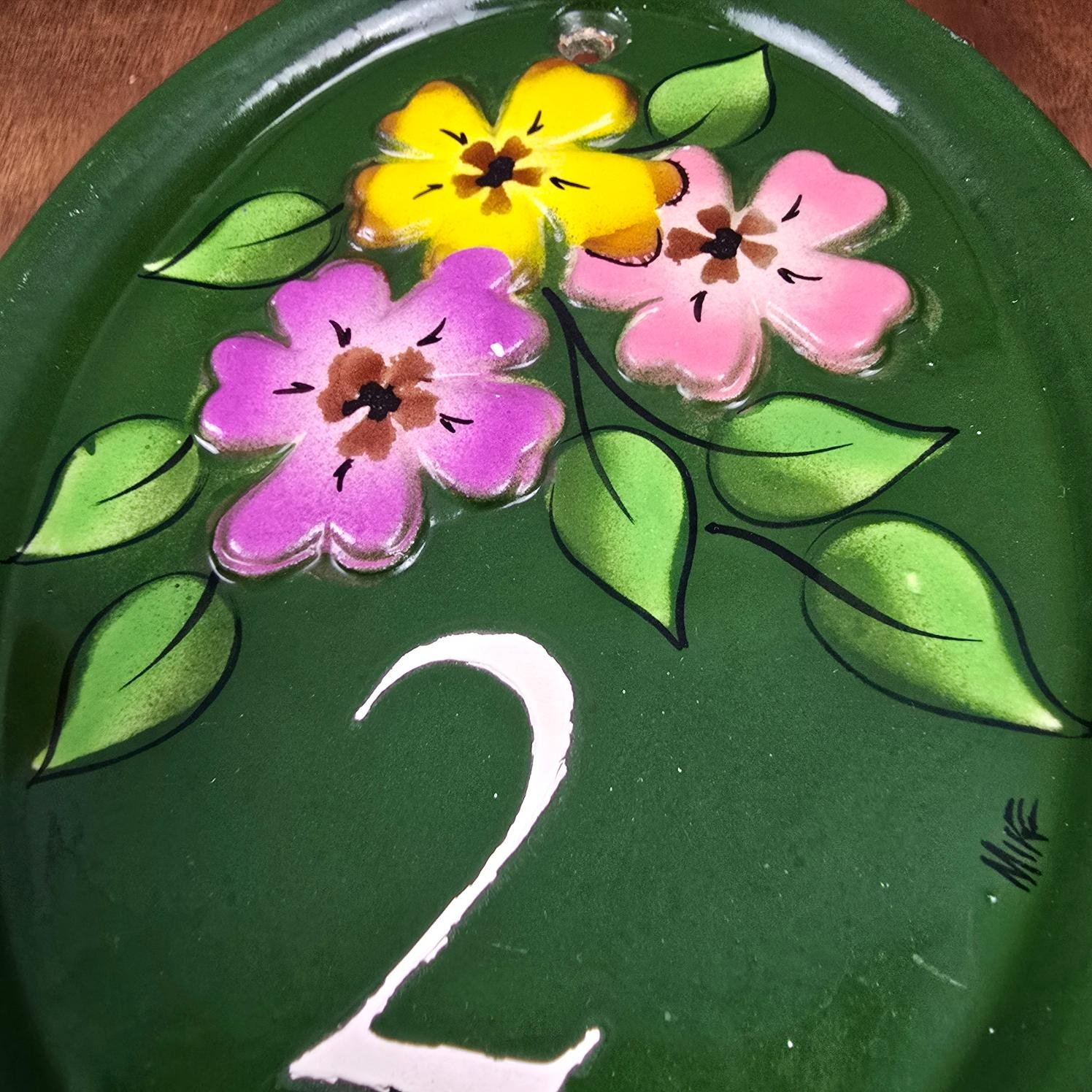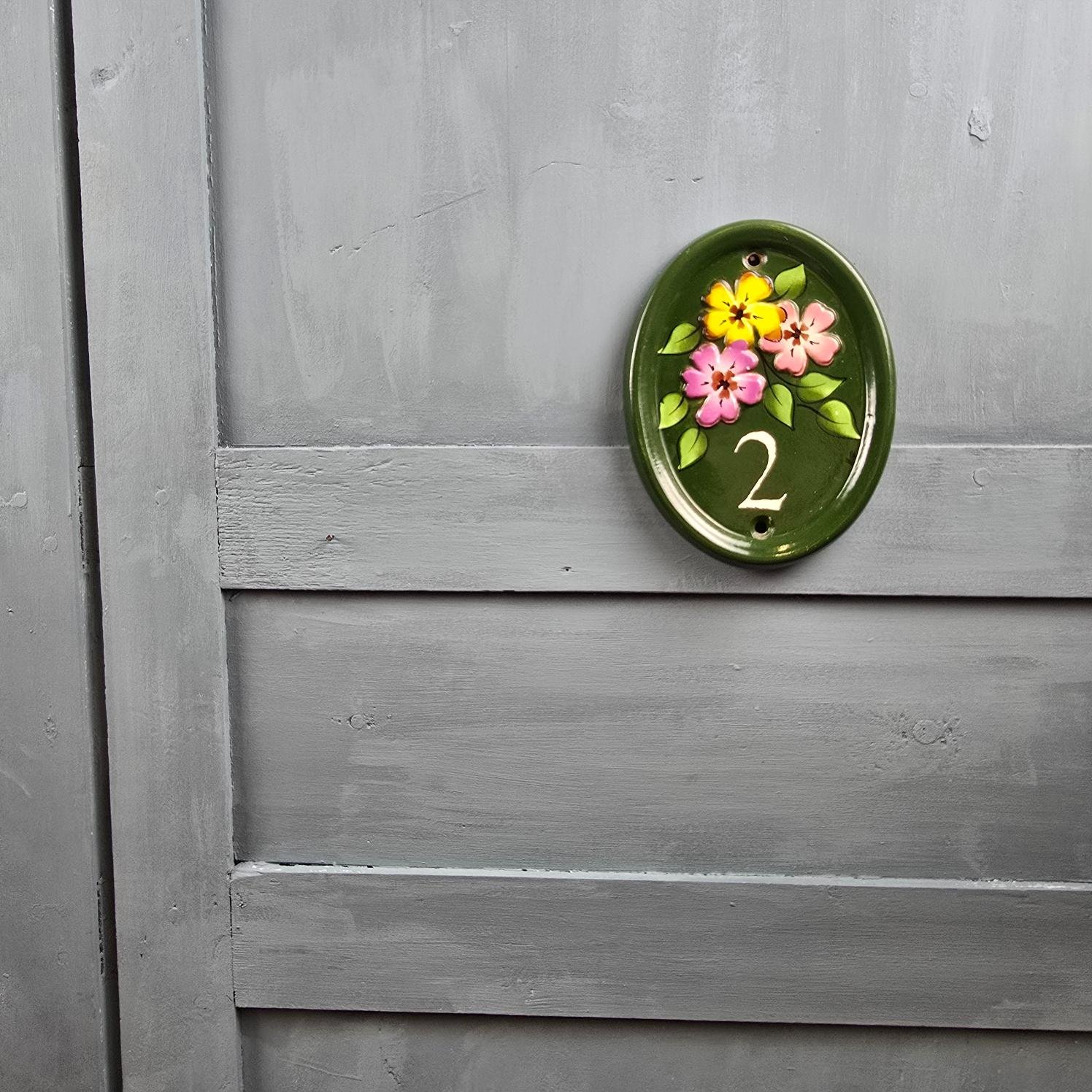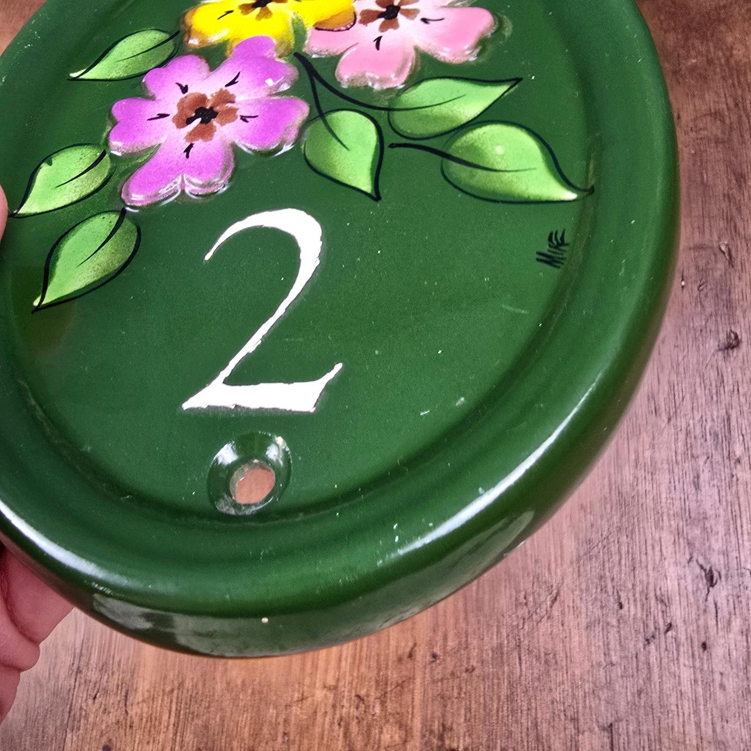 Cette jolie plaque de porte en céramique émaillée verte, peinte à la main, porte fièrement le numéro 2 entouré d’un bouquet de fleurs colorées : violette, rose et jaune.