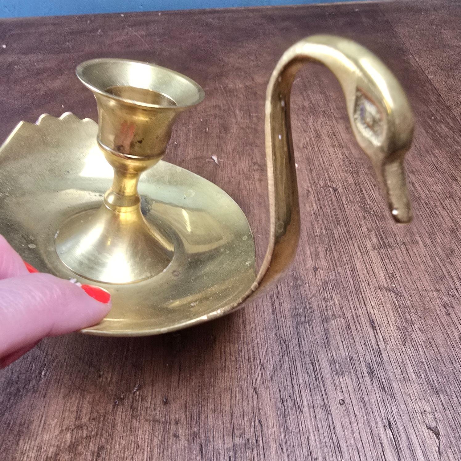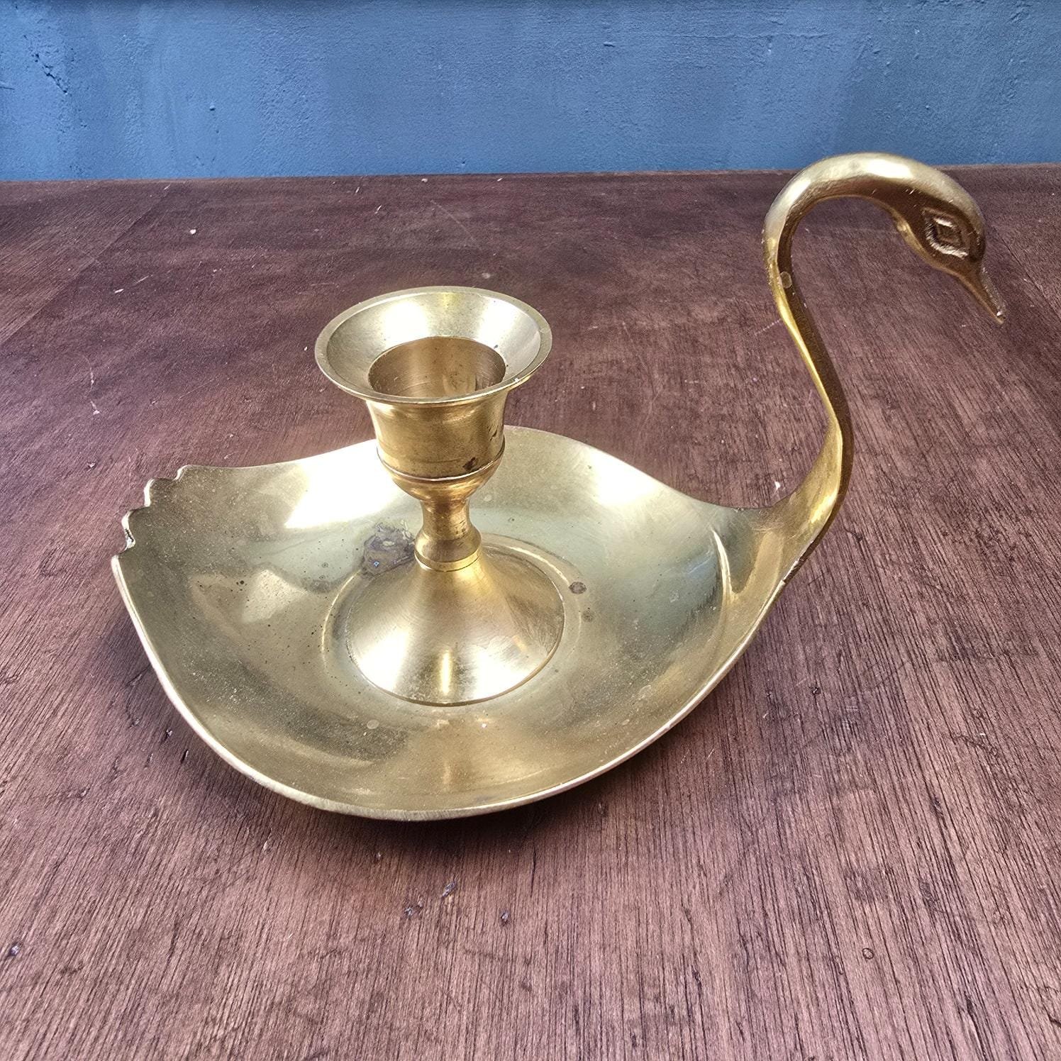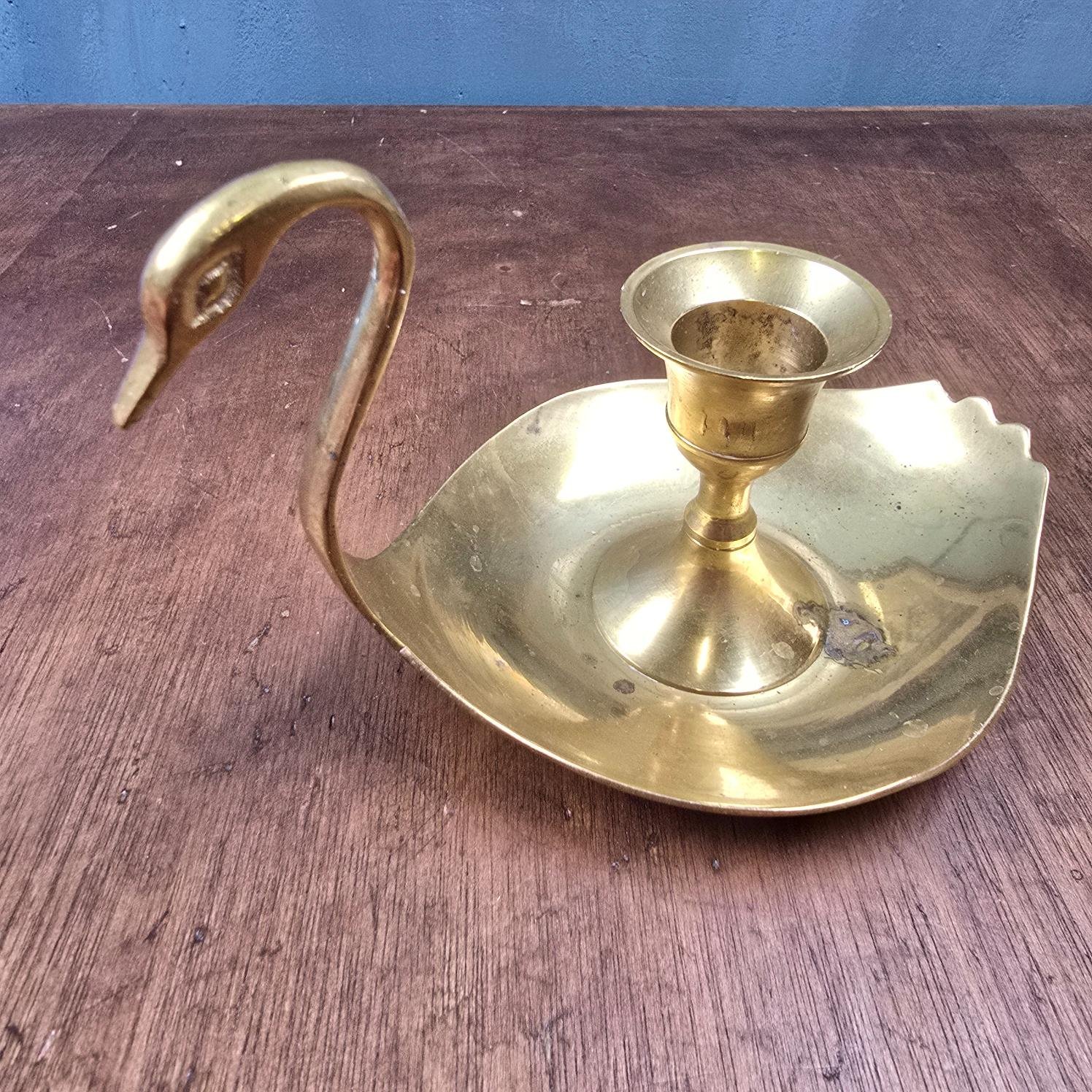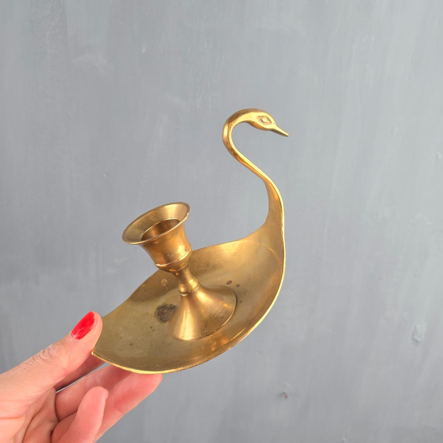 Bougeoir vintage en laiton doré, au design raffiné figurant un cygne à la silhouette élancée.