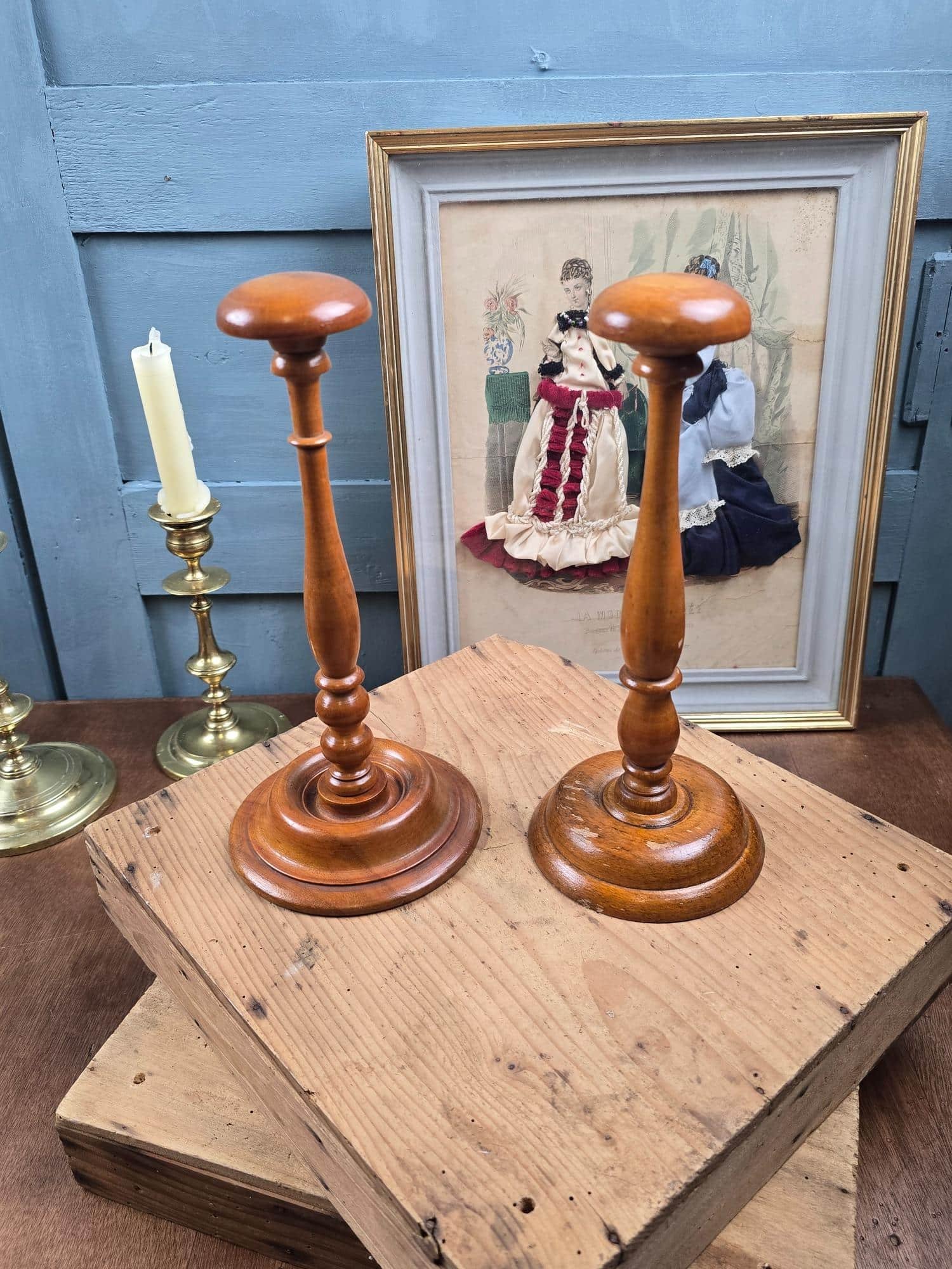 Les supports en bois tourné étaient indispensables dans les boutiques de modistes et les ateliers de couture du milieu XXe (années 1940–1960). Leur tournage manuel rend chaque pièce légèrement différente, ce qui en fait aujourd’hui des objets décoratifs très appréciés.