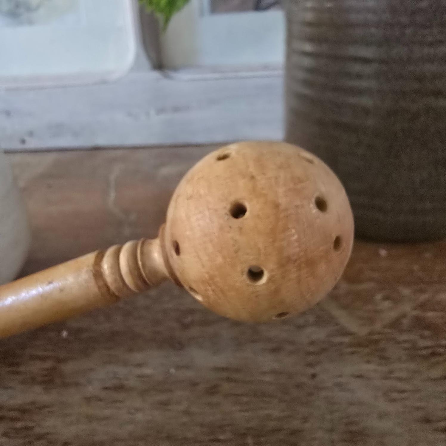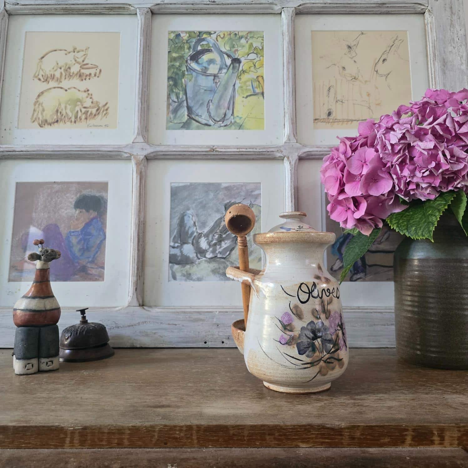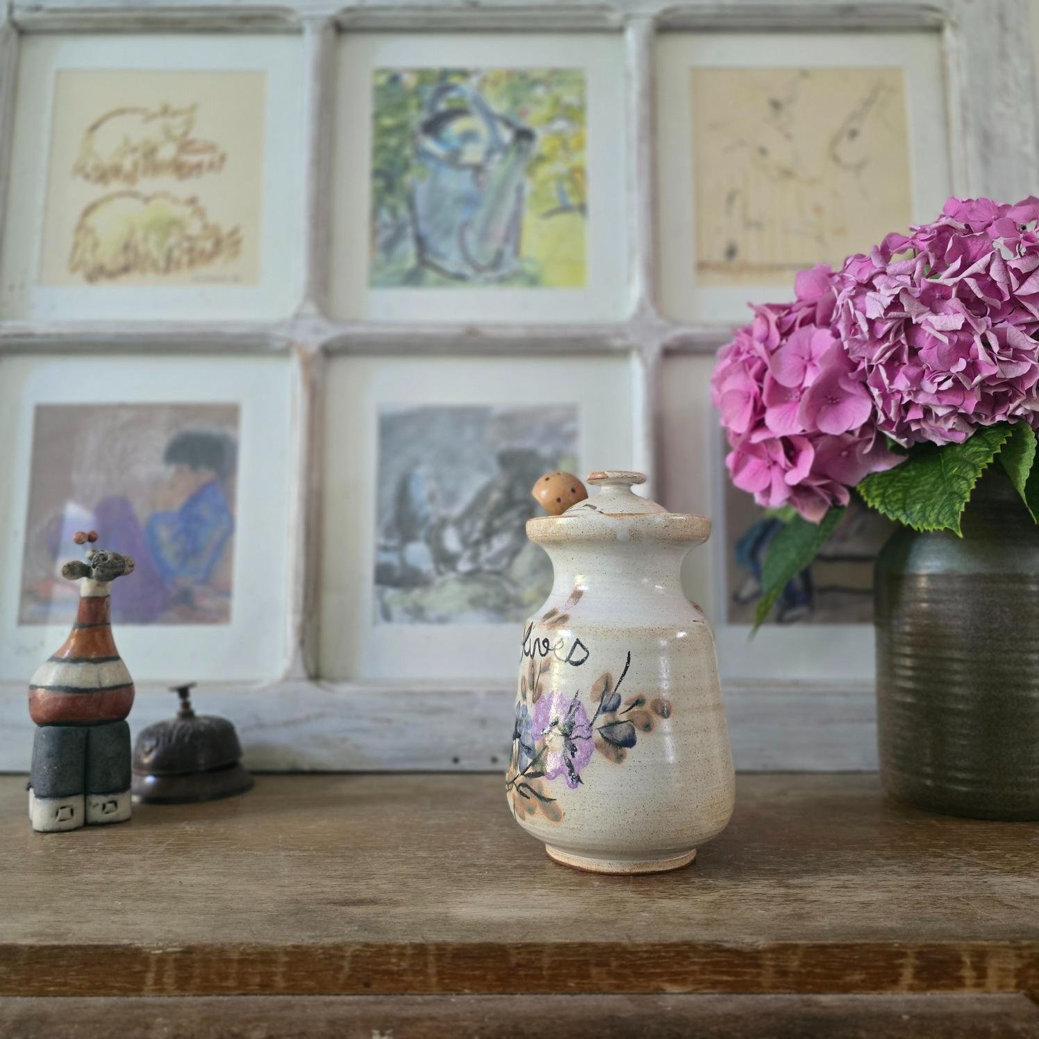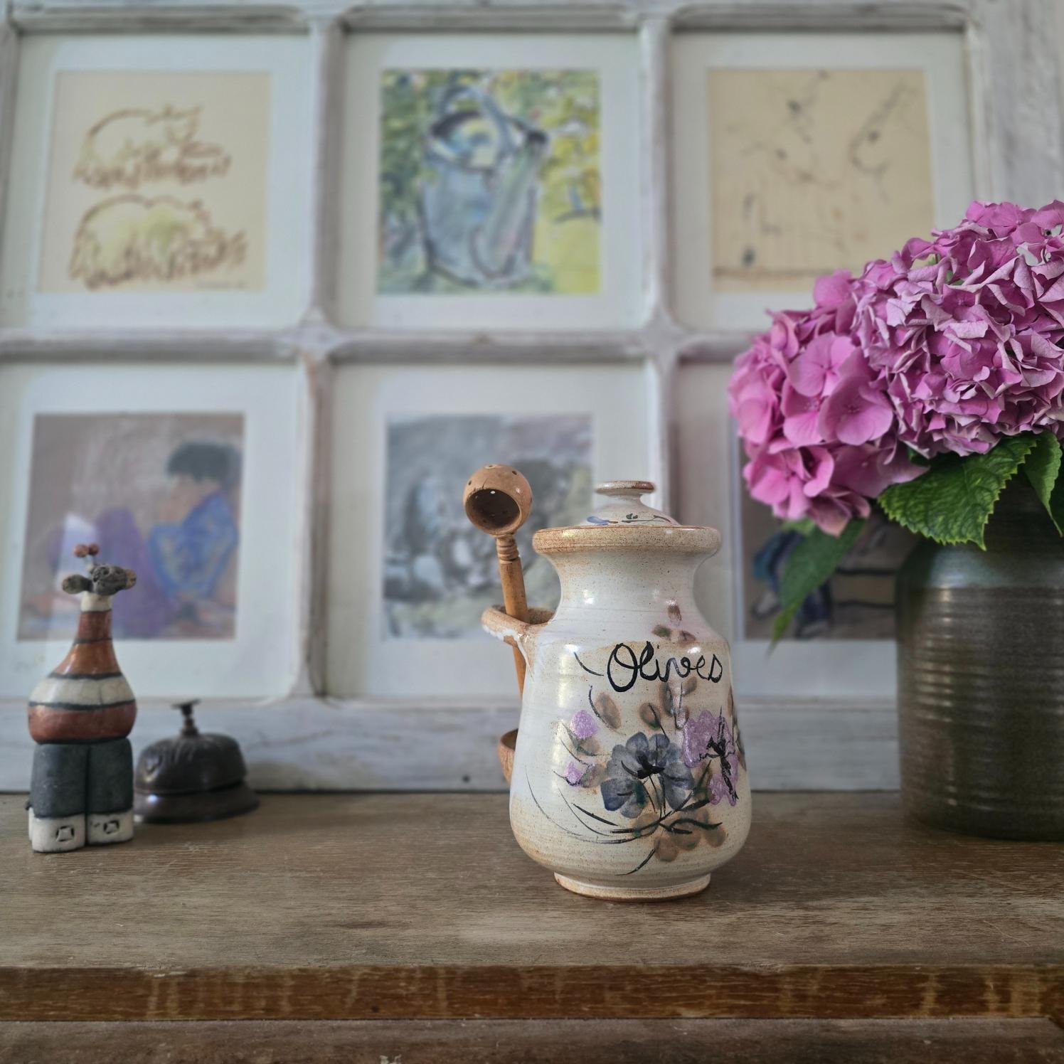Ce joli pot à olives en grès émaillé allie charme rustique et utilité. Avec ses décors floraux peints à la main dans des tons de violet, bleu et vert, il évoque les marchés du Sud et les cuisines conviviales. La cuillère d’origine en bois, perforée pour égoutter les olives, présente une fêle visible, mais l’ensemble semble n’avoir jamais servi. Le pot, lui, est en excellent état.