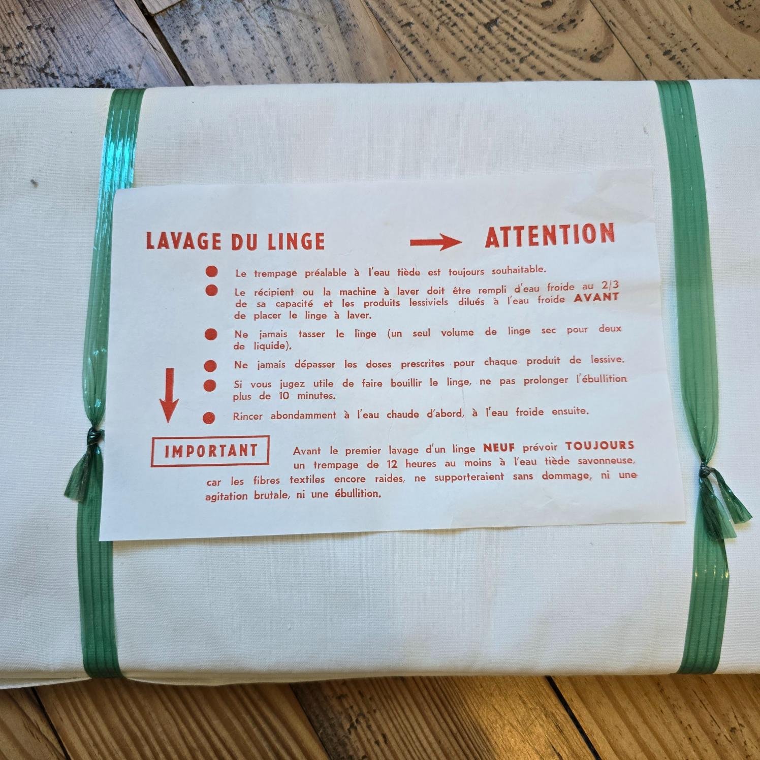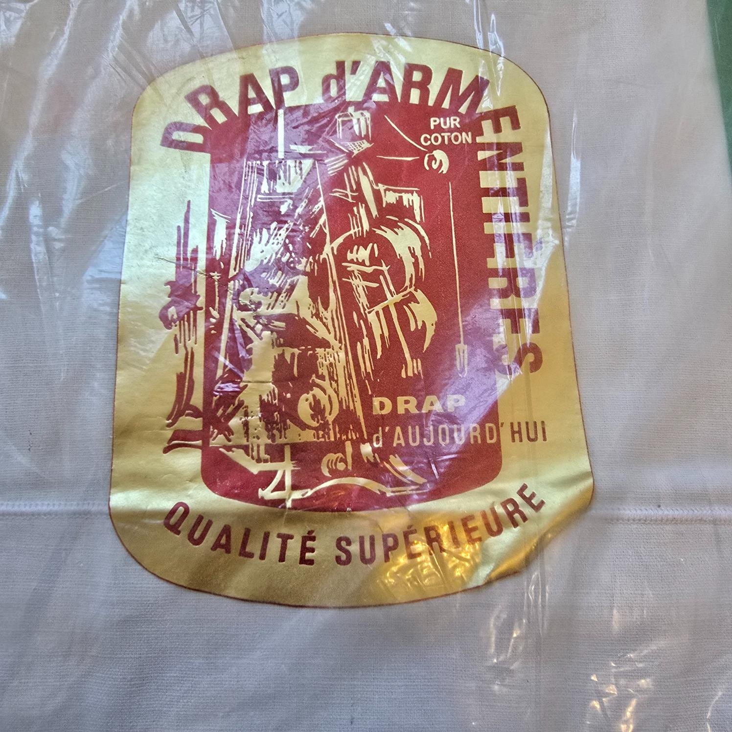 Son étiquette dorée et rouge “Drap d’aujourd’hui – Qualité supérieure – Pur coton – Broderie mécanique” est intacte, tout comme la notice d’entretien d’origine au verso.