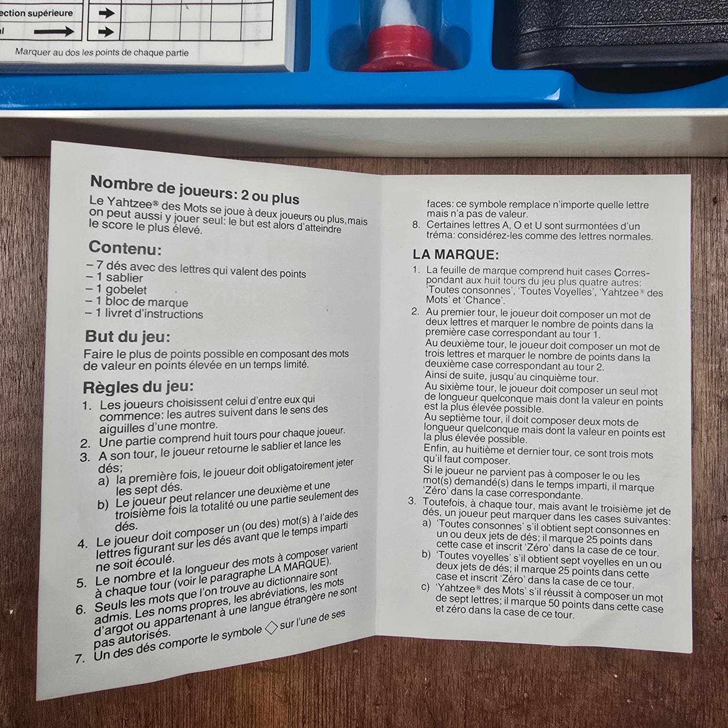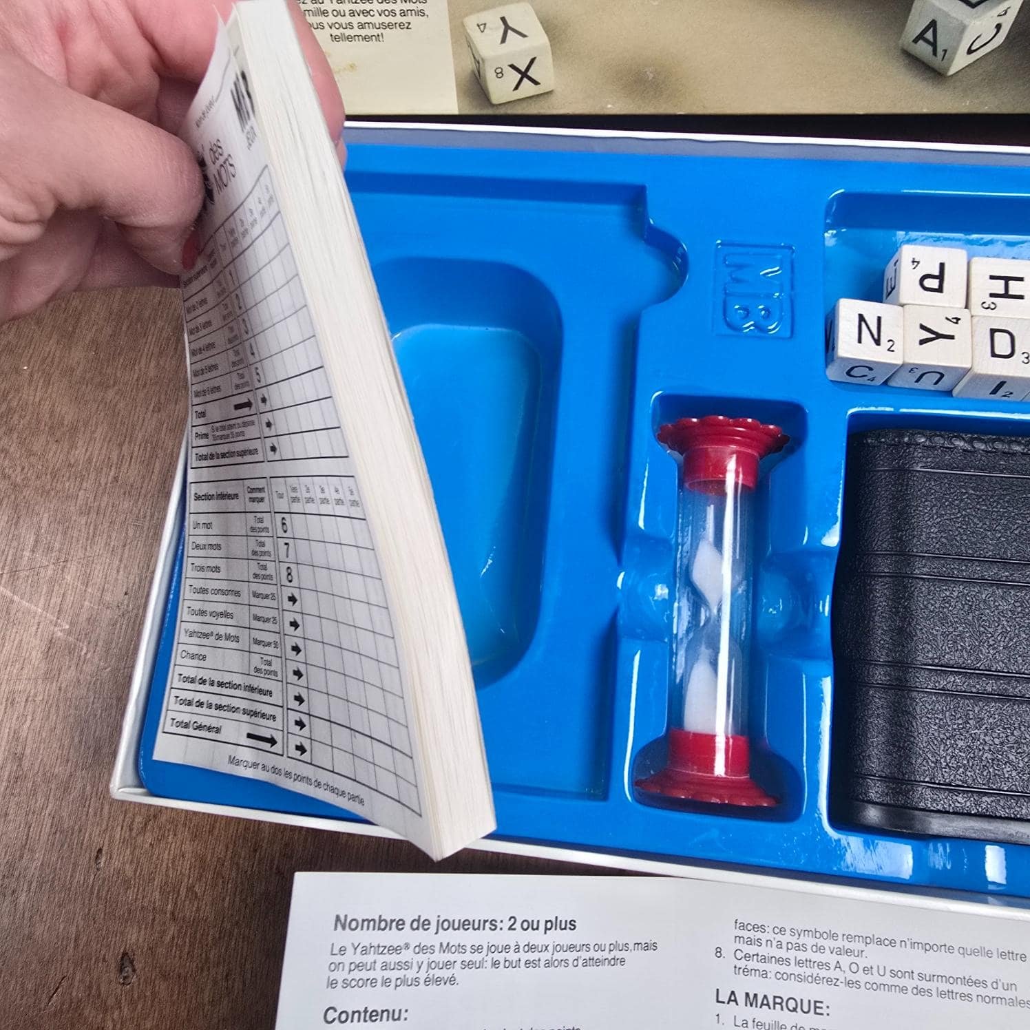 Avec son sablier encore parfaitement fonctionnel, ses dés lettres au charme rétro et son bloc de feuilles intact, ce Yahtzee des Mots semble tout droit sorti d’un placard où il aurait dormi des décennies, soigneusement préservé.