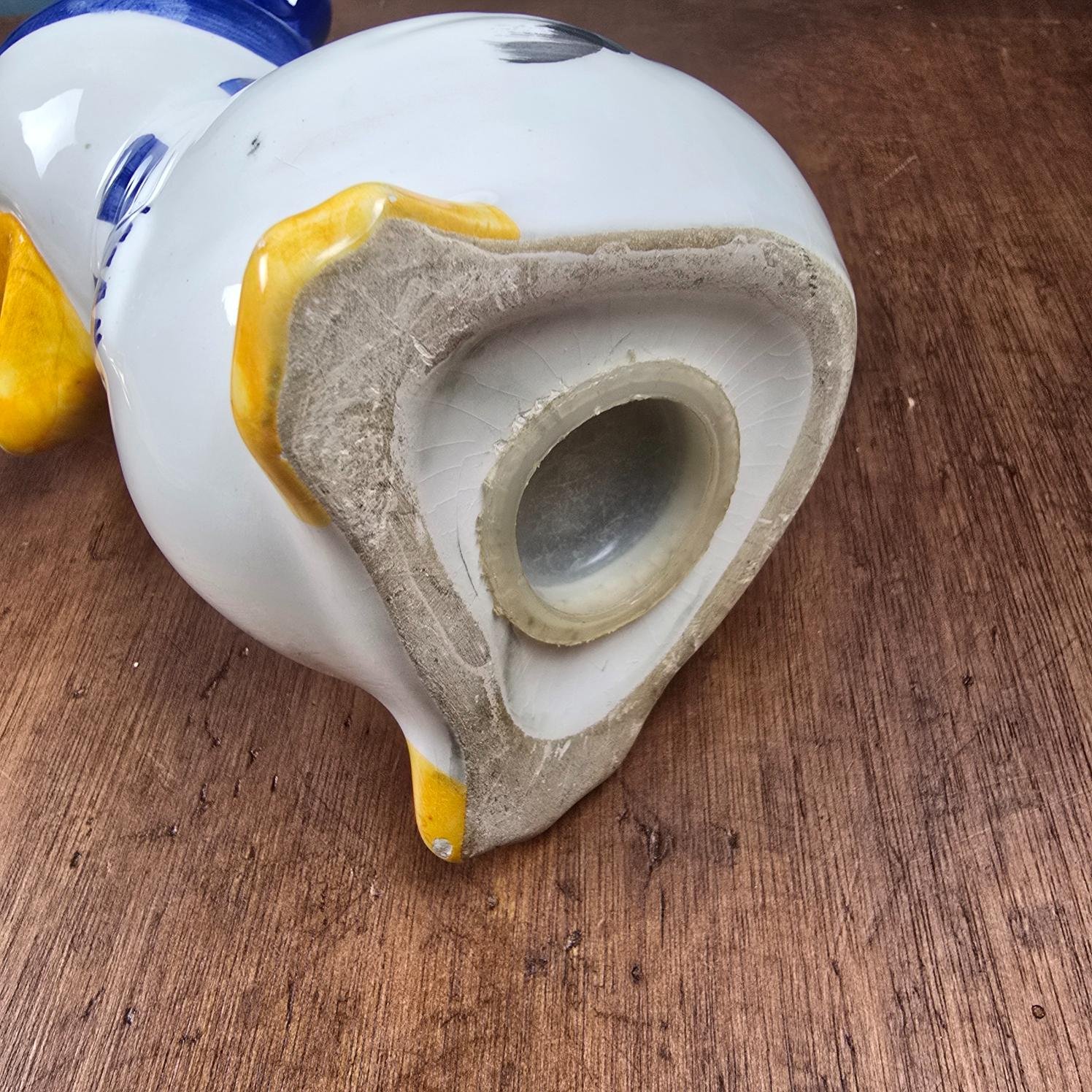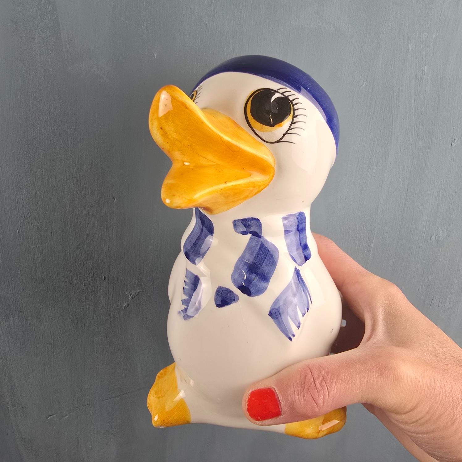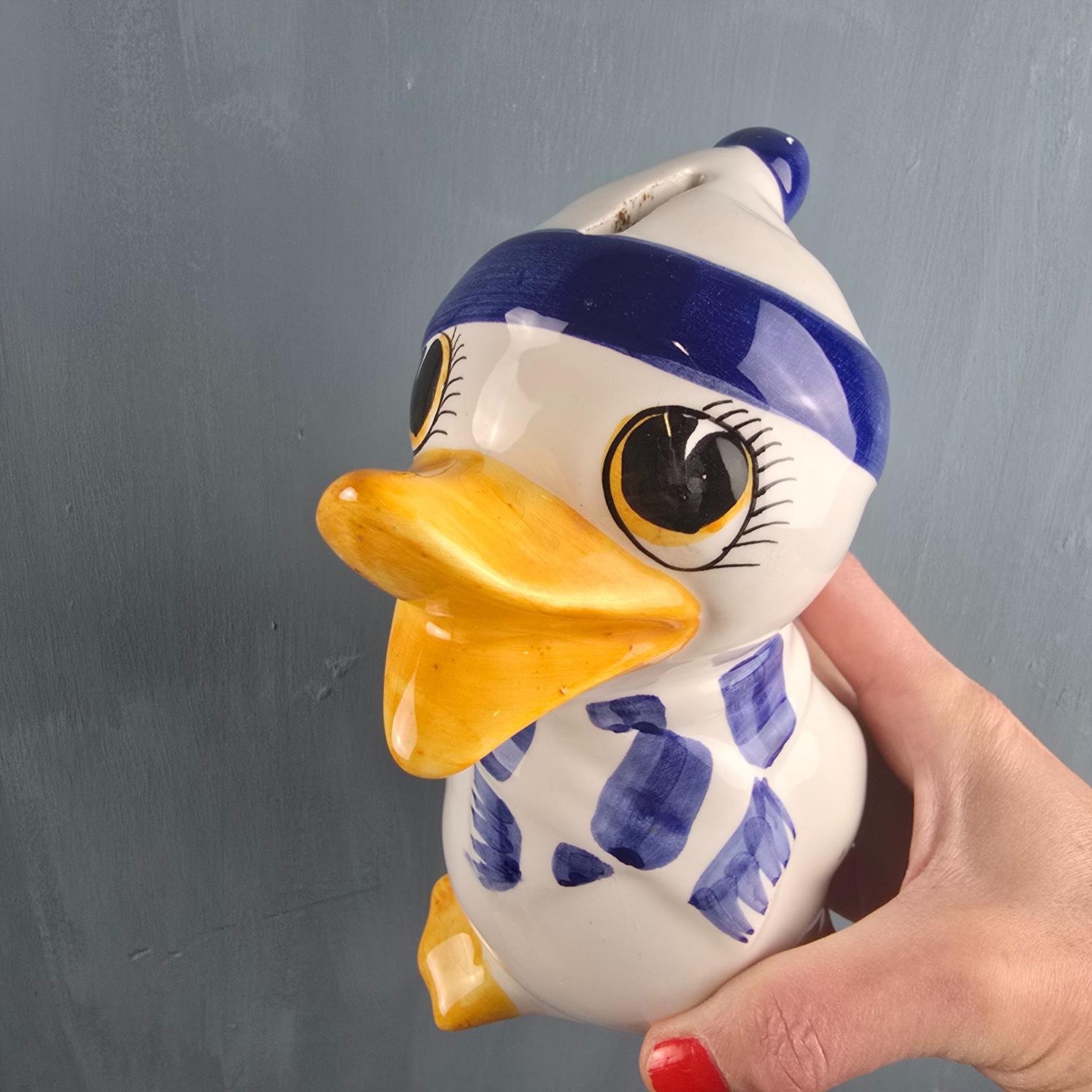 Charmante tirelire ancienne en céramique représentant un petit canard à bonnet bleu et grand sourire.