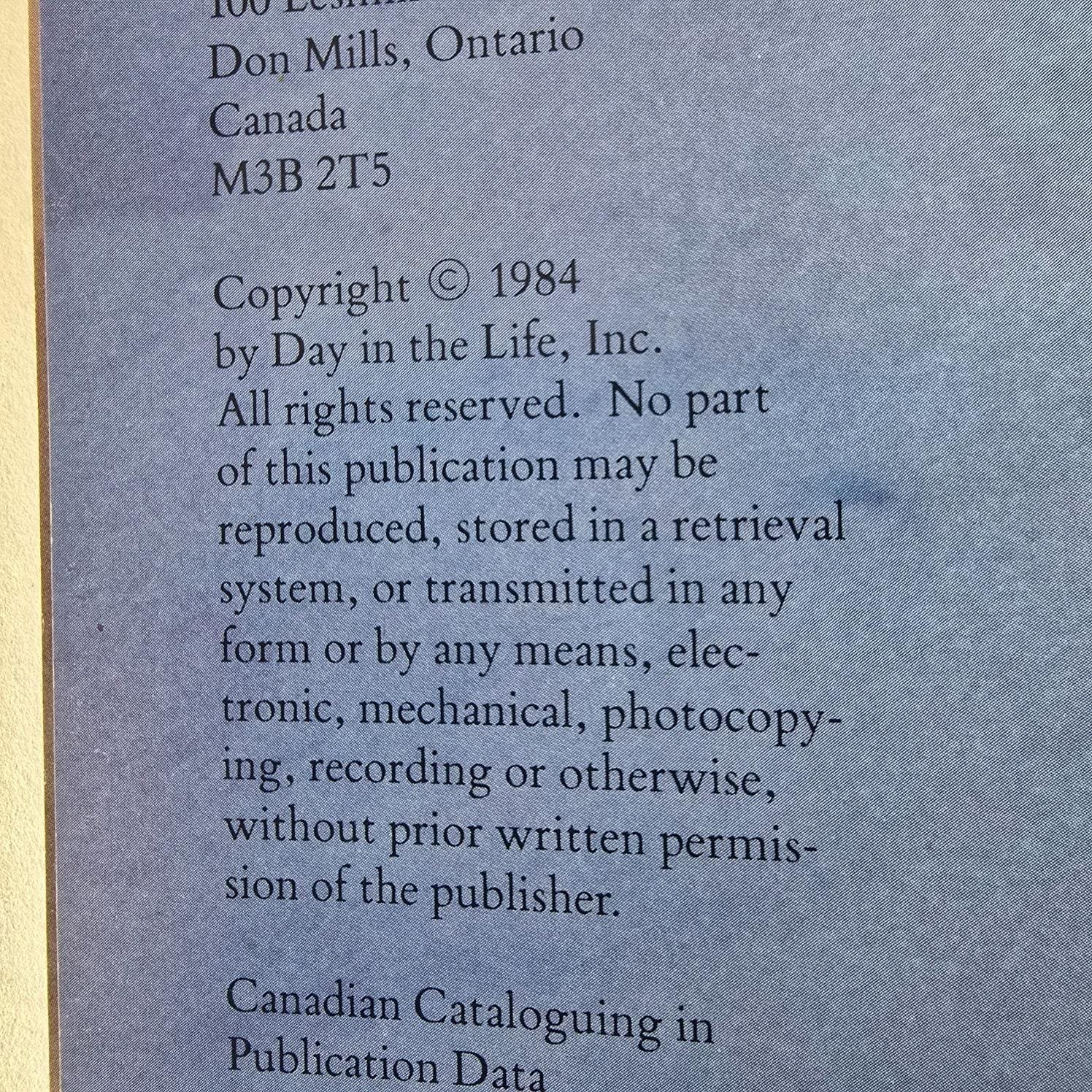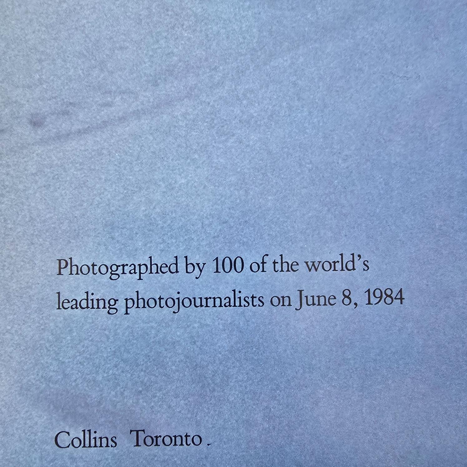 Édité en 1984 par Day in the Life, Inc., ce superbe ouvrage en langue anglaise réunit les clichés de 100 des plus grands photojournalistes du monde, tous pris le même jour : le 8 juin 1984.