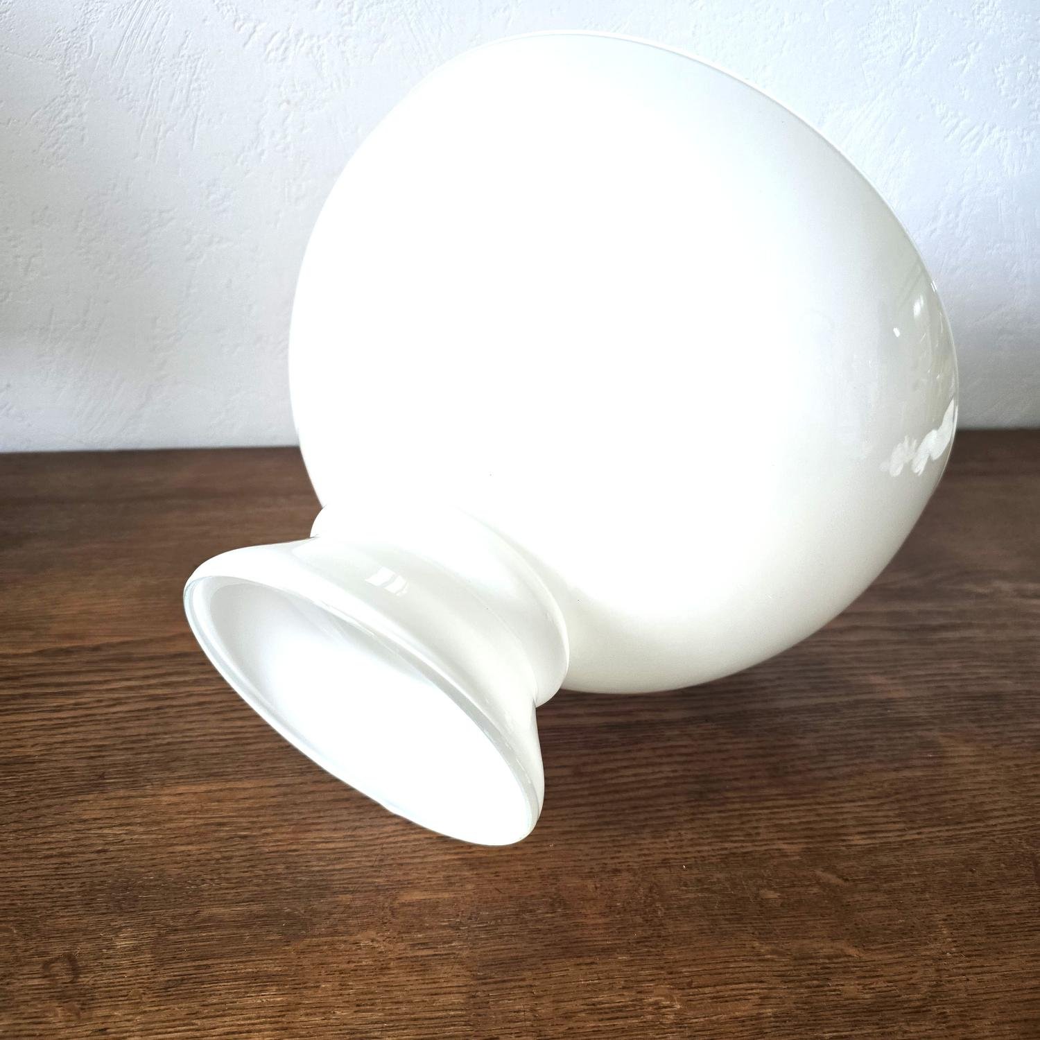 Souvent ébréchés sur les bords, ces globes anciens sont rarement dans un état aussi impeccable. Celui-ci est intact, sans éclat ni fêle — une pièce de choix pour un intérieur au charme discret mais assumé.