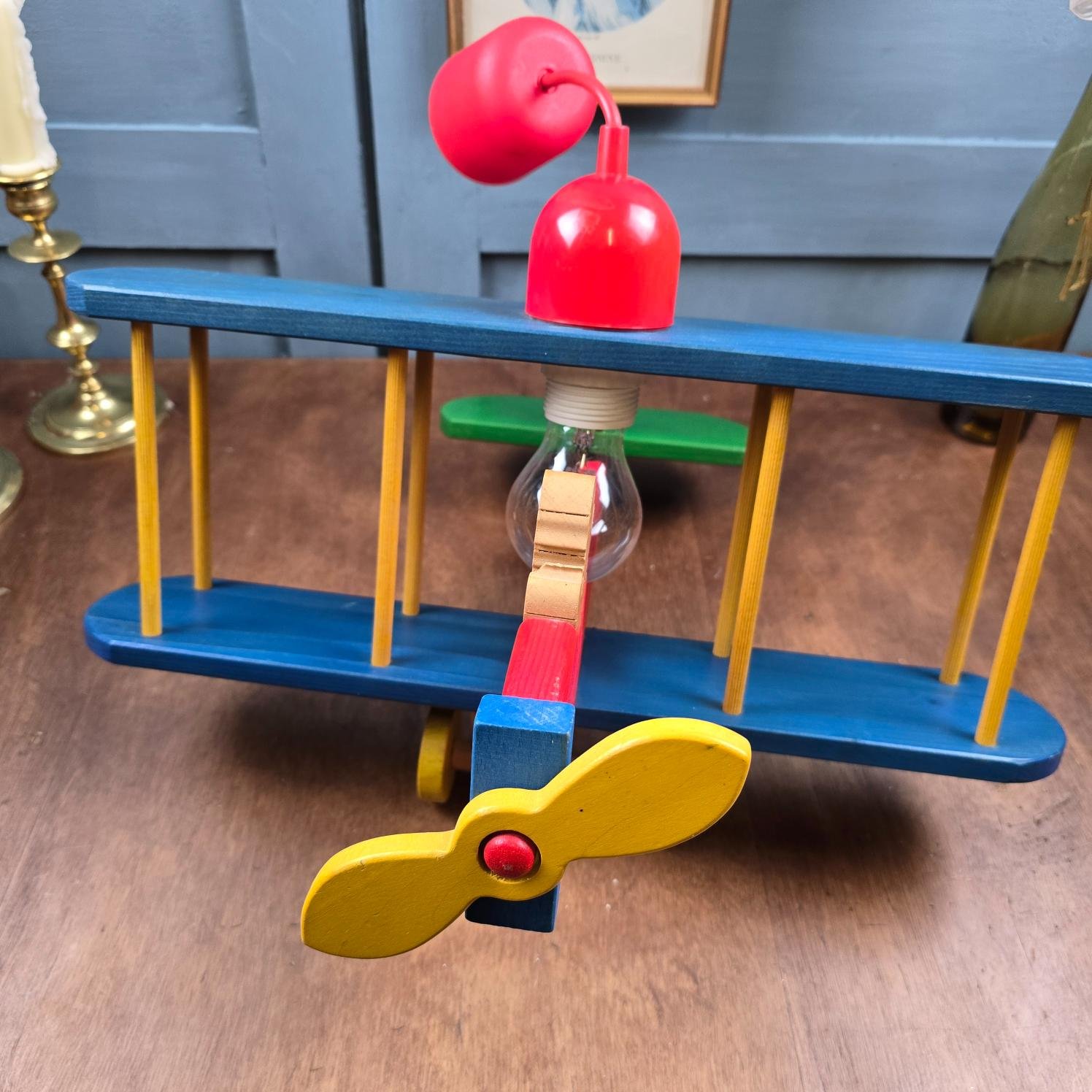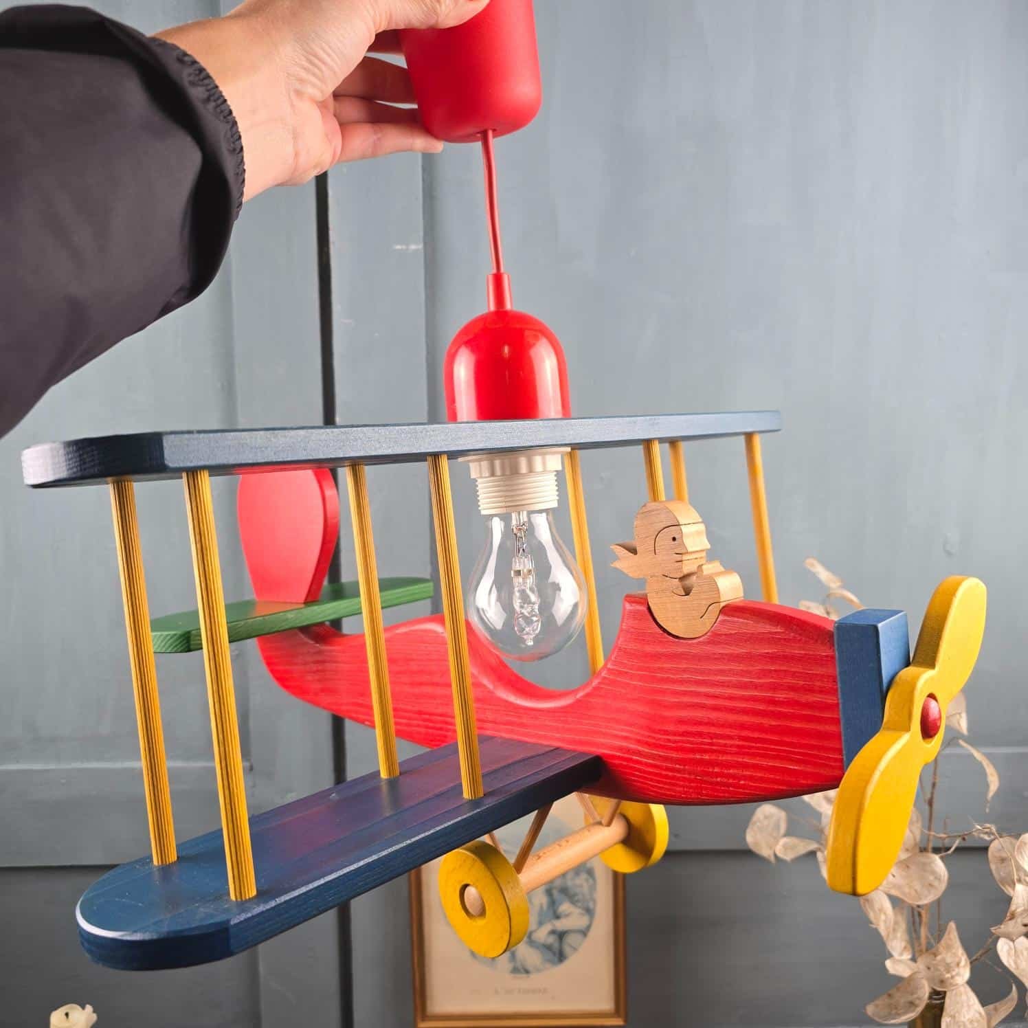 Sous l’aile supérieure, une douille E27 accueille l’ampoule, tandis qu’un petit pilote en bois sculpté semble prêt à décoller vers les rêves.